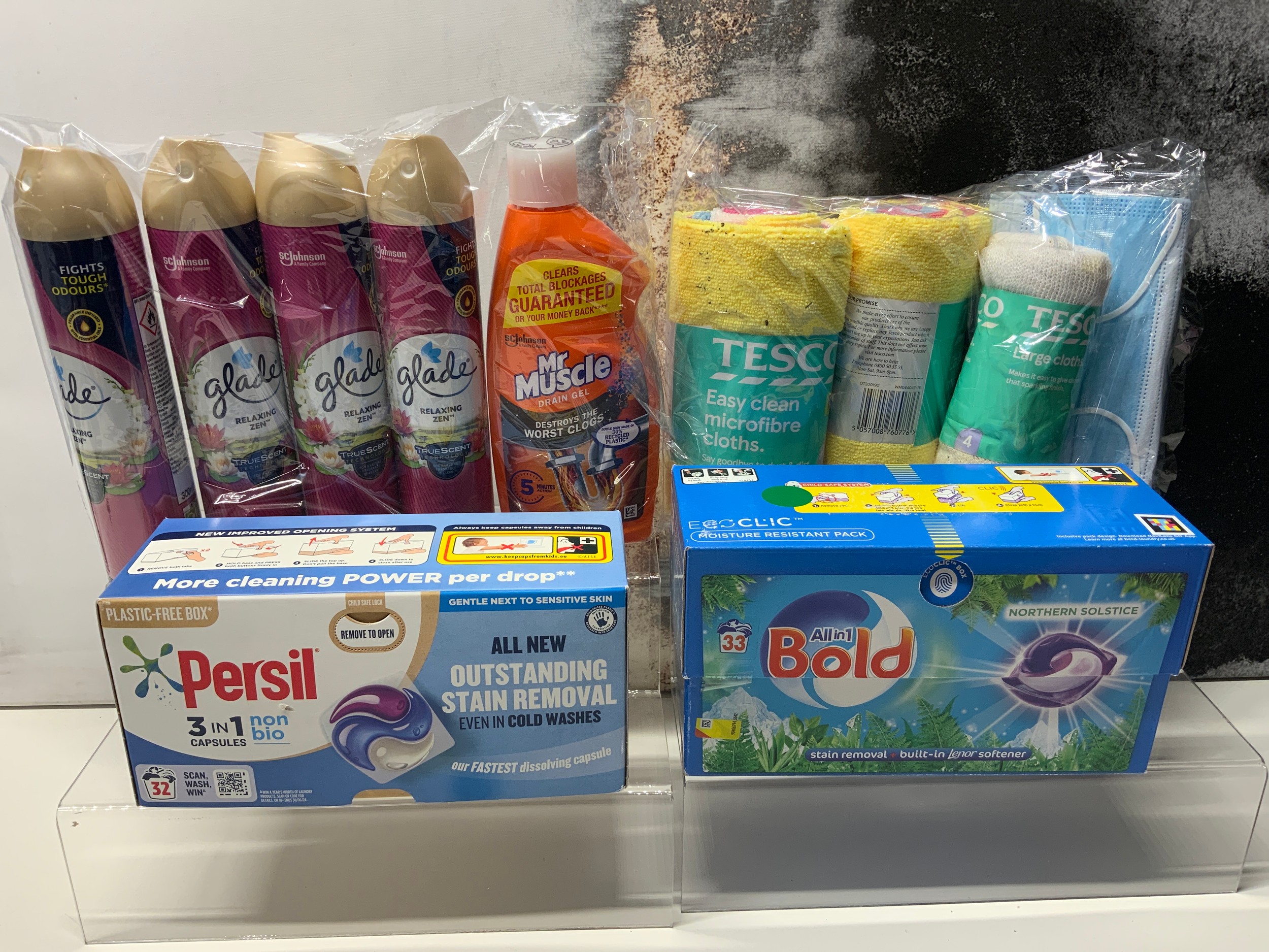 4 X GLADE AIRFRESHNER,PERSIL 3 IN 1 NON BIO 32 CAPSULES,BOLD 3 IN 1 33 WASHES CAPSULES,MR MUSCLE DRAIN UNBLOCKER 500ML,2 PACKS TESCO MICROFIBRE CLOTHS, DISH CLOTHS,2 PACKS OF DISPOSABLE FACE MASKS TOTAL RRP £38( P23078829 / C P24149216 / C )