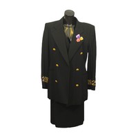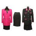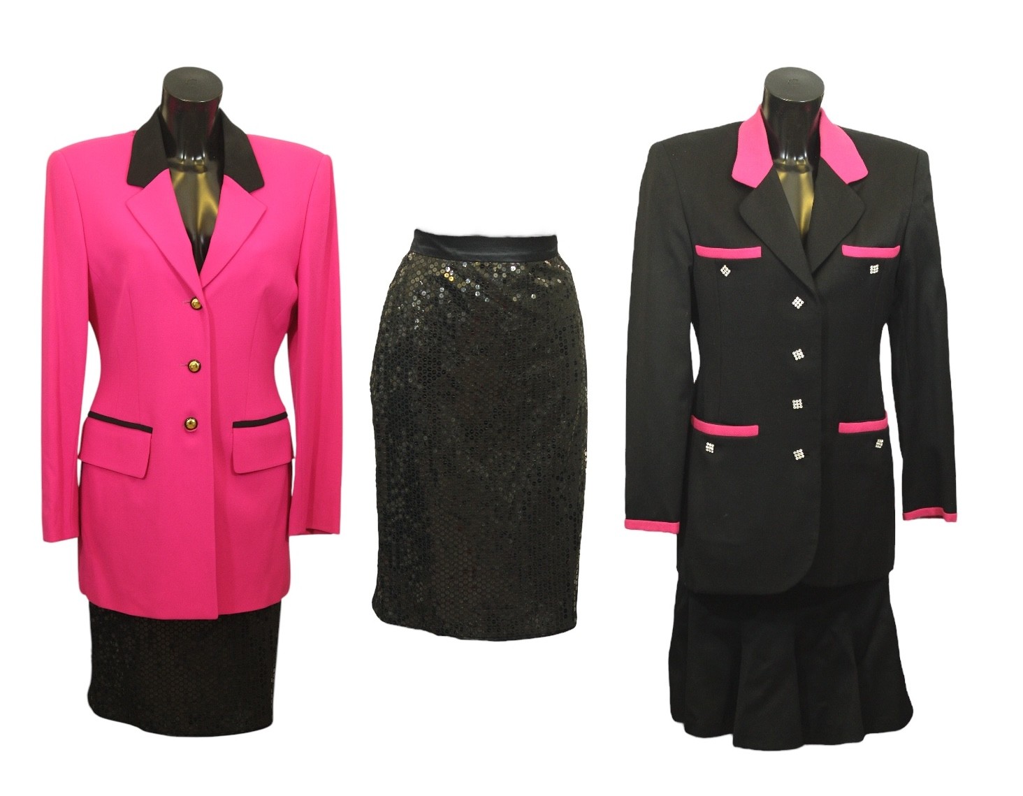 trimmed with black, with gold buttons, size 38; an Escada by Margaretha Ley black sequinned skirt, size 38 together with an unlabelled black wool skirt suit, the jacket trimmed with fuchsia pink with rhinestone buttons (4)