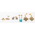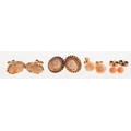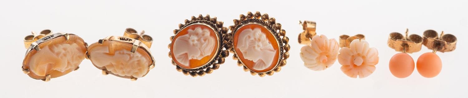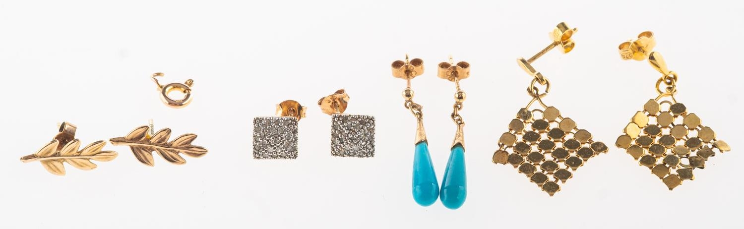 A mixed group of earrings, including a pair of mesh chain link style drop earrings, partial UK import mark 375 to posts, butterflies marked 375, length approx. 3.2cm, 2.3grams; a pair of 9ct gold rope twist cameo stud earrings, posts UK hallmark for 9ct, butterflies marked 9ct, length approx. 1.2cm, 2.5grams; a pair of 9ct gold leaf stud earrings, UK hallmark for 9ct to posts, one butterfly marked 9ct, length approx. 1.6cm, 0.9grams; a pair of square-shaped stud earrings, each set with multiple single-cut diamonds, UK import mark for 375 to posts, butterflies marked 375, 1.5grams; a pair of turquoise drop earrings, posts marked 9ct 375, butterflies marked 9ct, length approx. 2.4cm, 1.3grams; a pair of 9ct gold cameo stud earrings, UK hallmark for 9ct to posts, butterflies marked ster silver, length approx. 1.4cm, 2.0grams; and two pairs of coral studs of varying design, posts marked 375/9ct butterflies marked 375/9ct, total gross weight 1.4grams, (8 pairs).