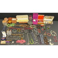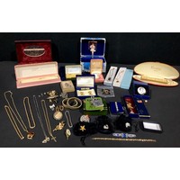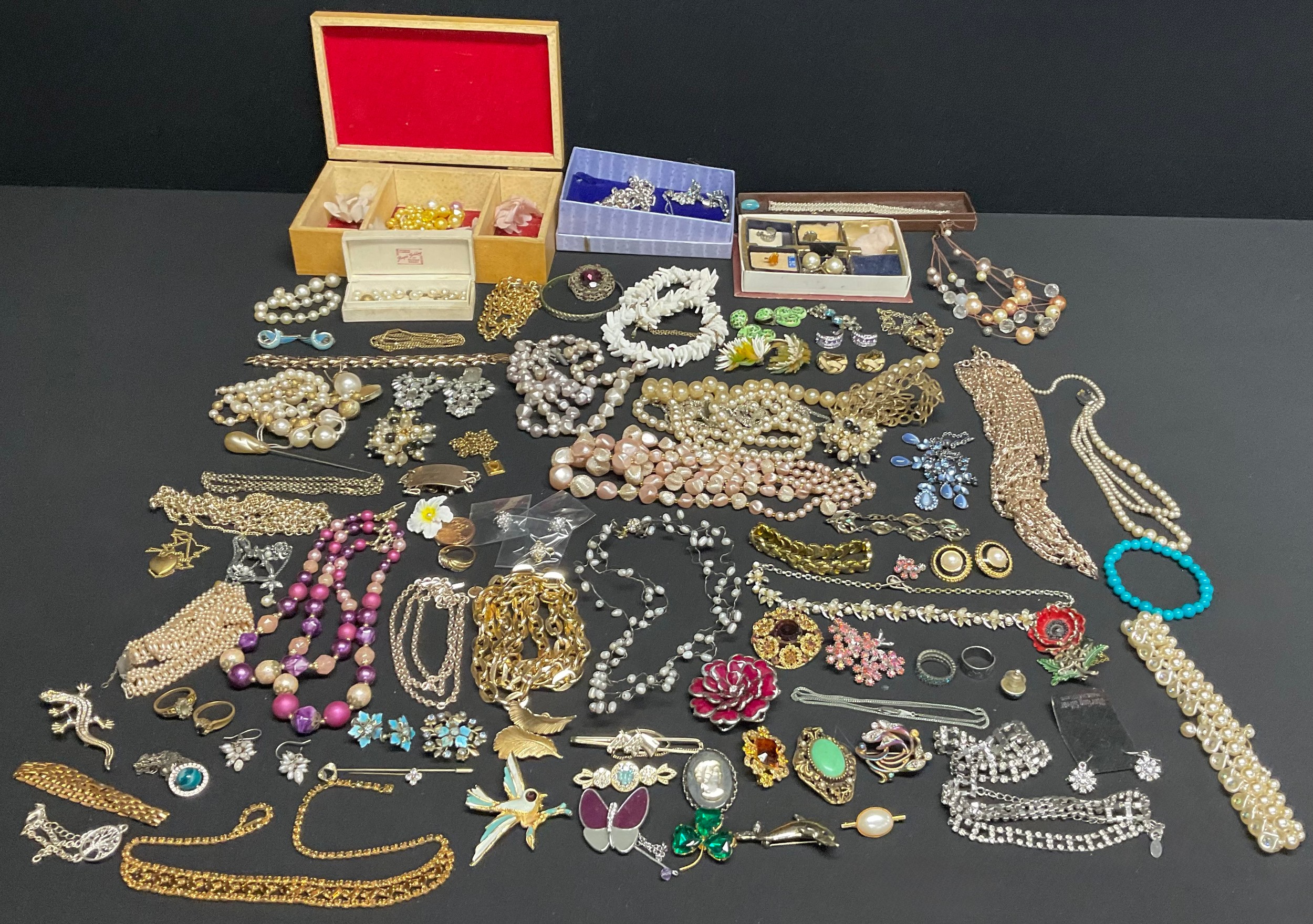 to include thirteen wearable costume brooches a vintage Stratton two horses design tie clip, costume necklaces and bracelets and a pair of vintage signed Giovanni leaf design gold tone clip on earrings, a/f