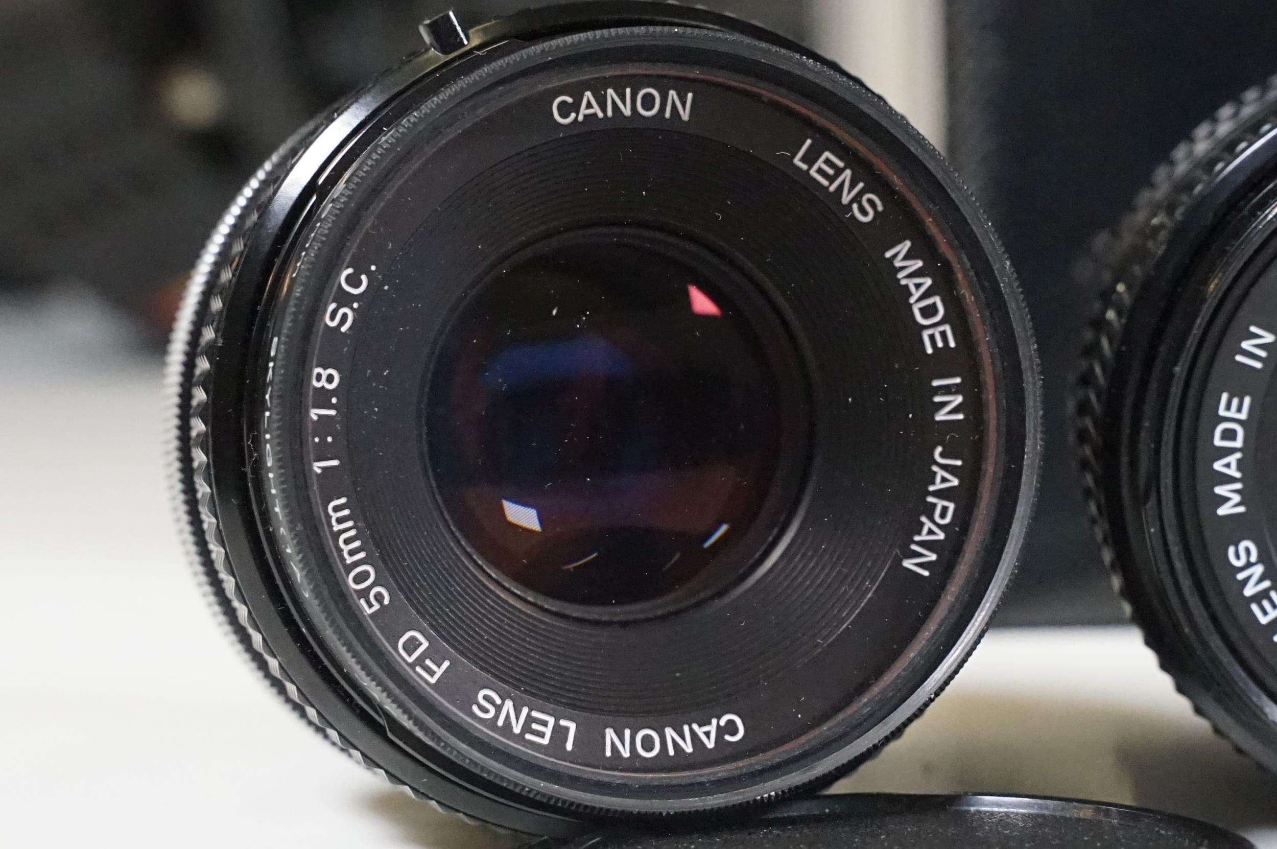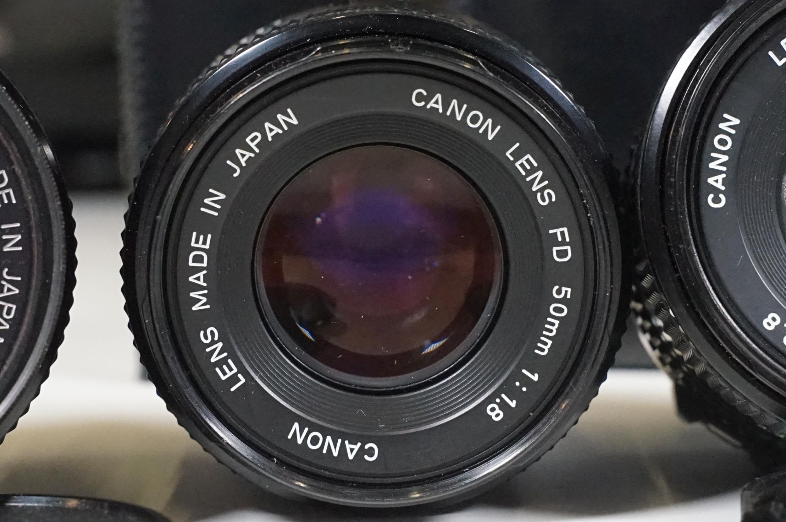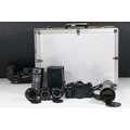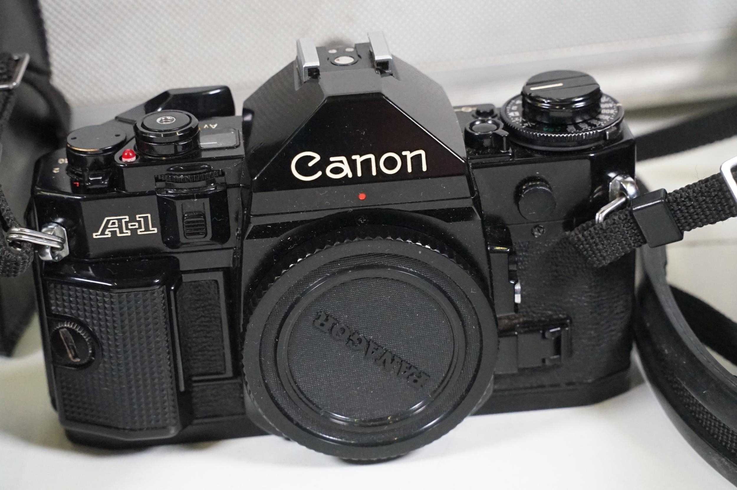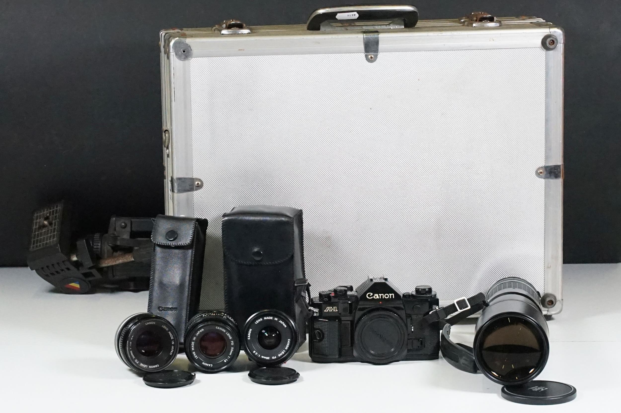Collection of cameras, lenses and equipment contained within a padded case to include Canon A-1 35mm SLR camera, Sigma Super-Tele Multi-Coated, Canon Speedlite 199A, Canon Power Winder A, Canon Lens FD 50mm f/1.8, etc, plus a Prisma tripod stand
