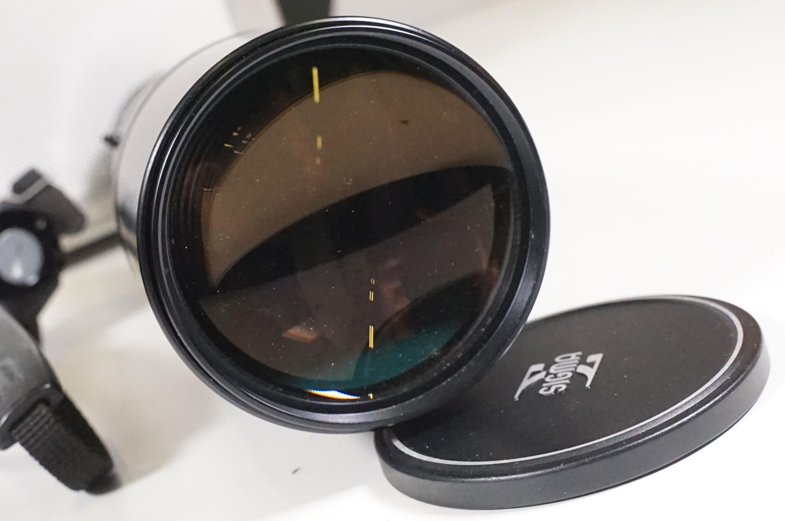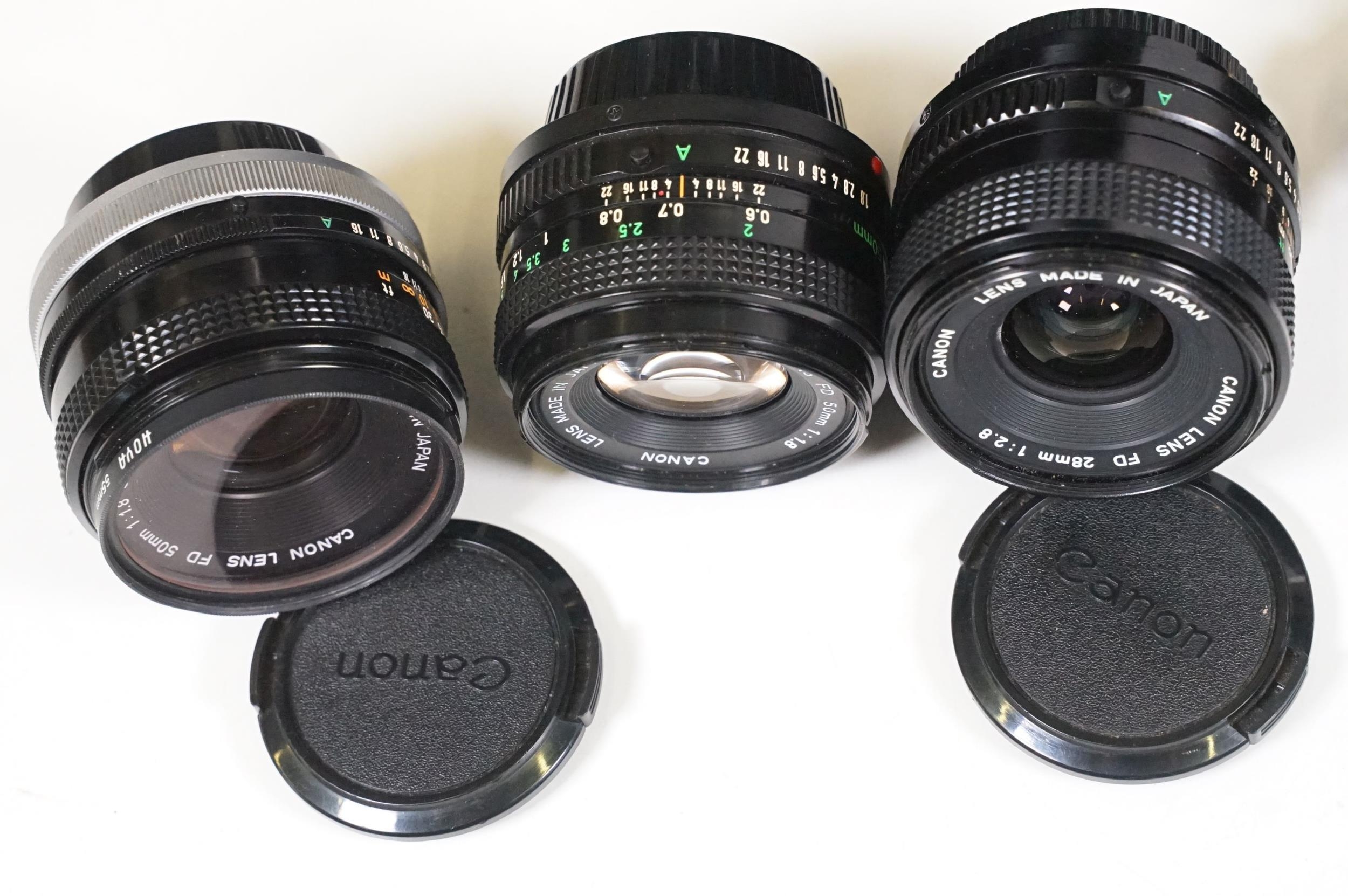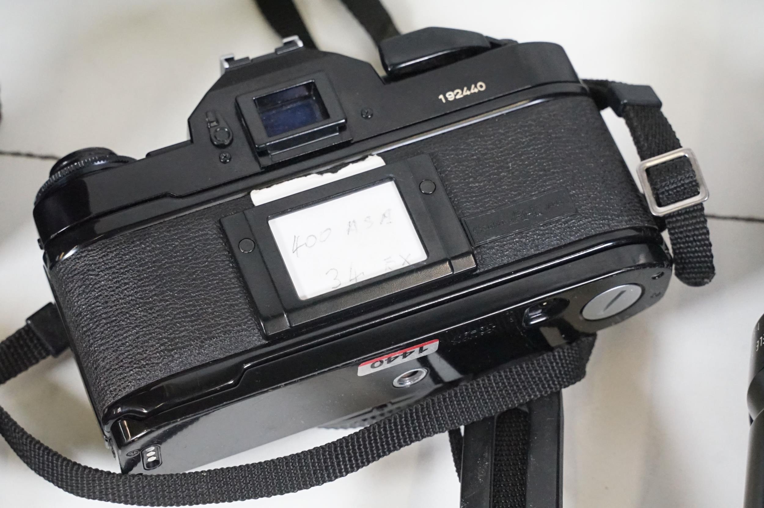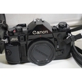 Collection of cameras, lenses and equipment contained within a padded case to include Canon A-1 35mm SLR camera, Sigma Super-Tele Multi-Coated, Canon Speedlite 199A, Canon Power Winder A, Canon Lens FD 50mm f/1.8, etc, plus a Prisma tripod stand