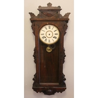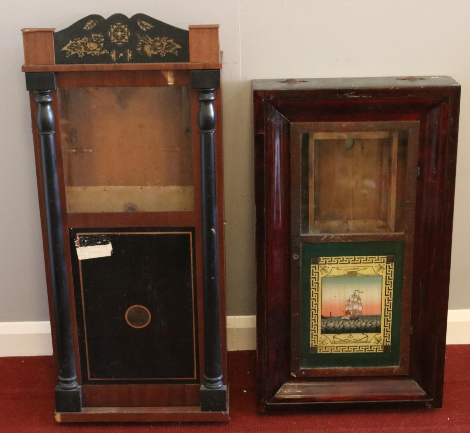 Two mahogany cased American style wall clock cases. With coloured glass panels.