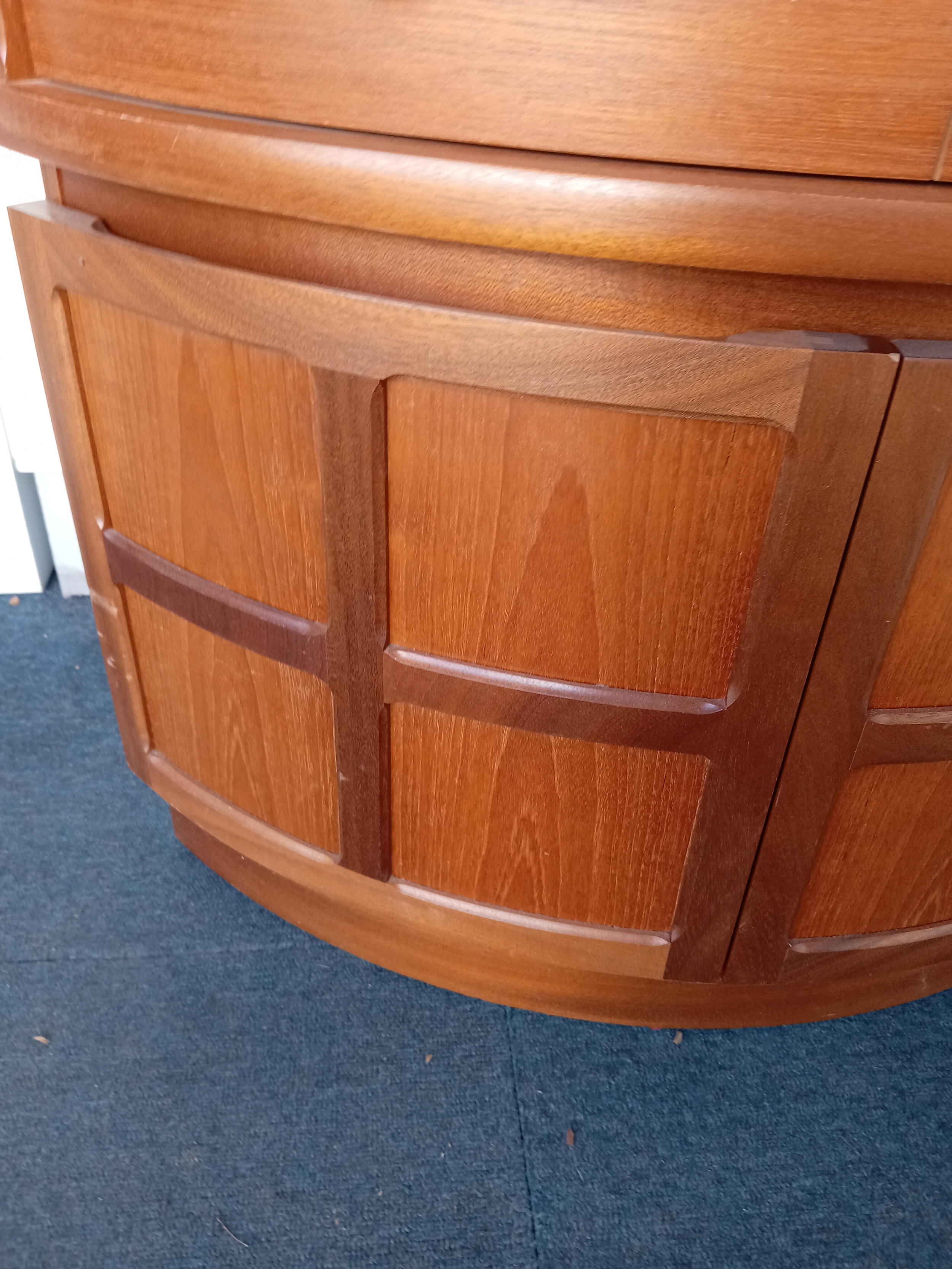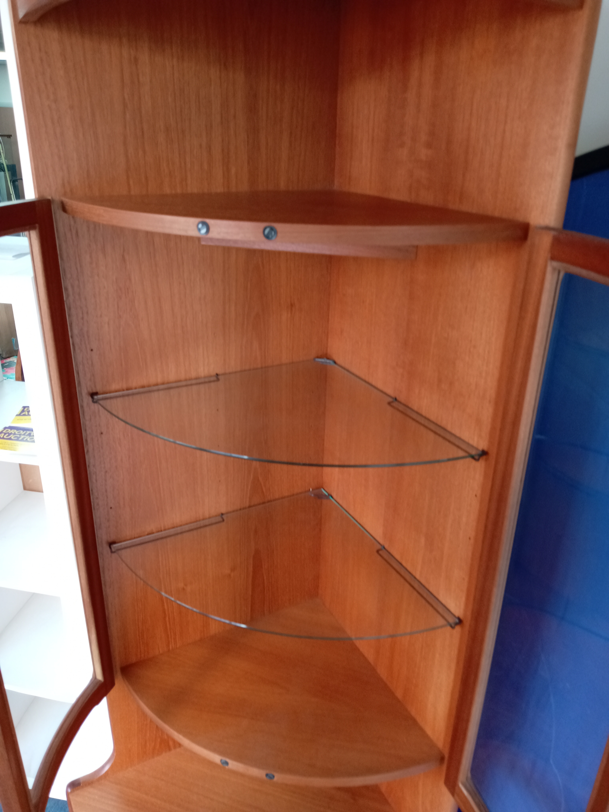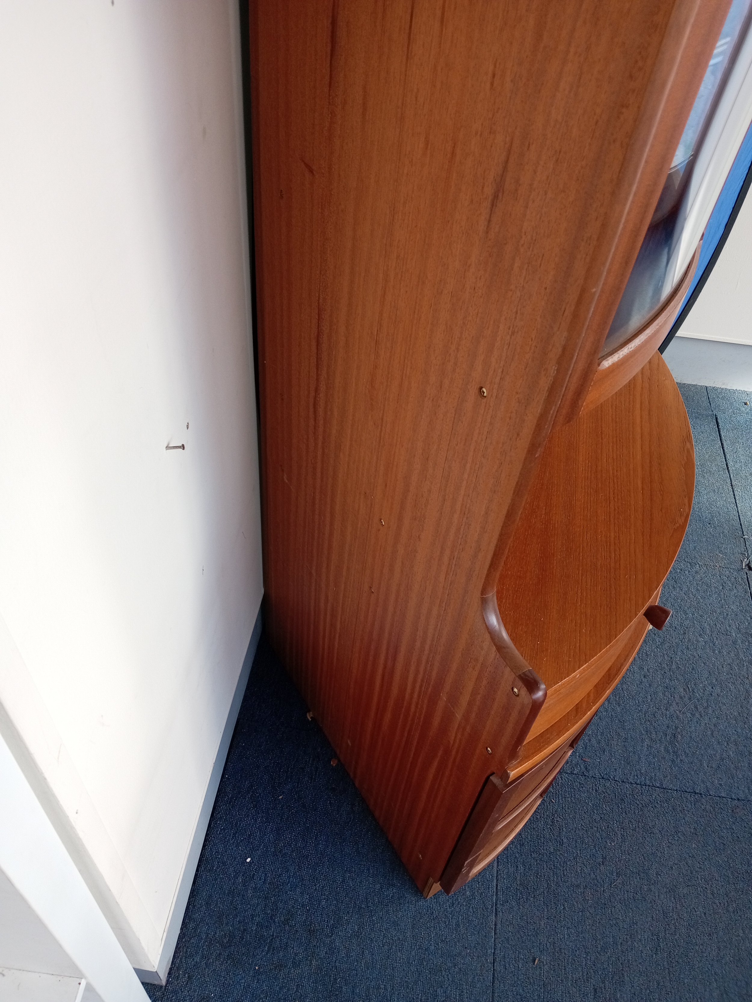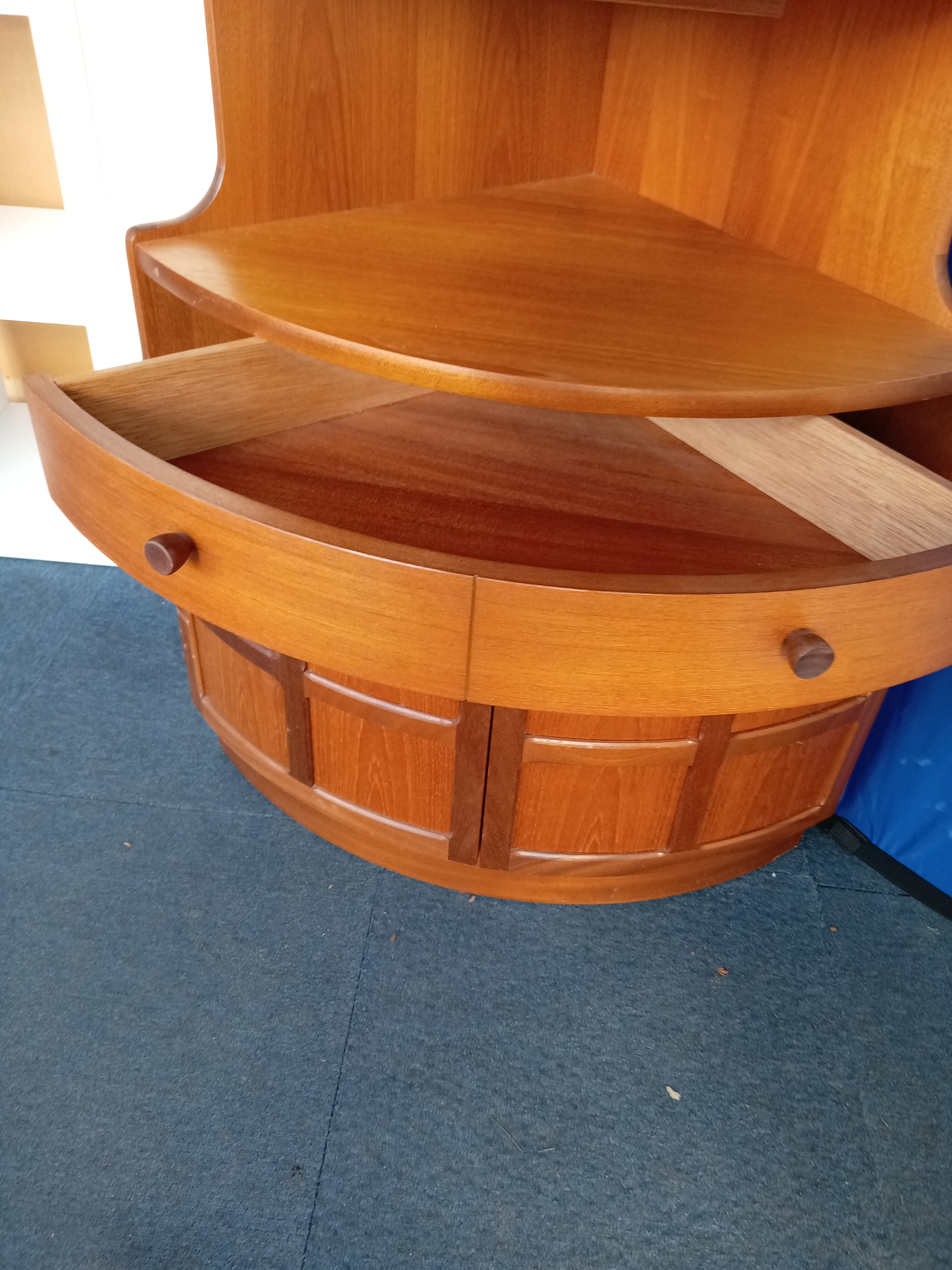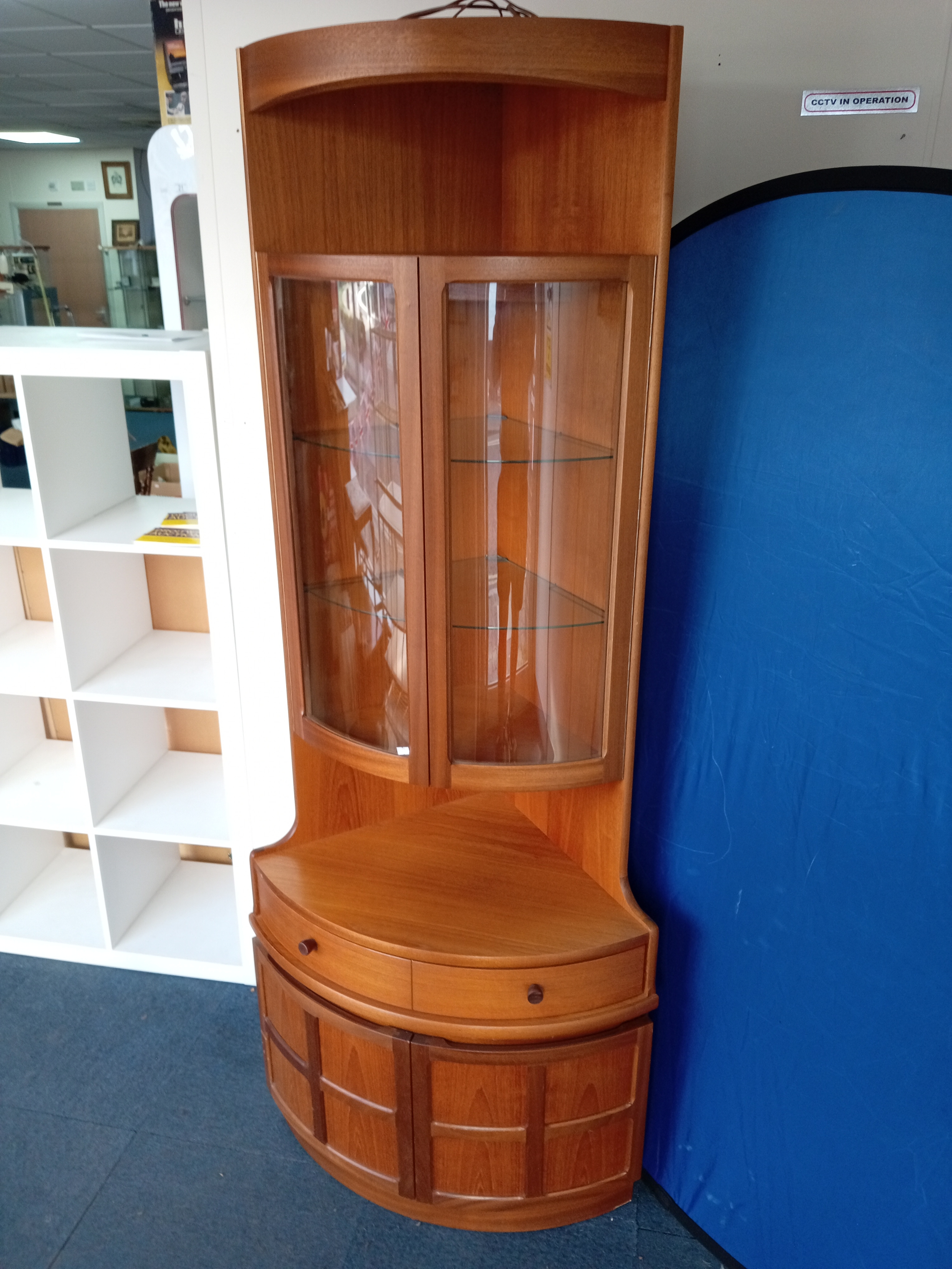 A mid century Modern MCM teak Parker Knoll Nathan Corner display cabinet. Measures H 194cm x D 44cm x L 75cm.
