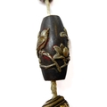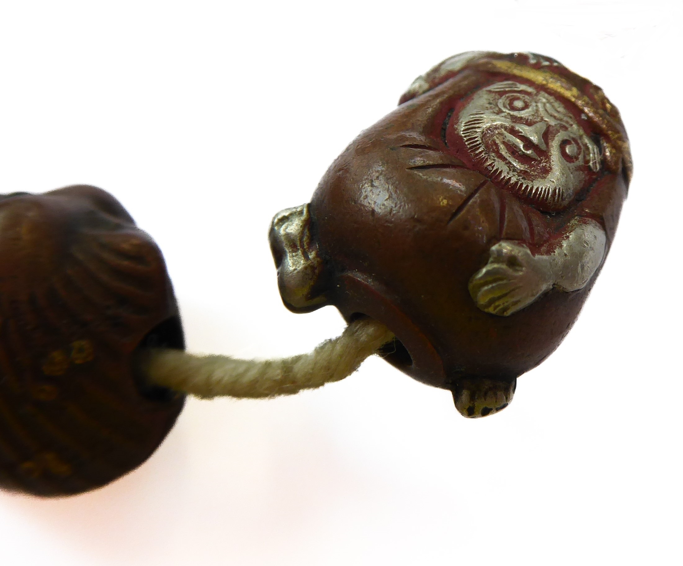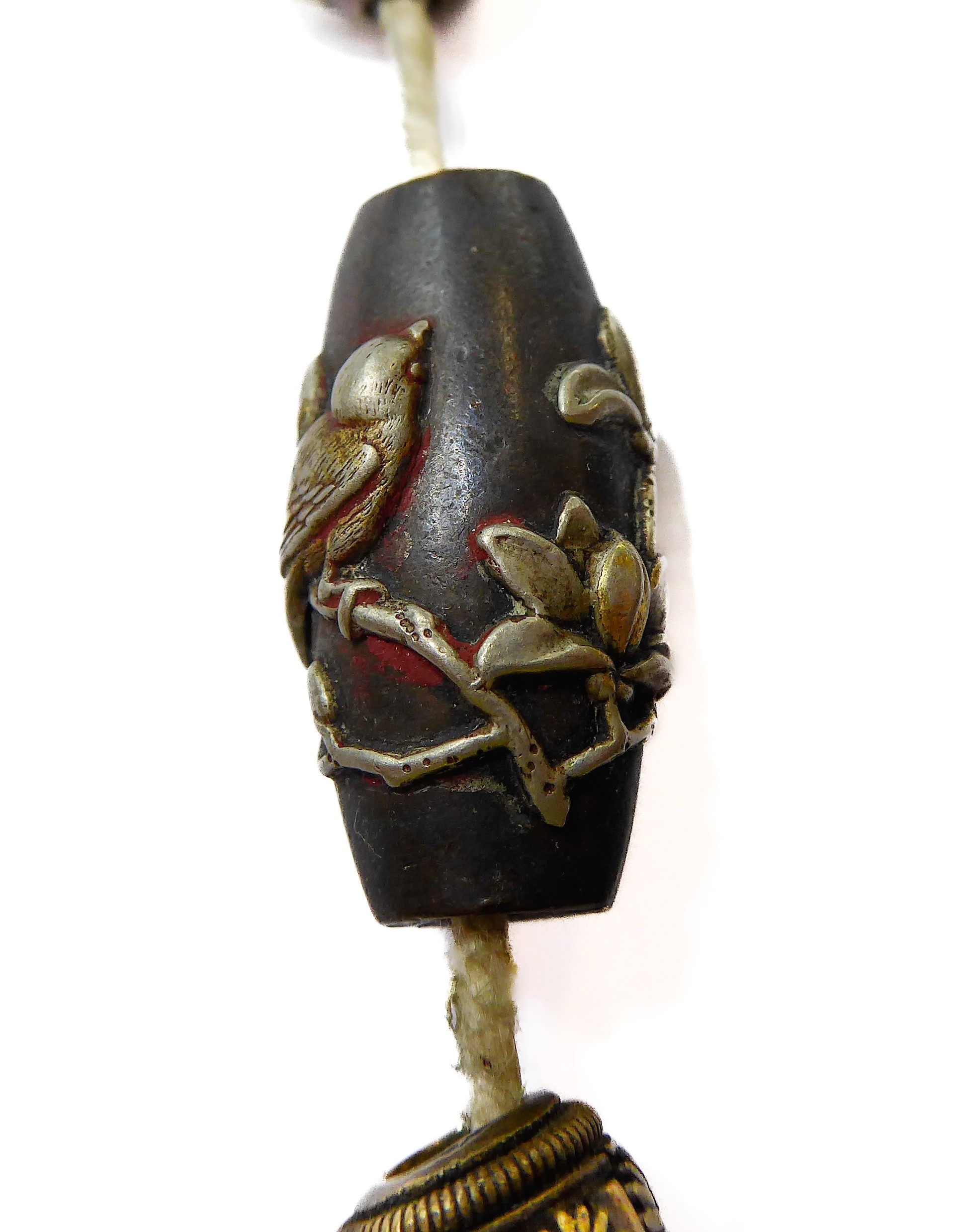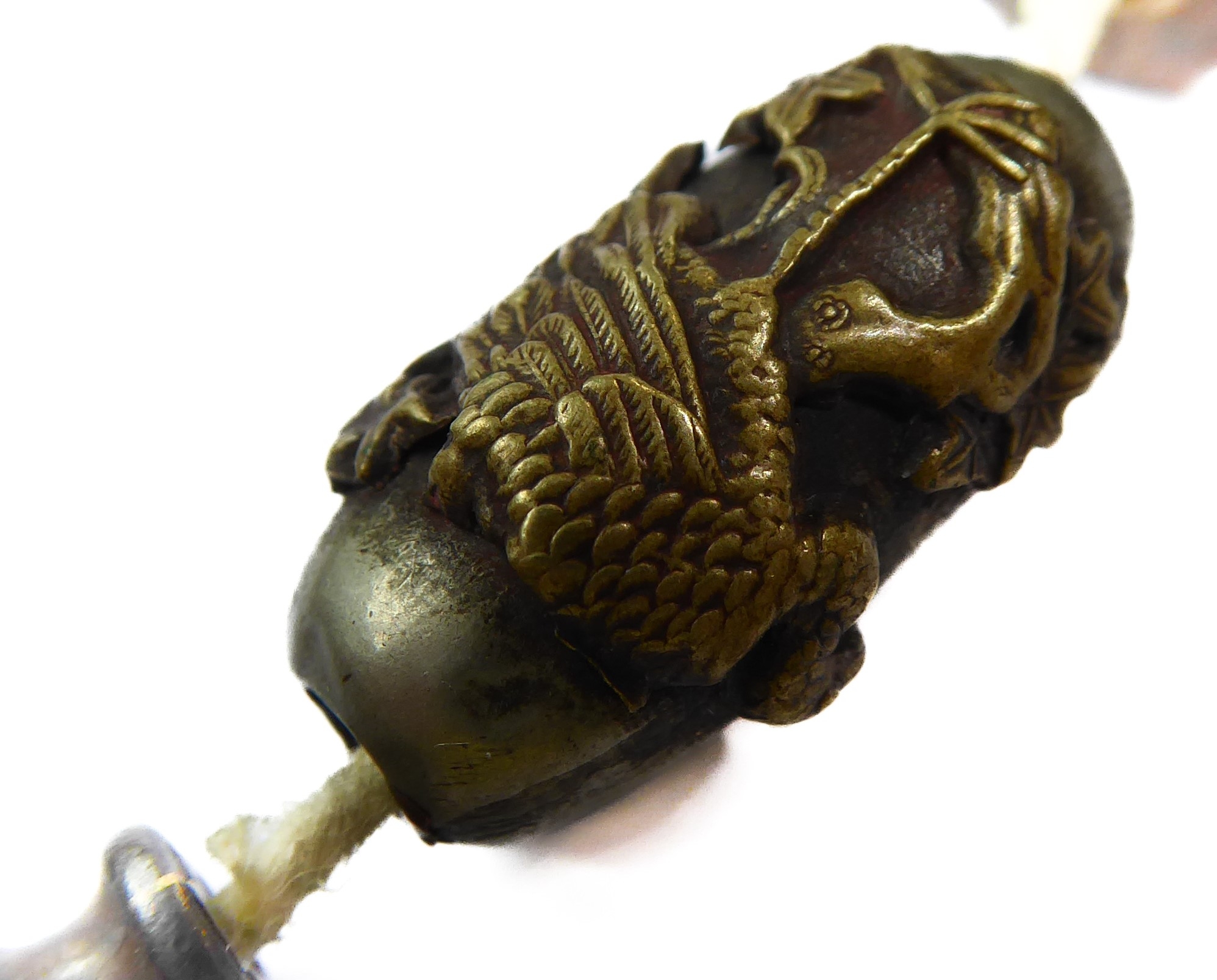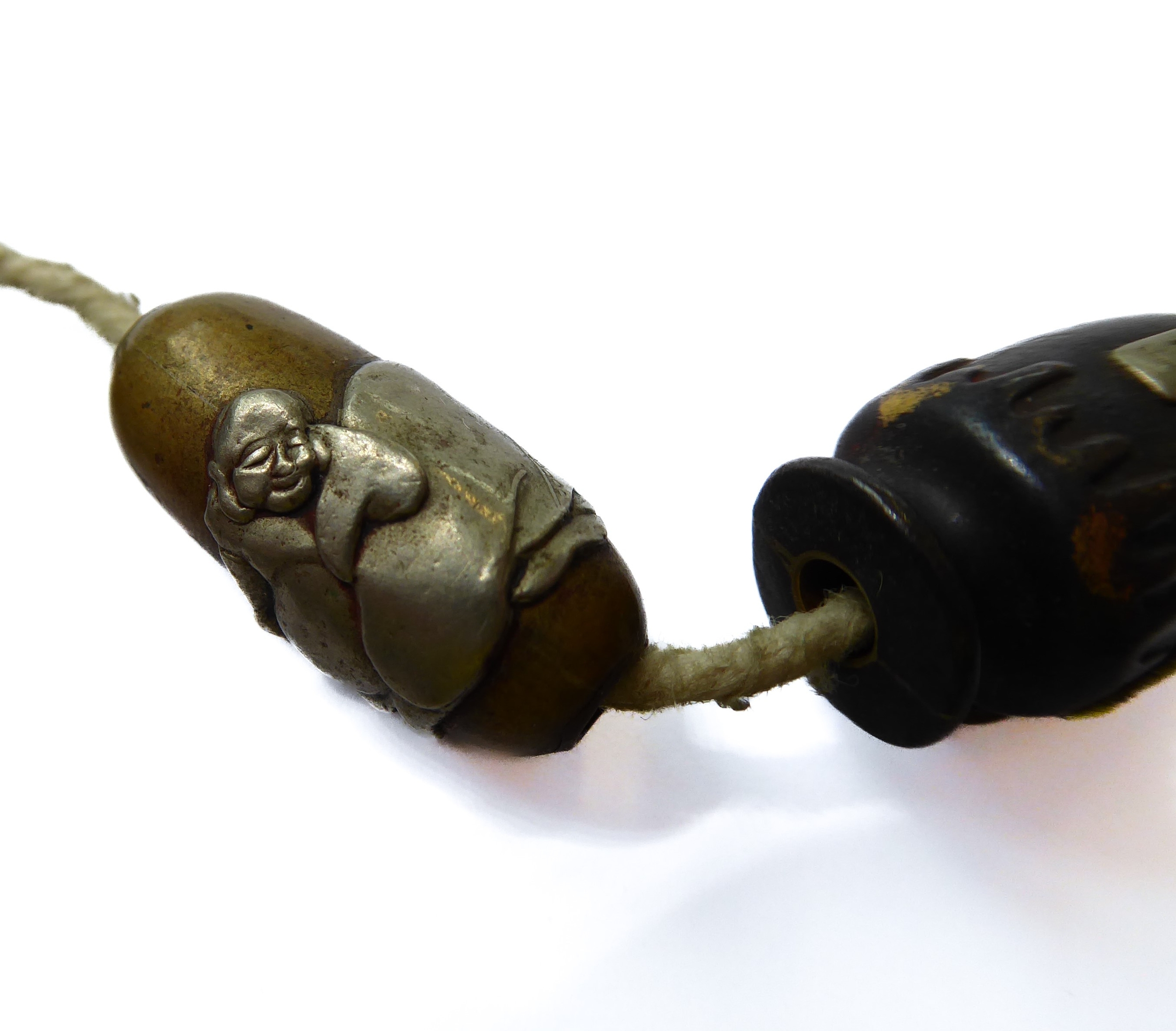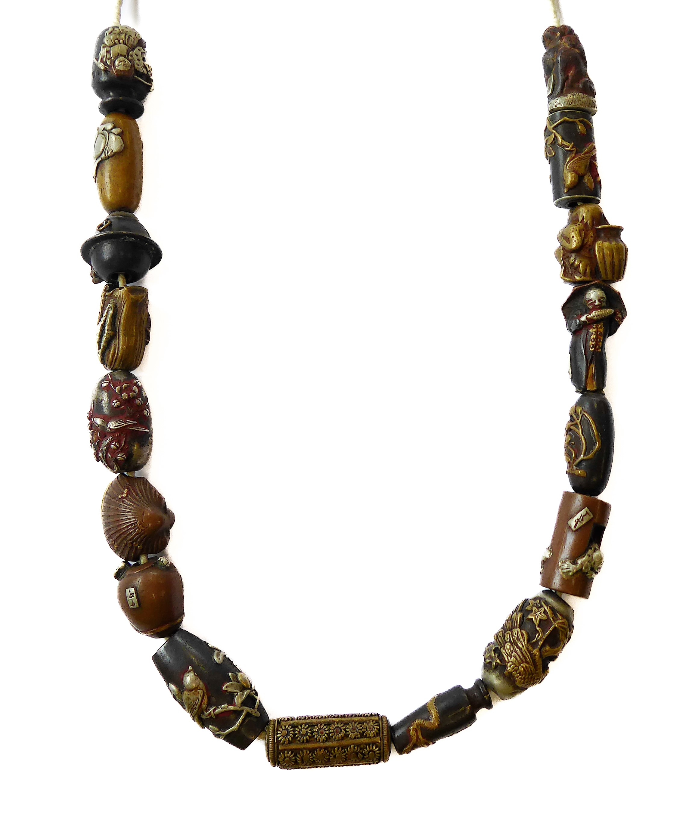 A re-strung Japanese necklace made from various metals (probably 19th century) varying shaped beads with different decoration, some beads signed on tablets in relief