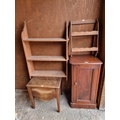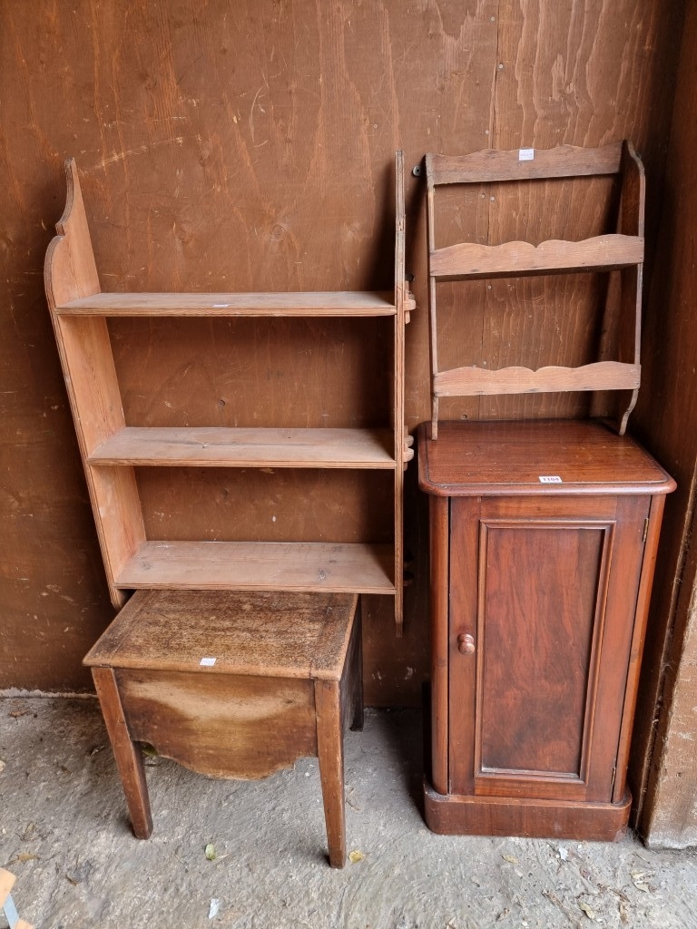 A sundry group of furniture, comprising: a Victorian mahogany bedside cupboard, 39cm wide, (s.d.); a 19th century mahogany commode stool; and two antique pine hanging open shelves, largest 63cm wide. (4)