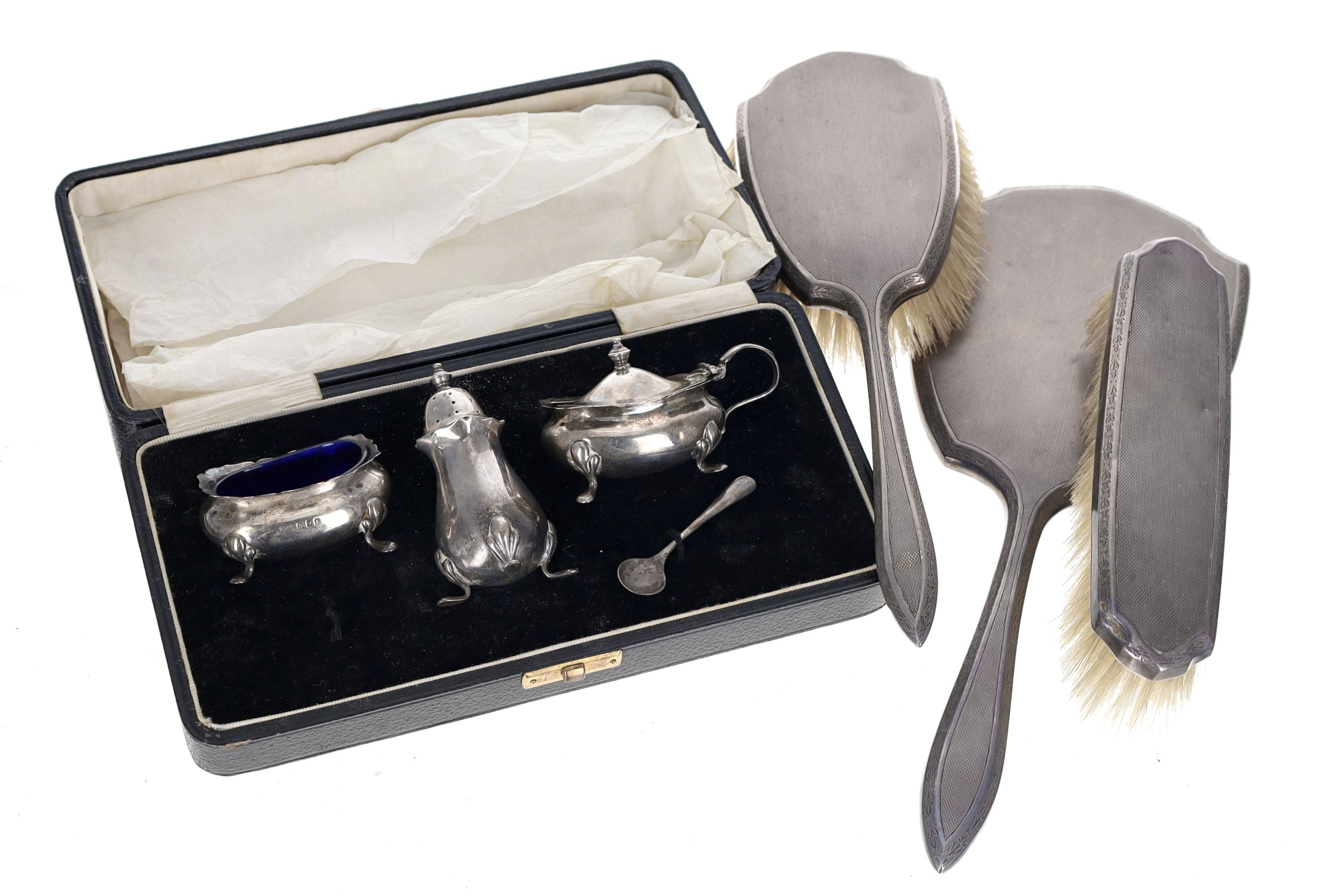 George V silver cruet trio, comprising pepperette, open salt with blue glass liner, and mustard with hinged cover enclosing a blue glass liner, maker RR possibly Robert Rutland, London 1934, with an unrelated silver spoon, 3.2oz t total; also with a silver dressing table brushes and hand mirror trio by Mappin & Webb
