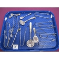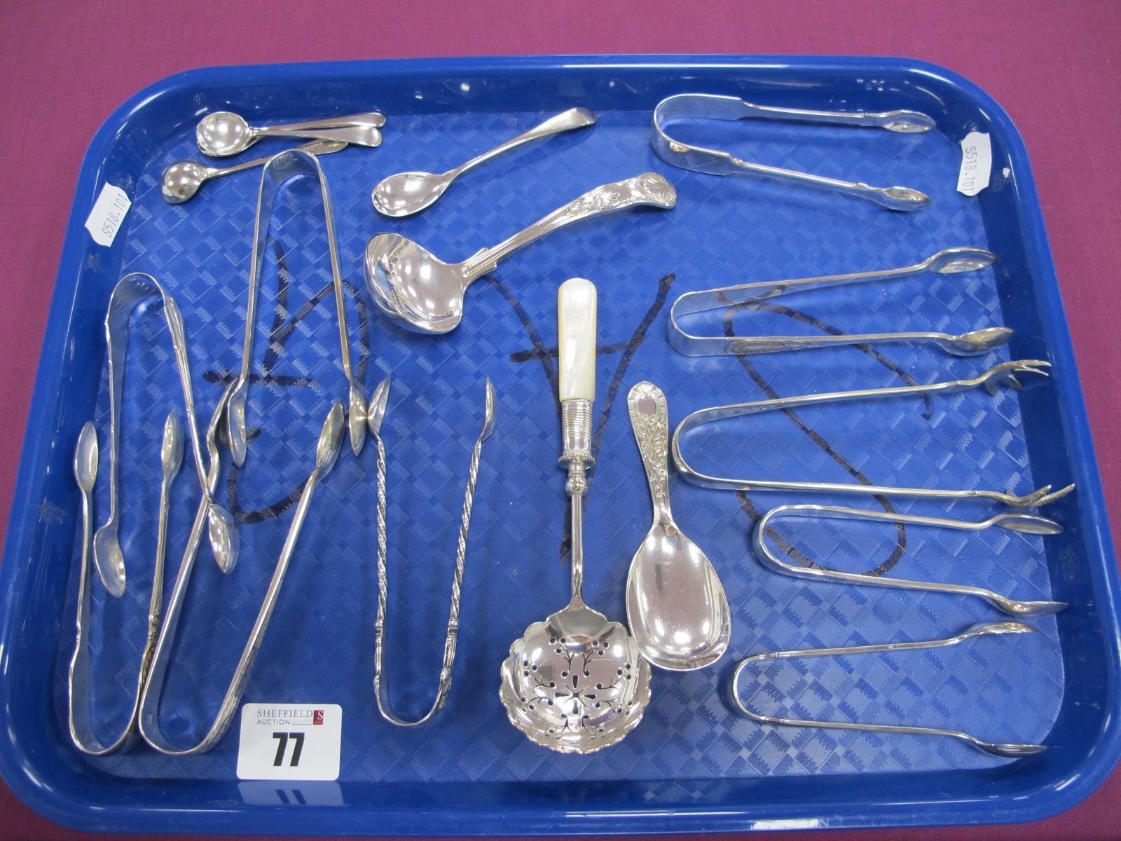 A Collection of Assorted Hallmarked Silver and Plated Sugar Tongs, together with a mother of pearl handled sifter spoon, a caddy spoon, salt spoons etc.