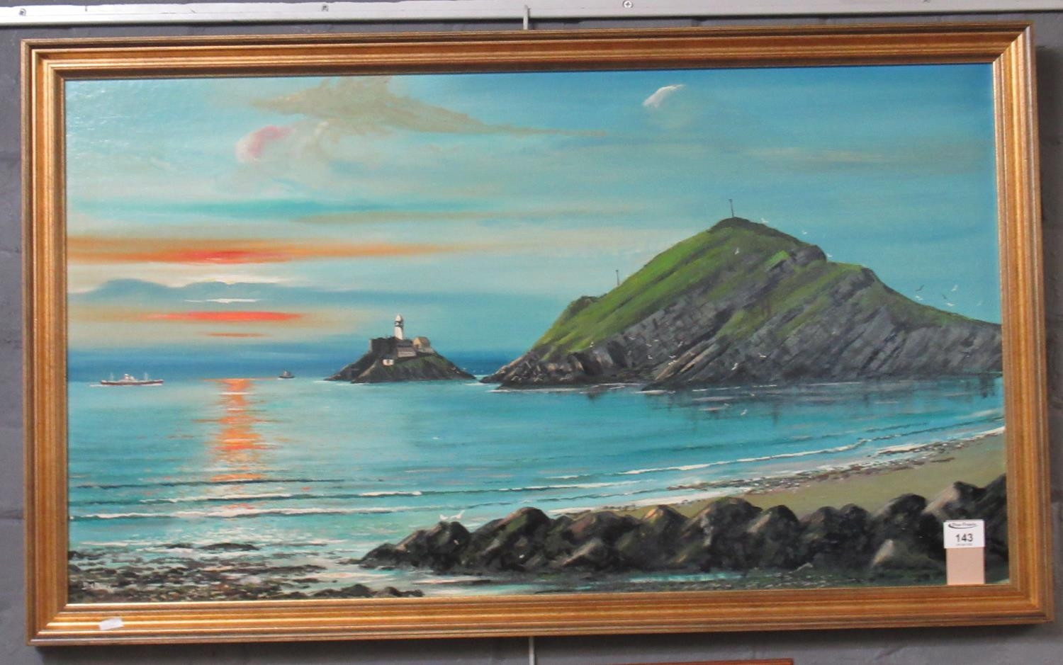 B V Parkyn, Mumbles lighthouse on a calm day. Oils on board, signed. Framed. 52 x 89cm approx.