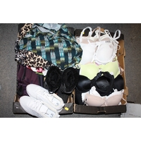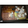 A TRAY OF CERAMICS AND GLASSWARE TO INCLUDE COALPORT COTTAGE FIGURES AND GLASS DRESSING TABLE ITEMS