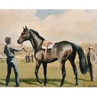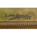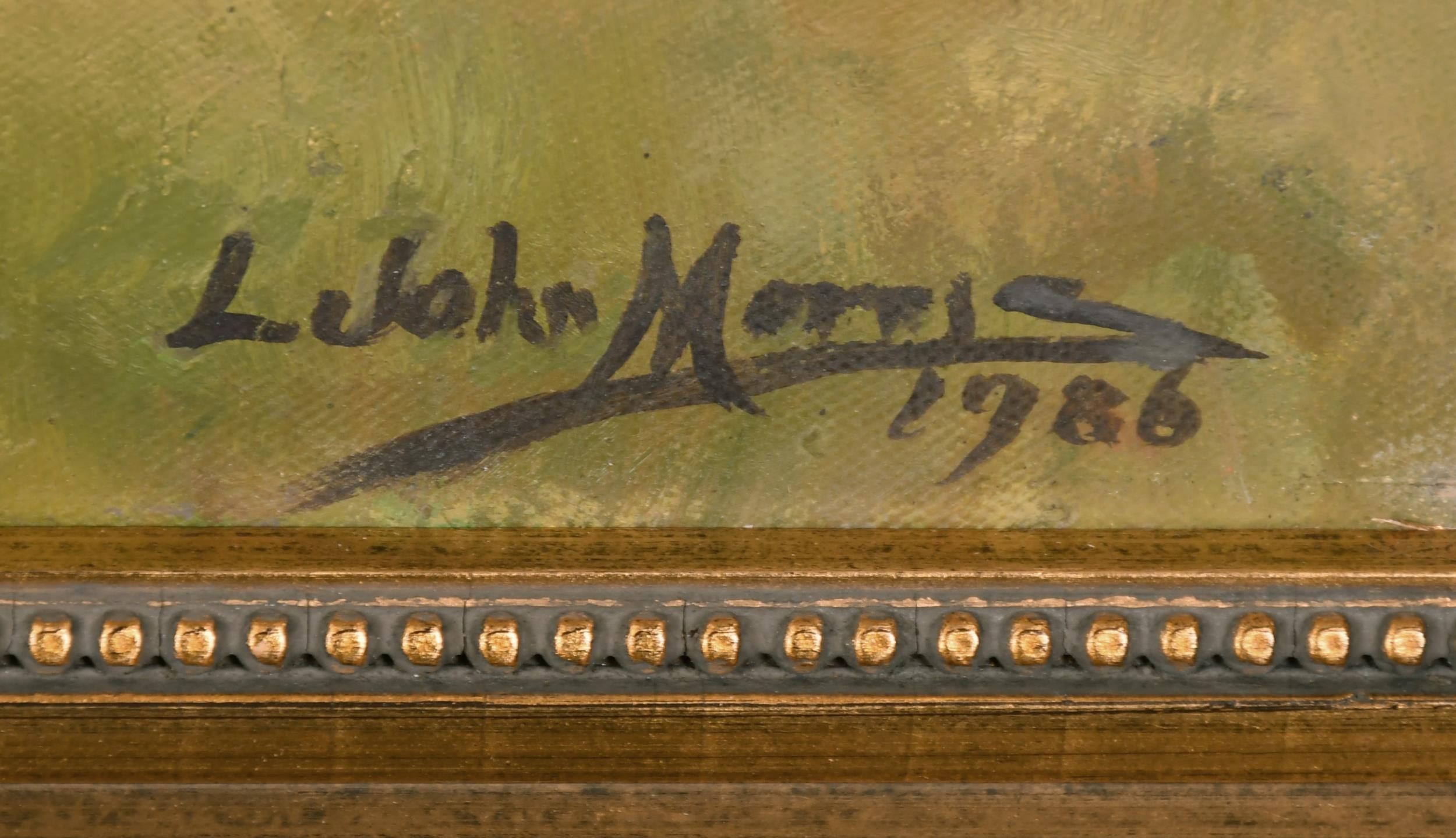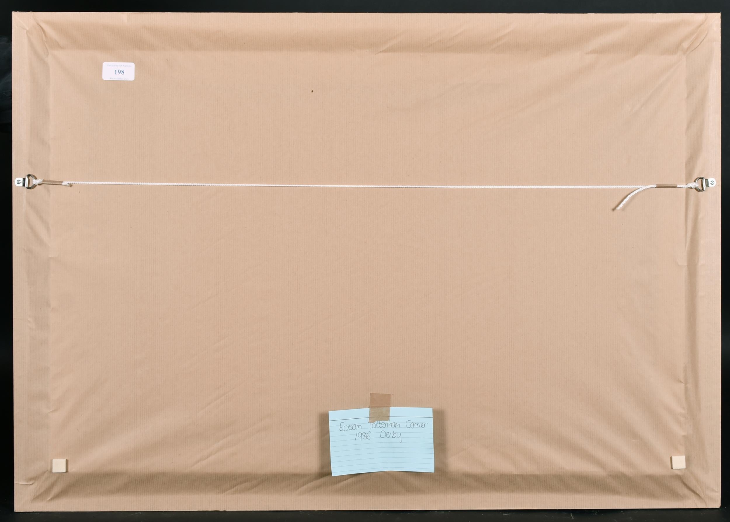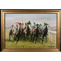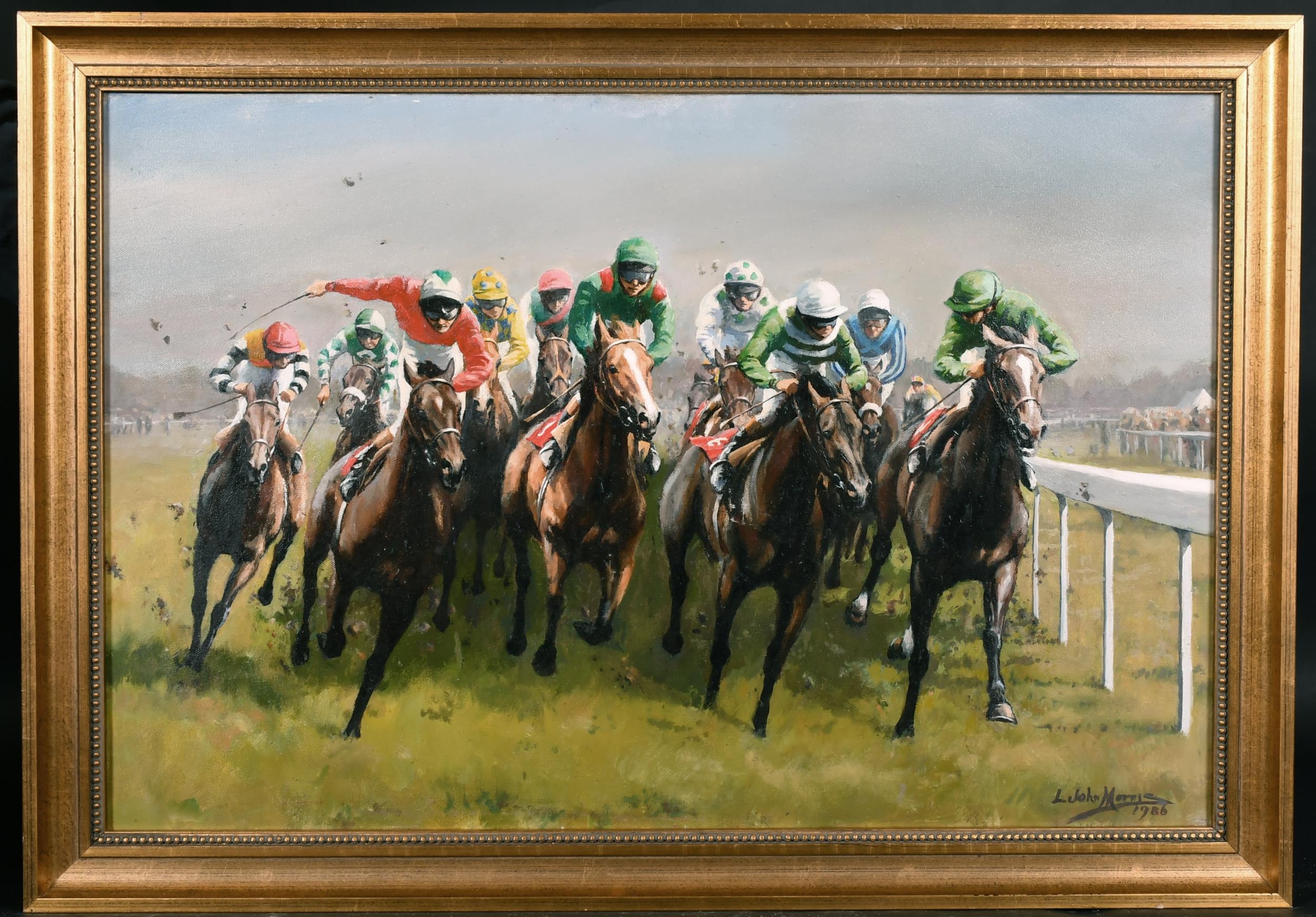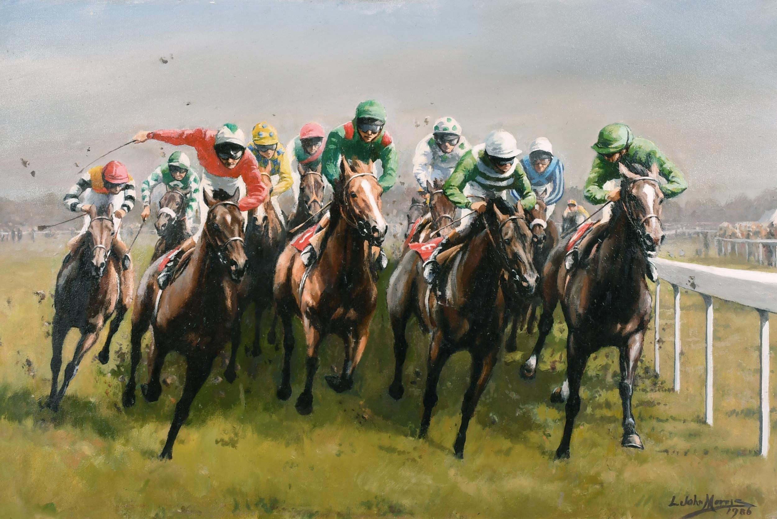 Lionel John Morris (20th Century) British. "Tattenham Corner", Oil on Canvas, Signed and Dated 1986, 20" x 30" (50.8 x 76.2cm). Notes: 1986 Epsom Derby "Tattenham Corner" winner Shahrastani, 2nd Dancing Brave. This image was used for the Injured Jockey's Fund Christmas Card
