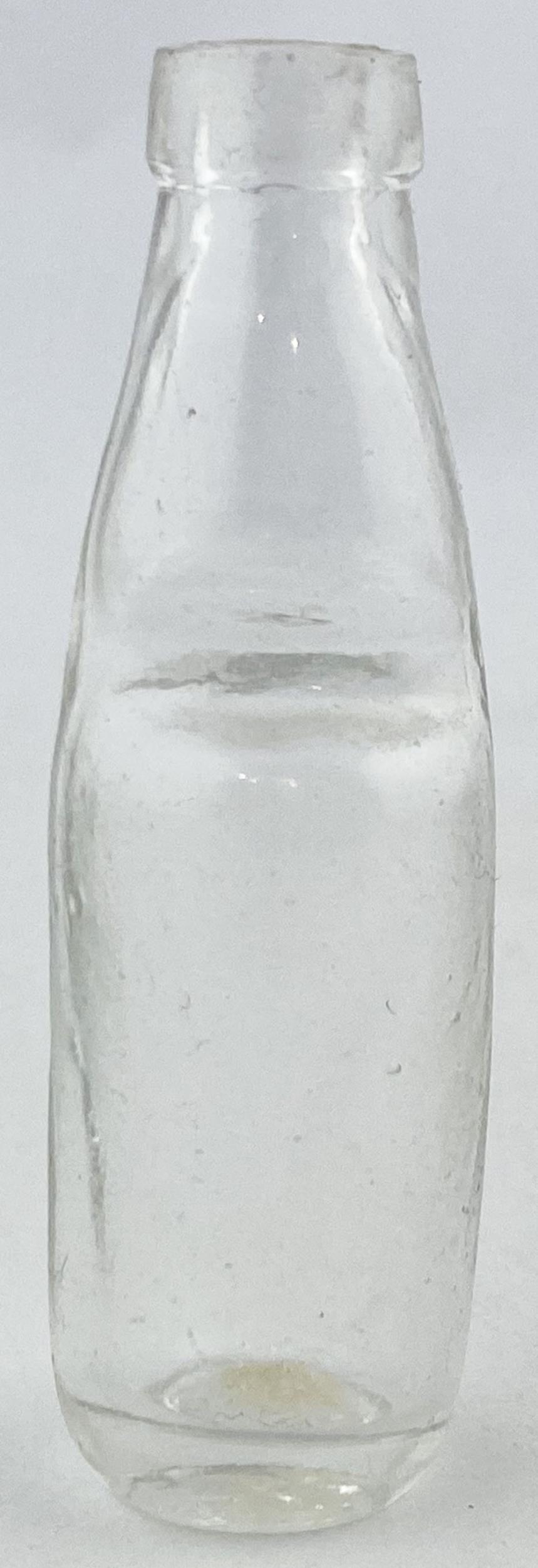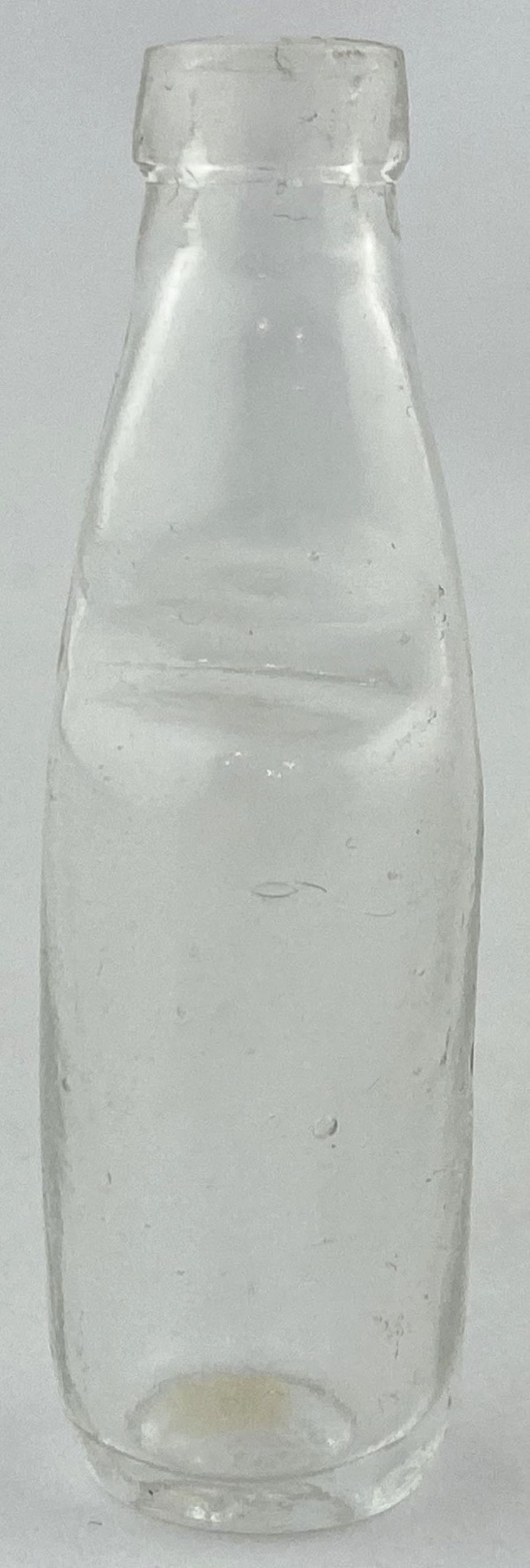 MINIATURE CODD BOTTLE. 65mms tall. Clear glass mini codd bottle shape, no marble. Actually a cure product container - for flatulence! No damages.