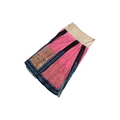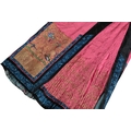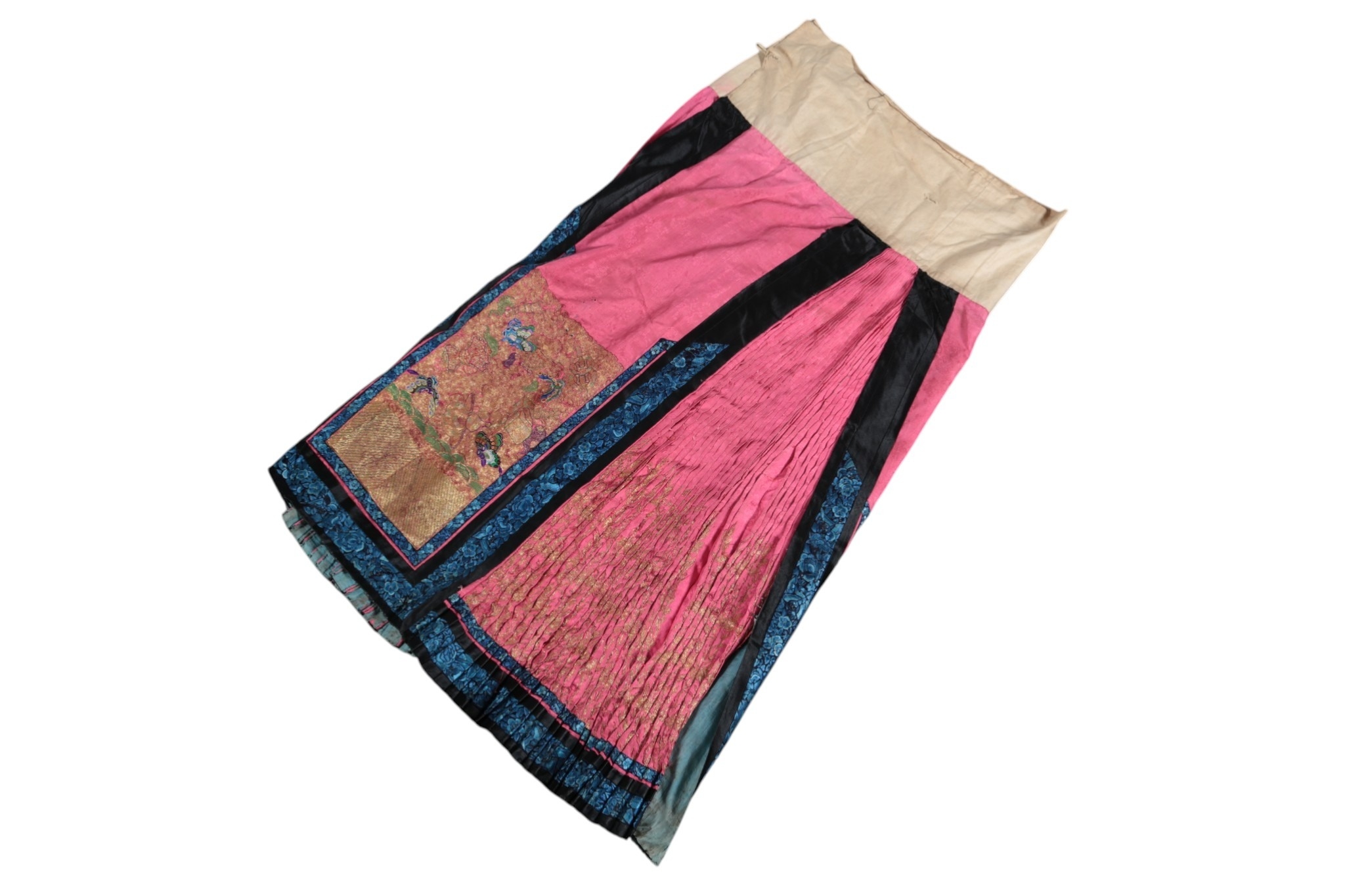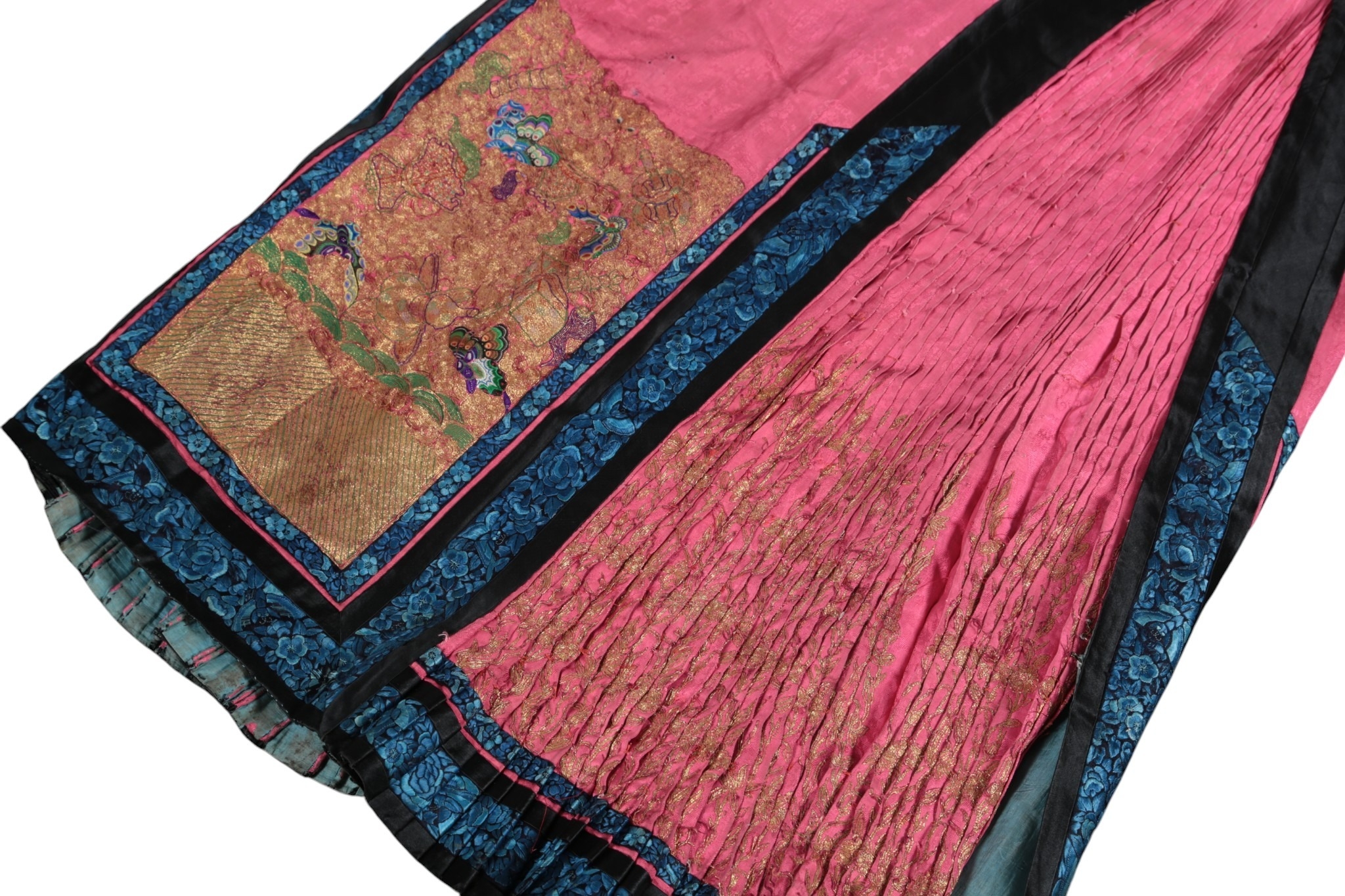 A 19th century Chinese ladies pink silk damask embroidered wedding skirt, the front panels embroidered mostly in gold thread with auspicious symbols and ornate coloured butterflies. The back pleats are part embroidered with gold thread. The skirt is bordered with blue embroidered black silk, 100cm long.