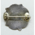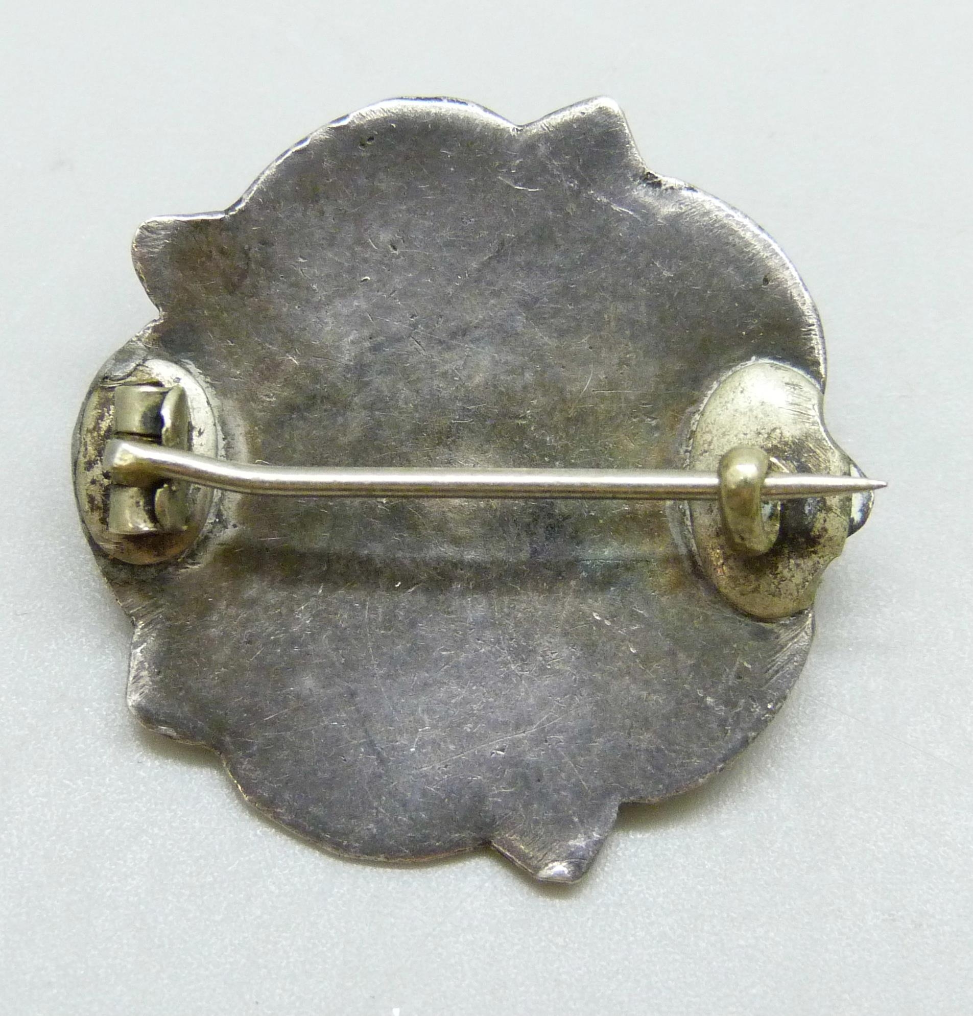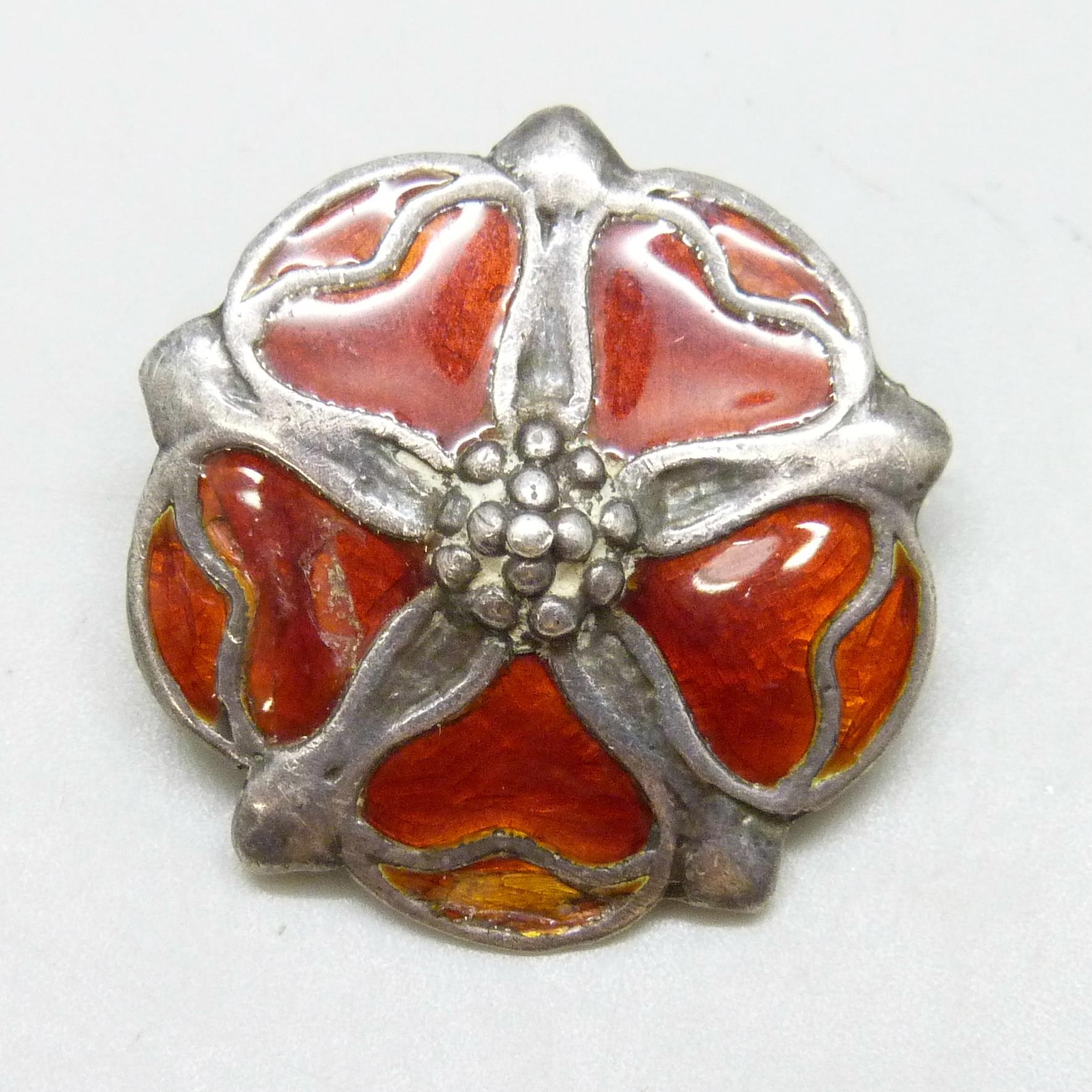 An early 20th Century Art Nouveau white metal brooch in the form of a flower with red enamel, 2.9cm