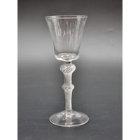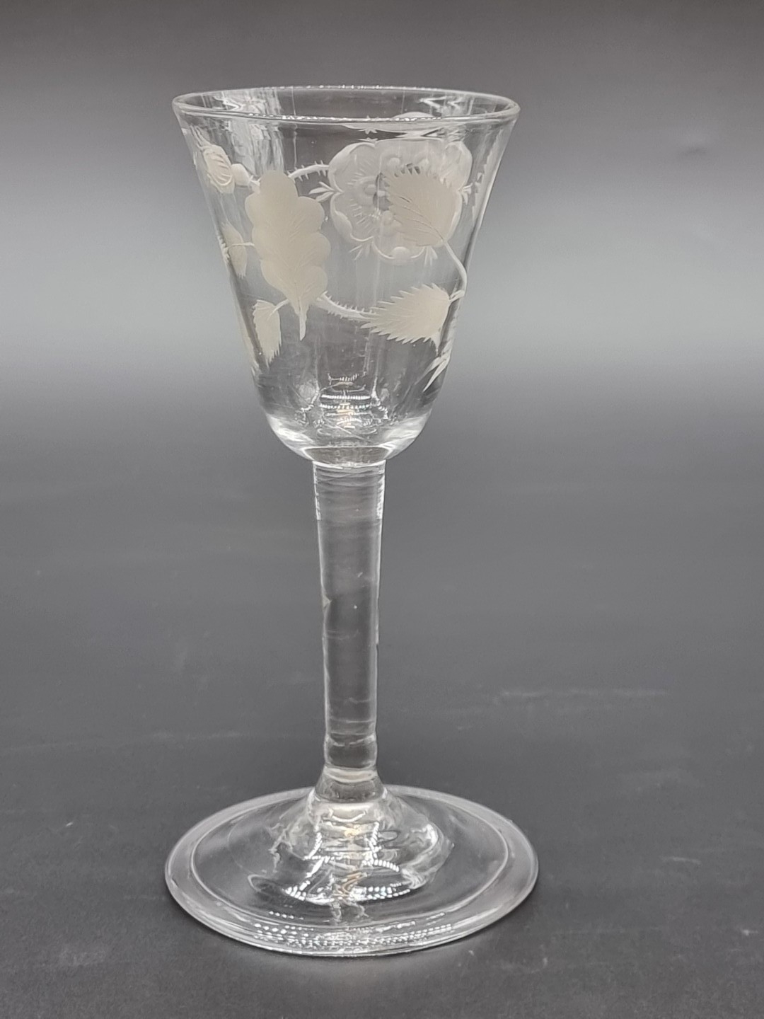 An 18th century Jacobite plain stemmed wine glass, the bowl finely engraved with a rose, bud and leaves, labelled 'Una Fraser Colln', 16.4cm