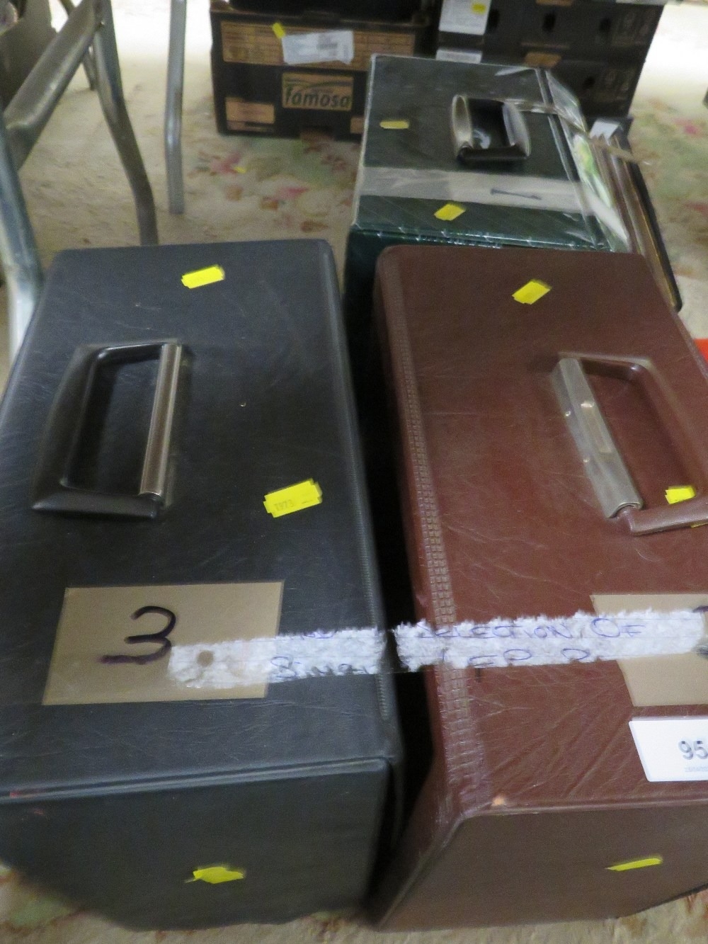 Three LP cases of mainly jazz/swing LP records, 17 box sets and a selection of singles/EP records