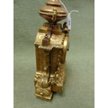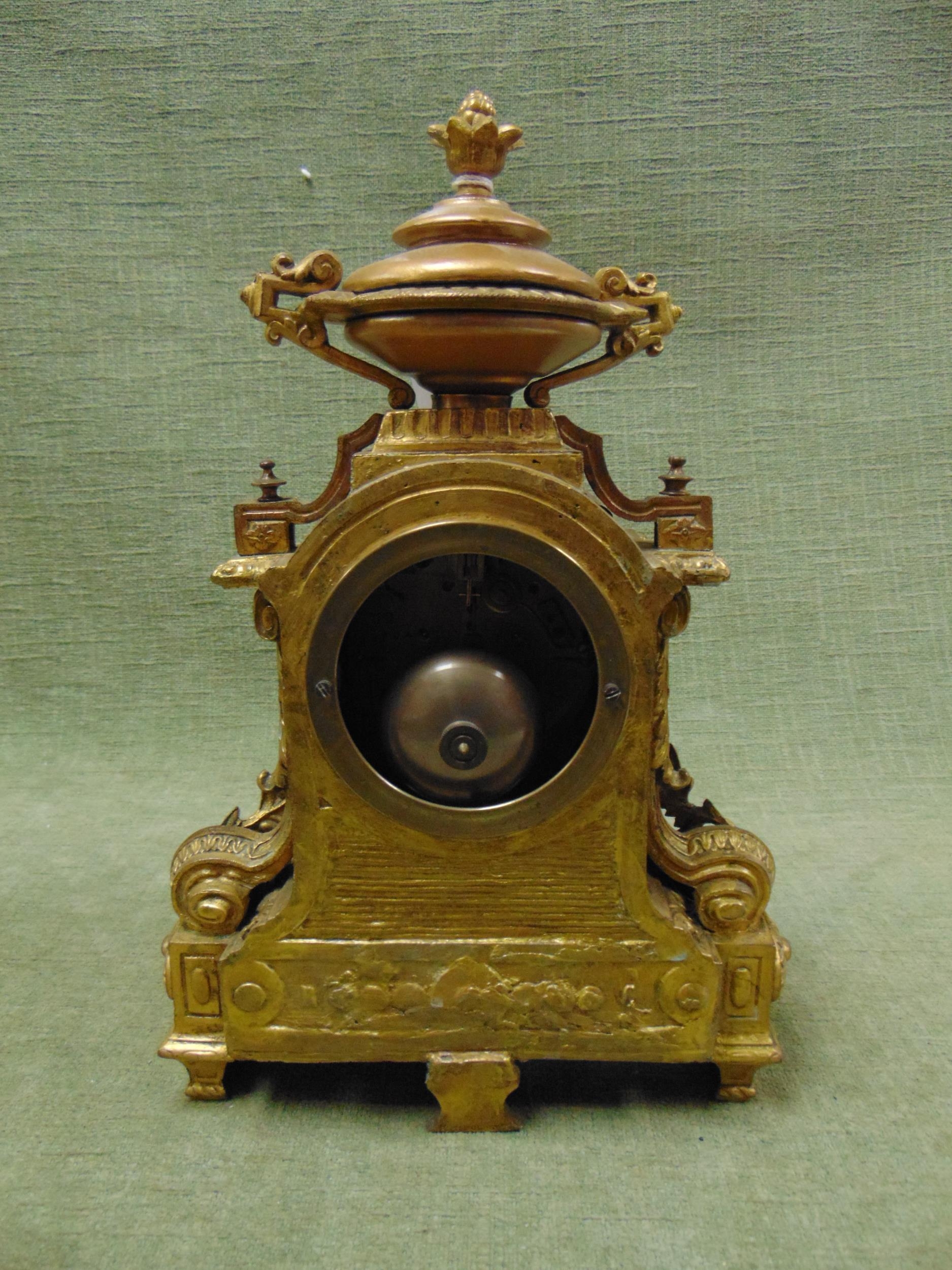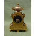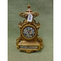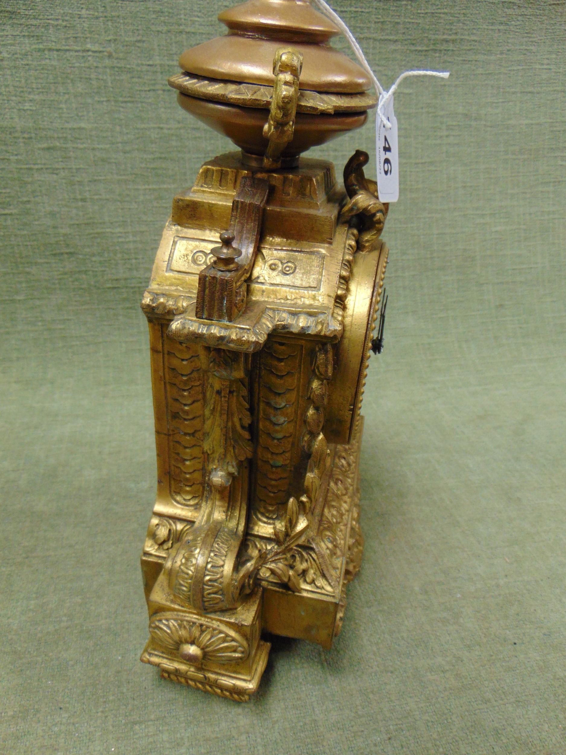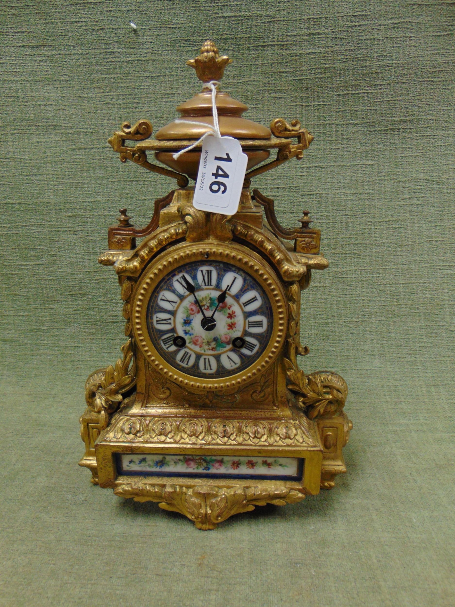 French gilt metal mantle clock with floral porcelain panel and dial, 12.5" high.
