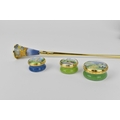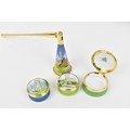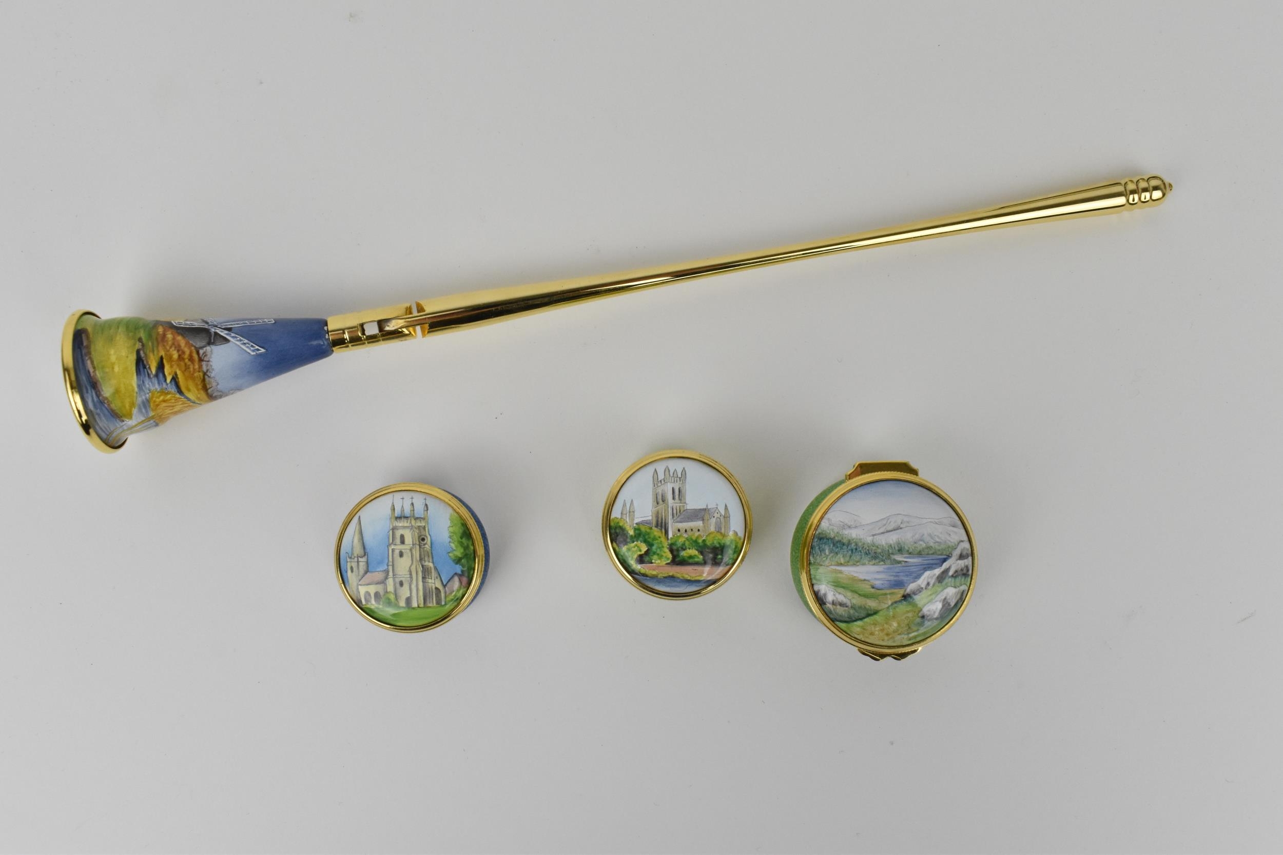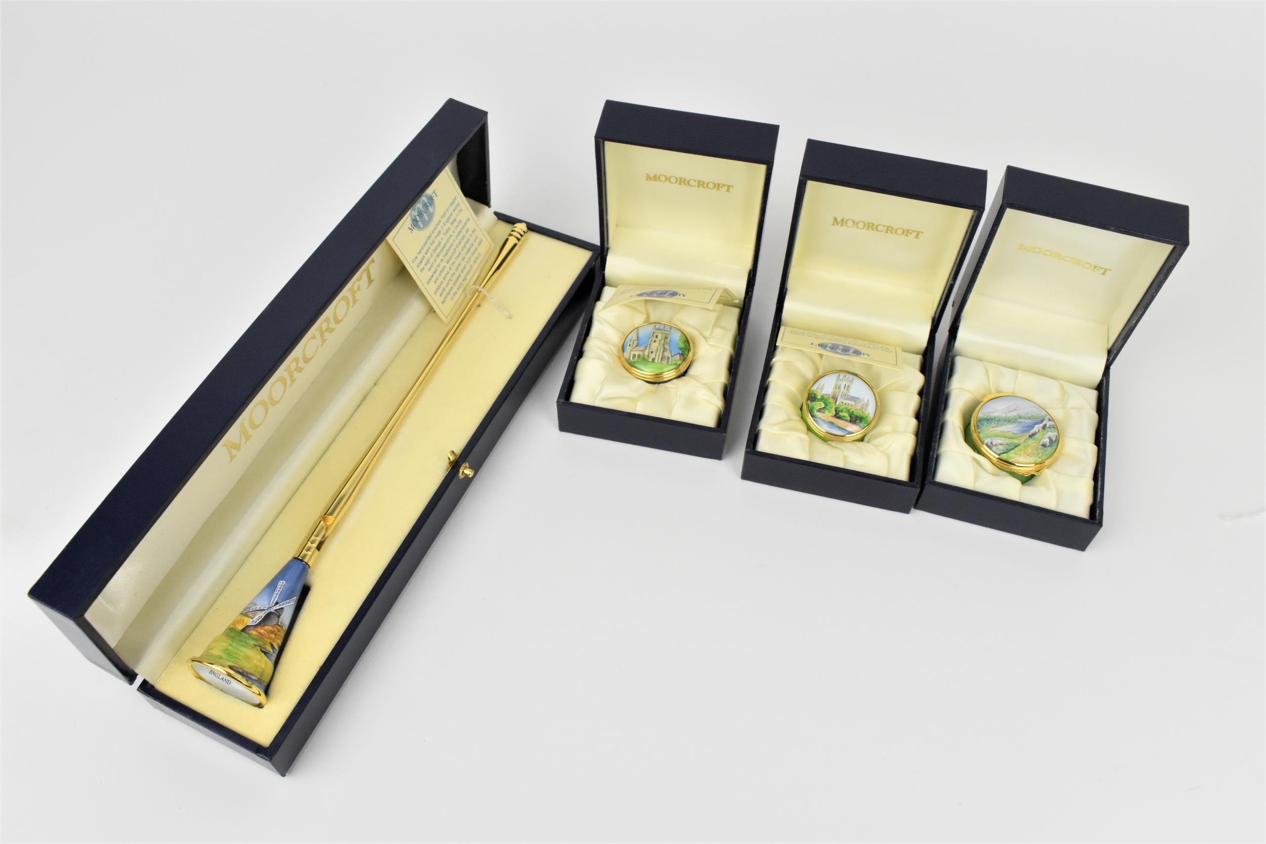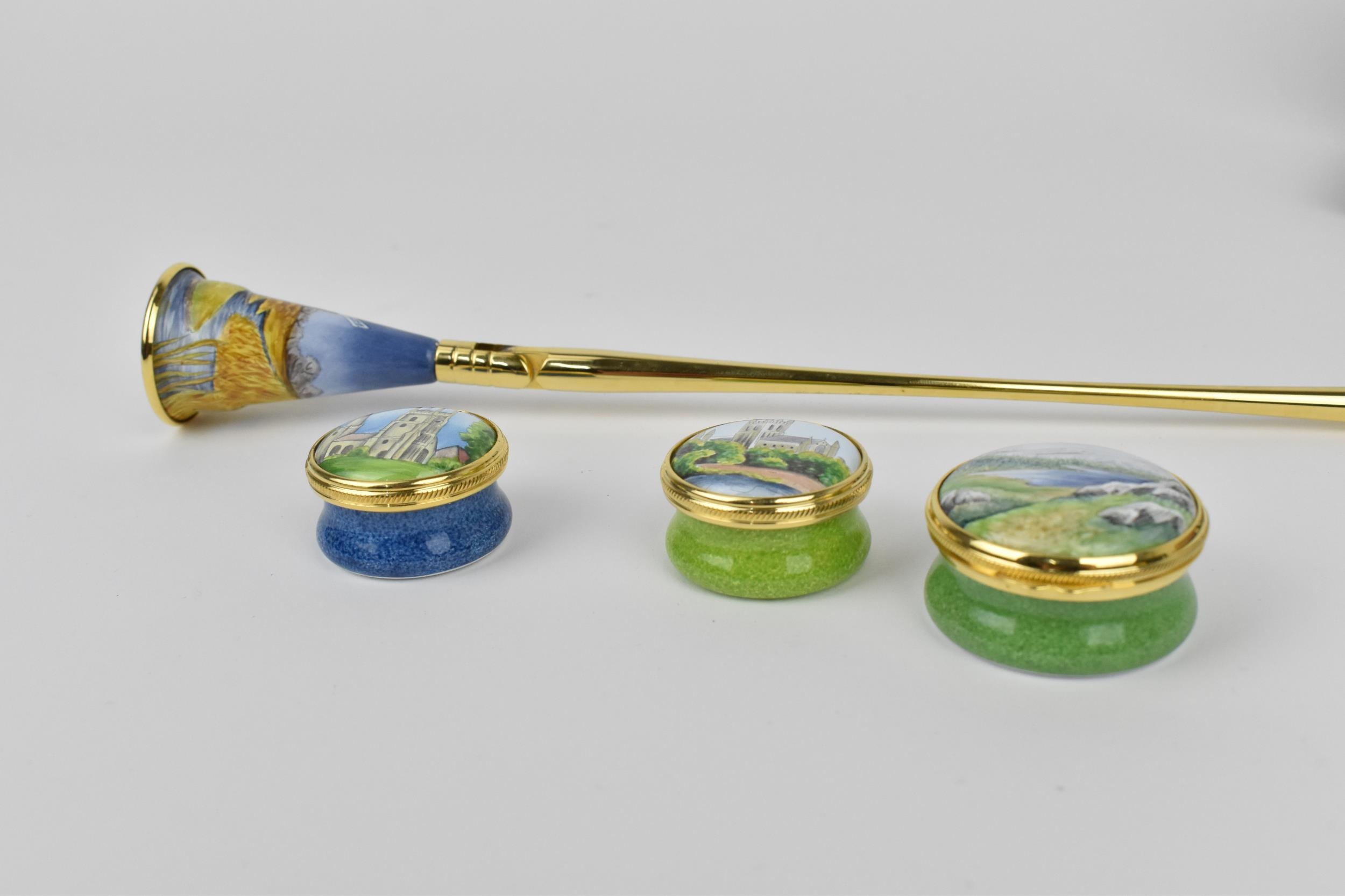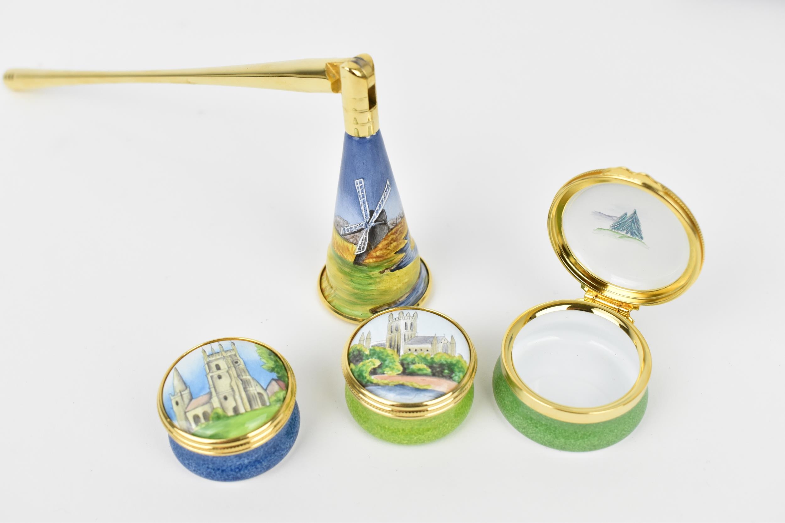 A small collection of Moorcroft Enamels Ltd pill boxes, to include two architectural ones by Stephen Smith, and another in the 'Rivers Bend' pattern painted by Faith Williams, each in original fitted box, together with a Moorcroft Enamel candle snuffer in original fitted box