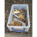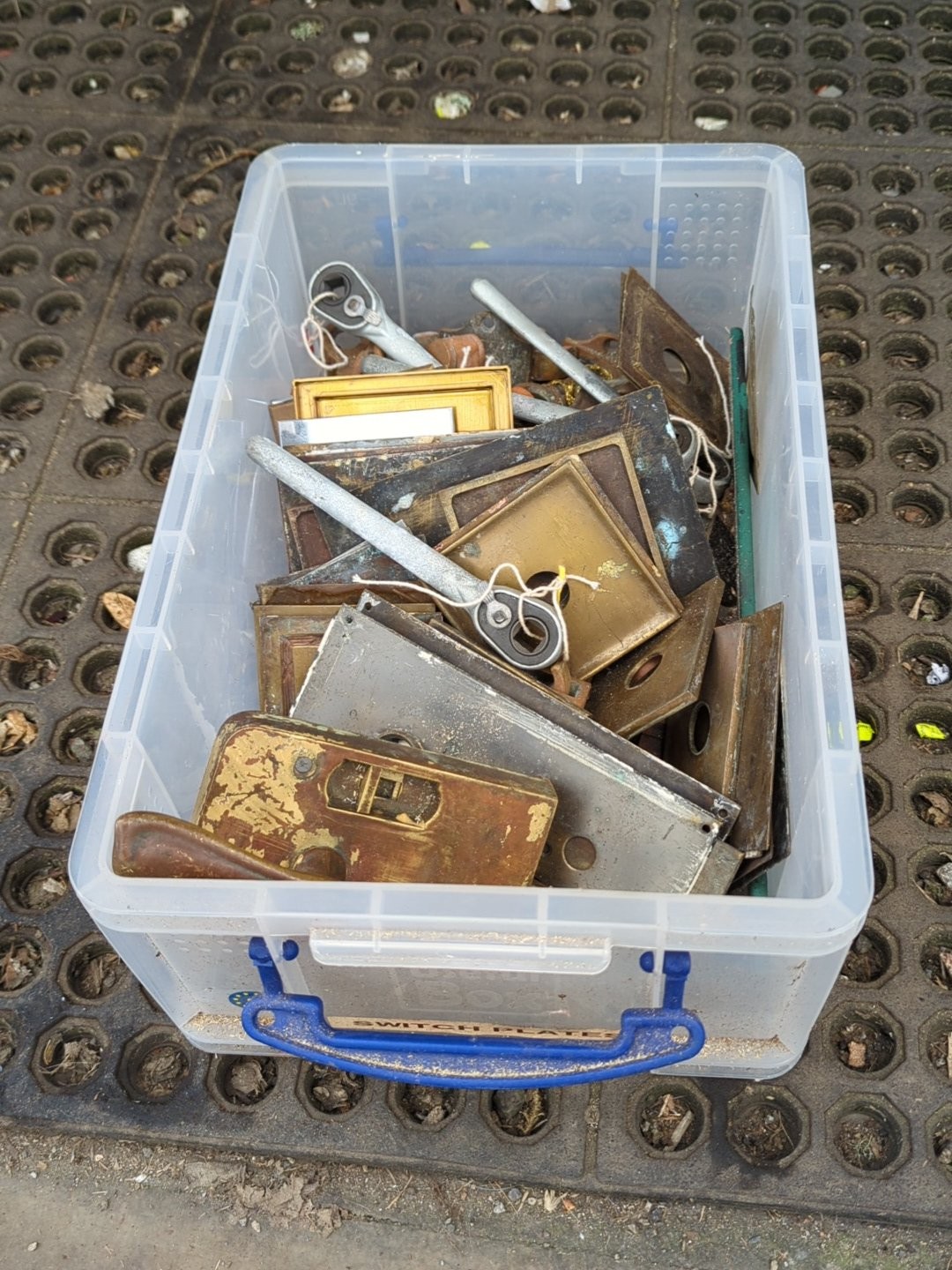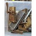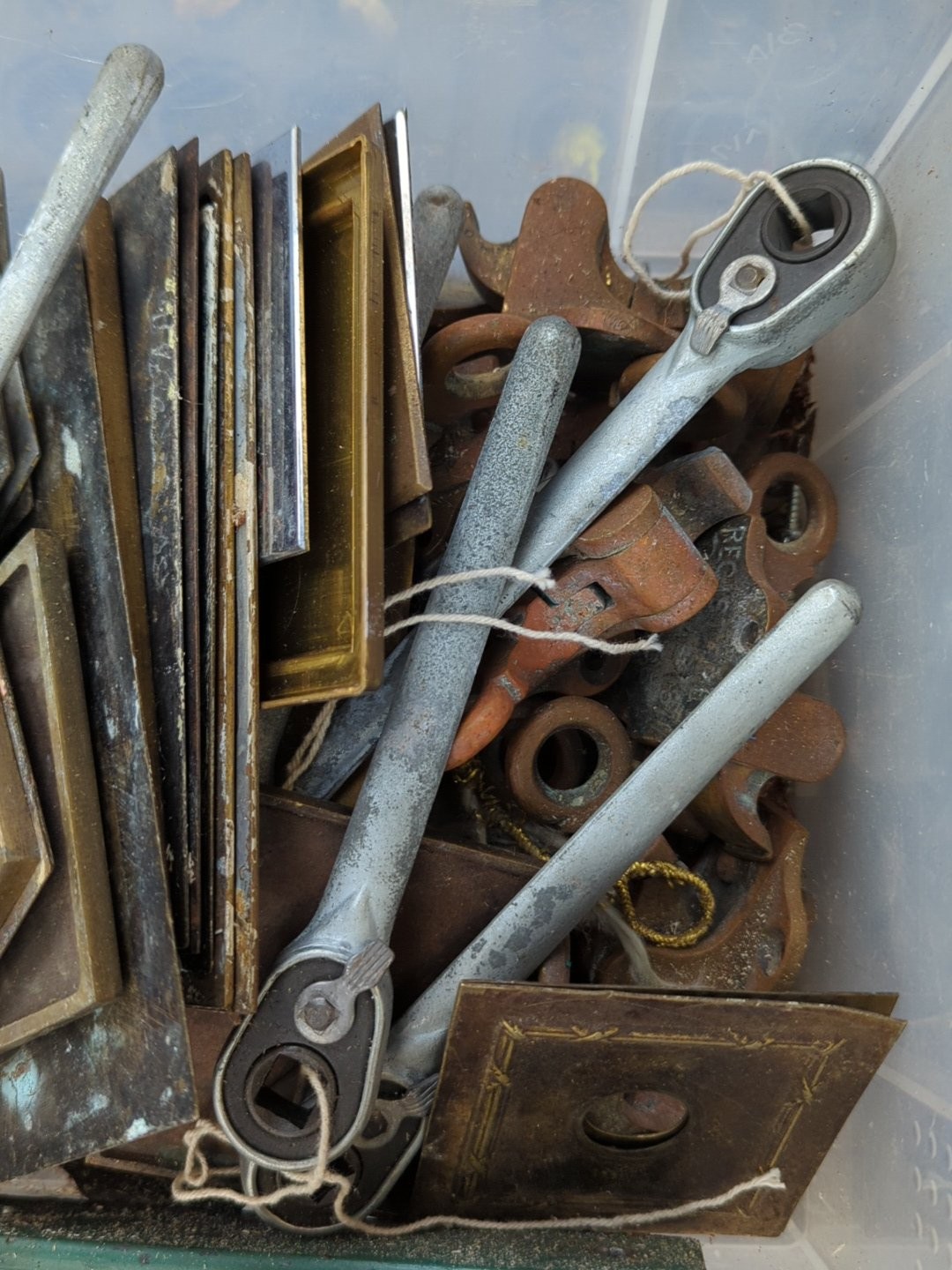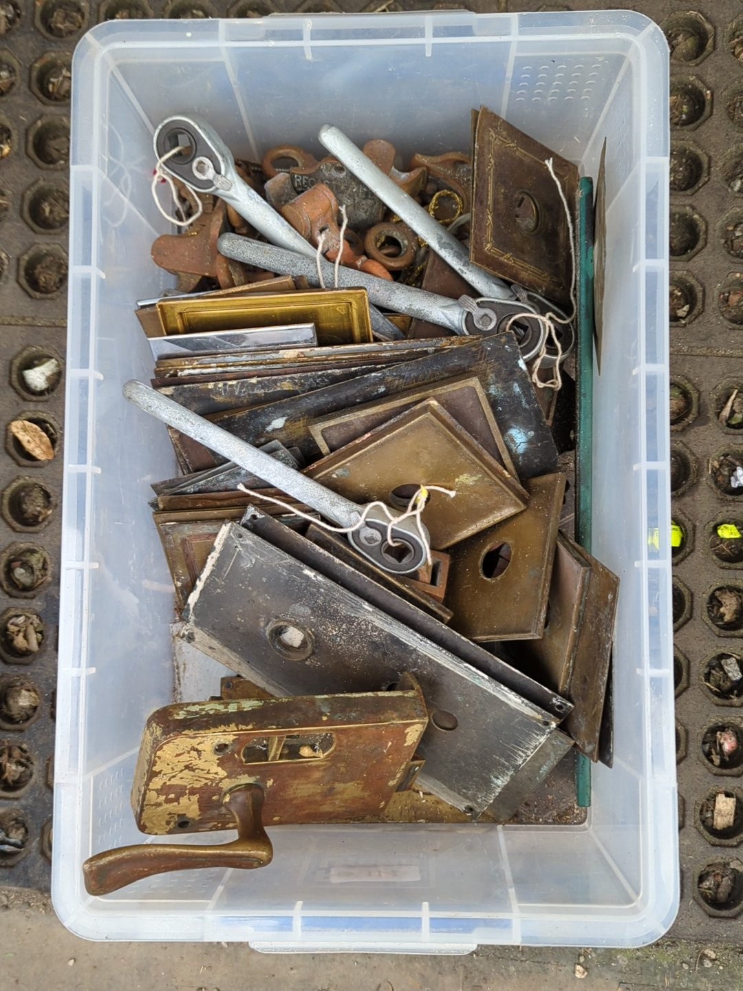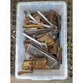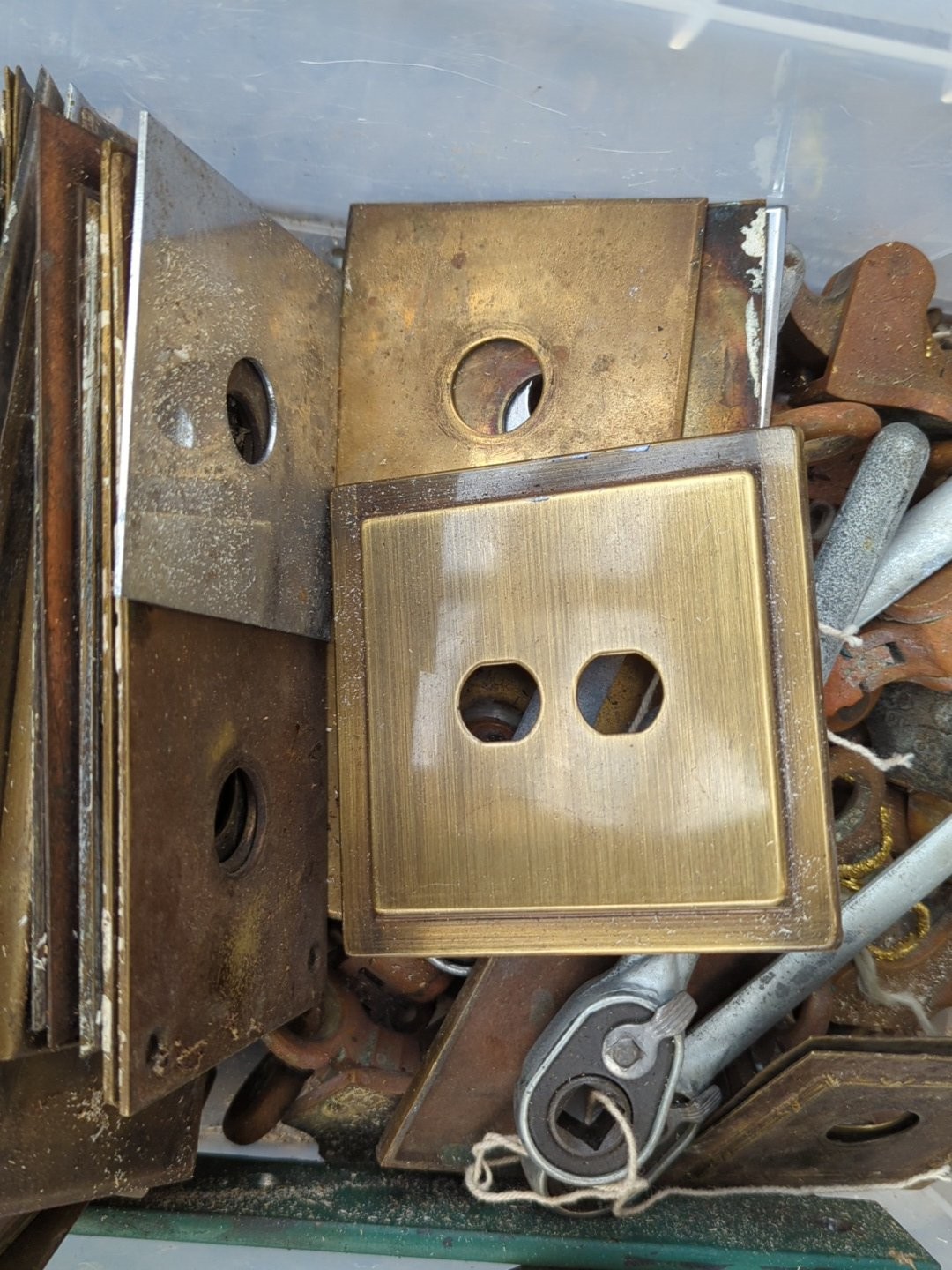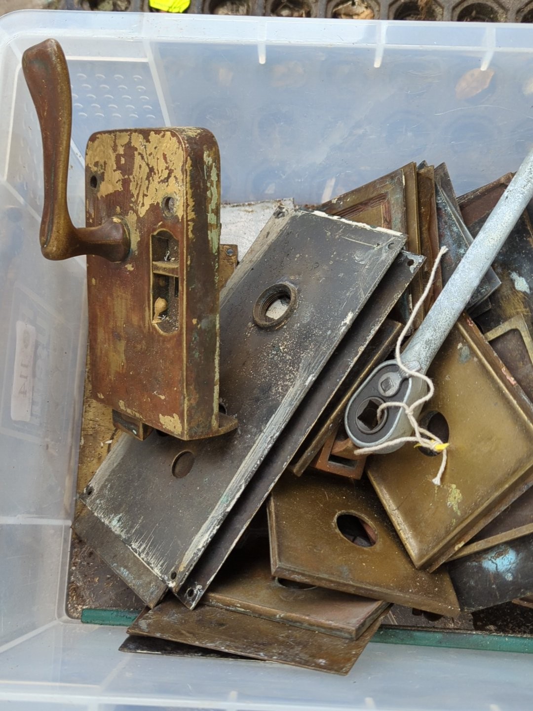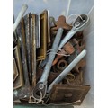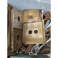 A quantity of mixed architectural door furniture including brass and steel lock plates, escutcheons and finger plates, with assorted handles and fittings, some tied in bundles.