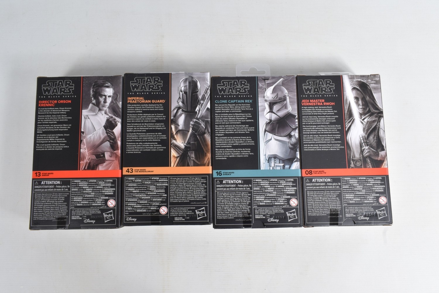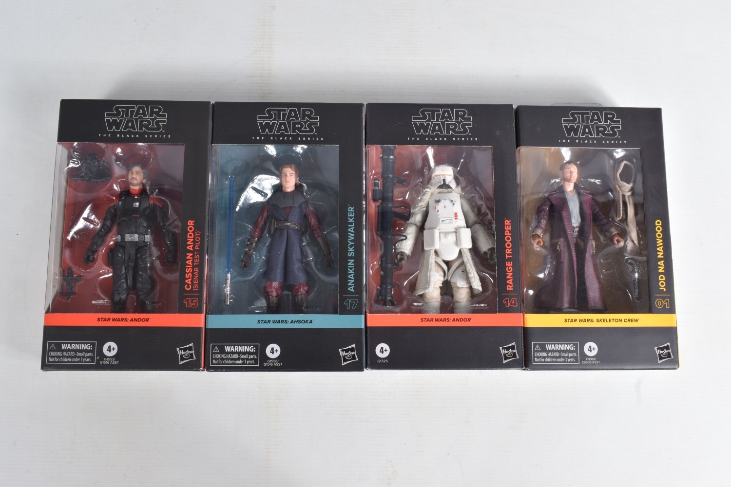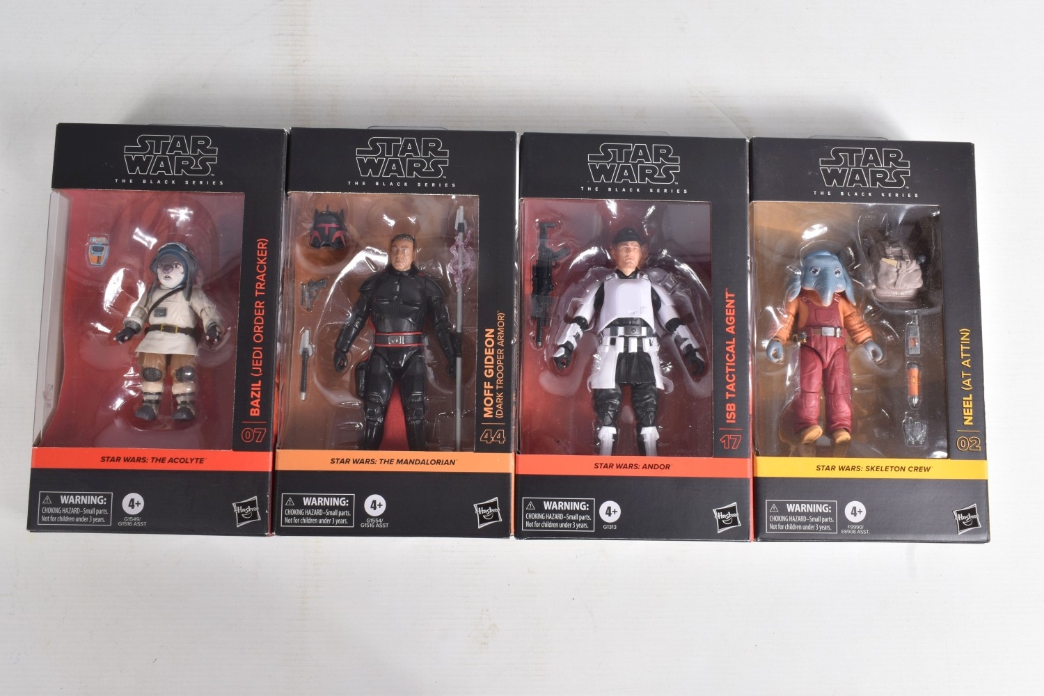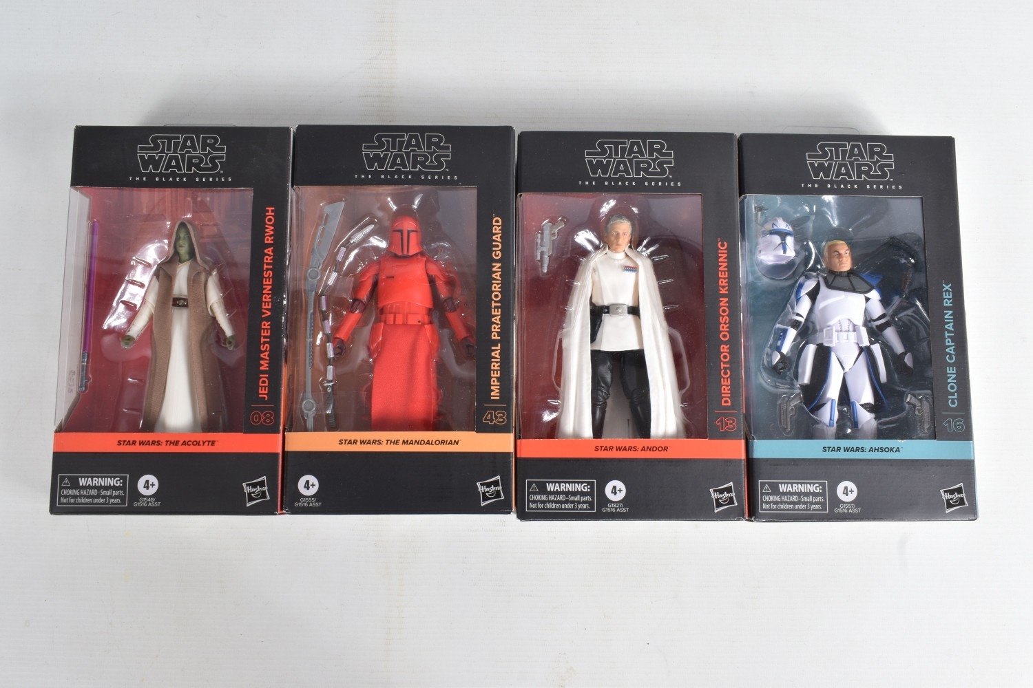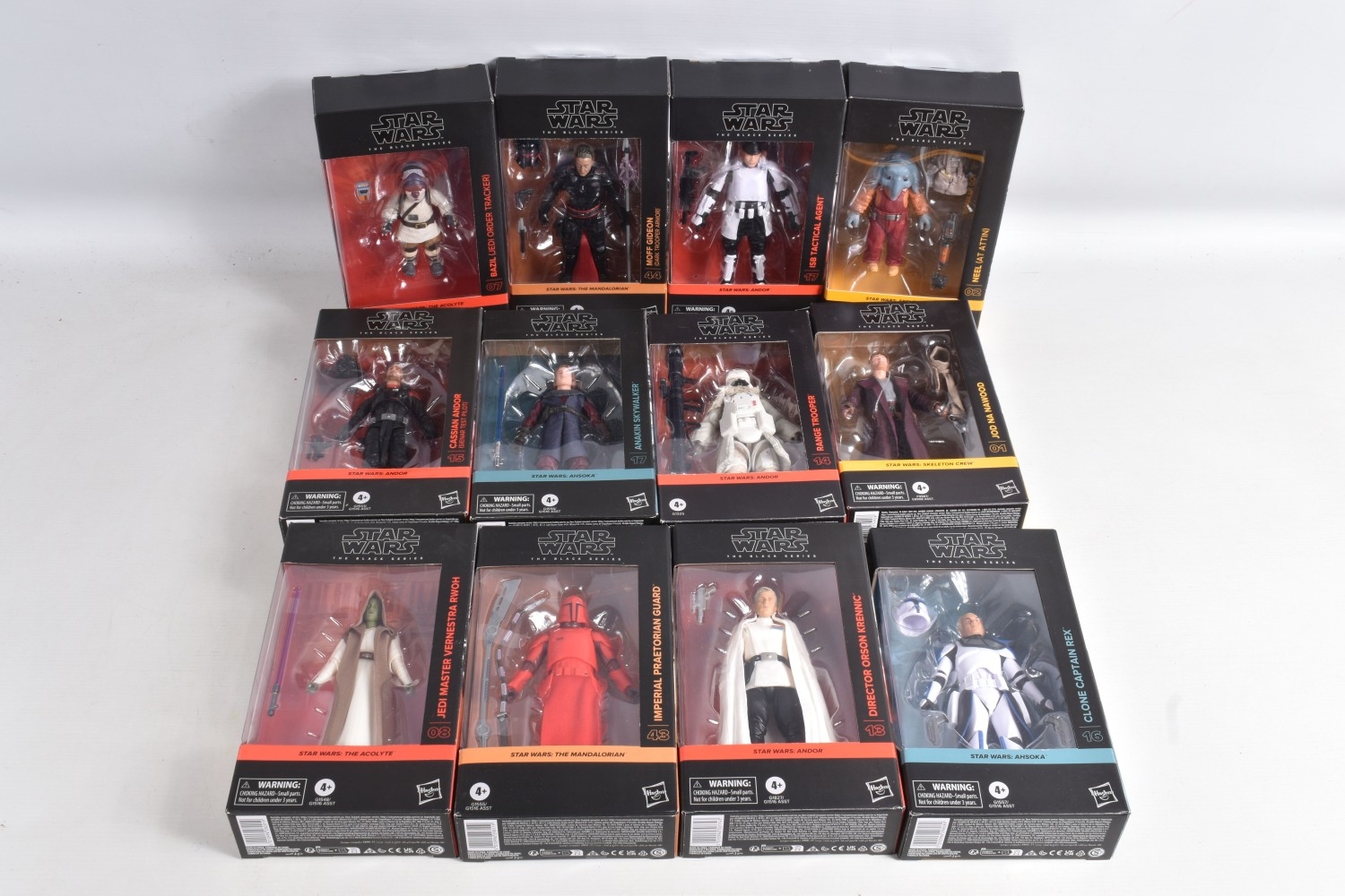 TWELVE BOXED HASBRO TV SERIES STAR WARS THE BLACK SERIES ACTION FIGURES, to include two 'The Mandalorian' figures, a Moff Gideon (Dark Trooper Armor) no. 44 and an Imperial Praetorian Guard no. 43, two 'The Acolyte' figures, a Jedi Master Vernestra Rwoh no. 08 and a Bazil (Jedi Order Tracker) no. 07, four 'Andor' figures, a ISB Tactical Agent no. 17, a Range Trooper no. 14, a Cassian Andor (Sienar Test Pilot) no. 15, and a Director Orson Krennic no. 13, two 'Ahsoka' figures, a Clone Captain Rex no. 16 and an Anakin Skywalker no. 17, and two ' Skeleton Crew' figures, a Neel (At Attin) no. 02 and Jod Na Nawood no. 01, they are each in factory sealed like new packaging, condition is good