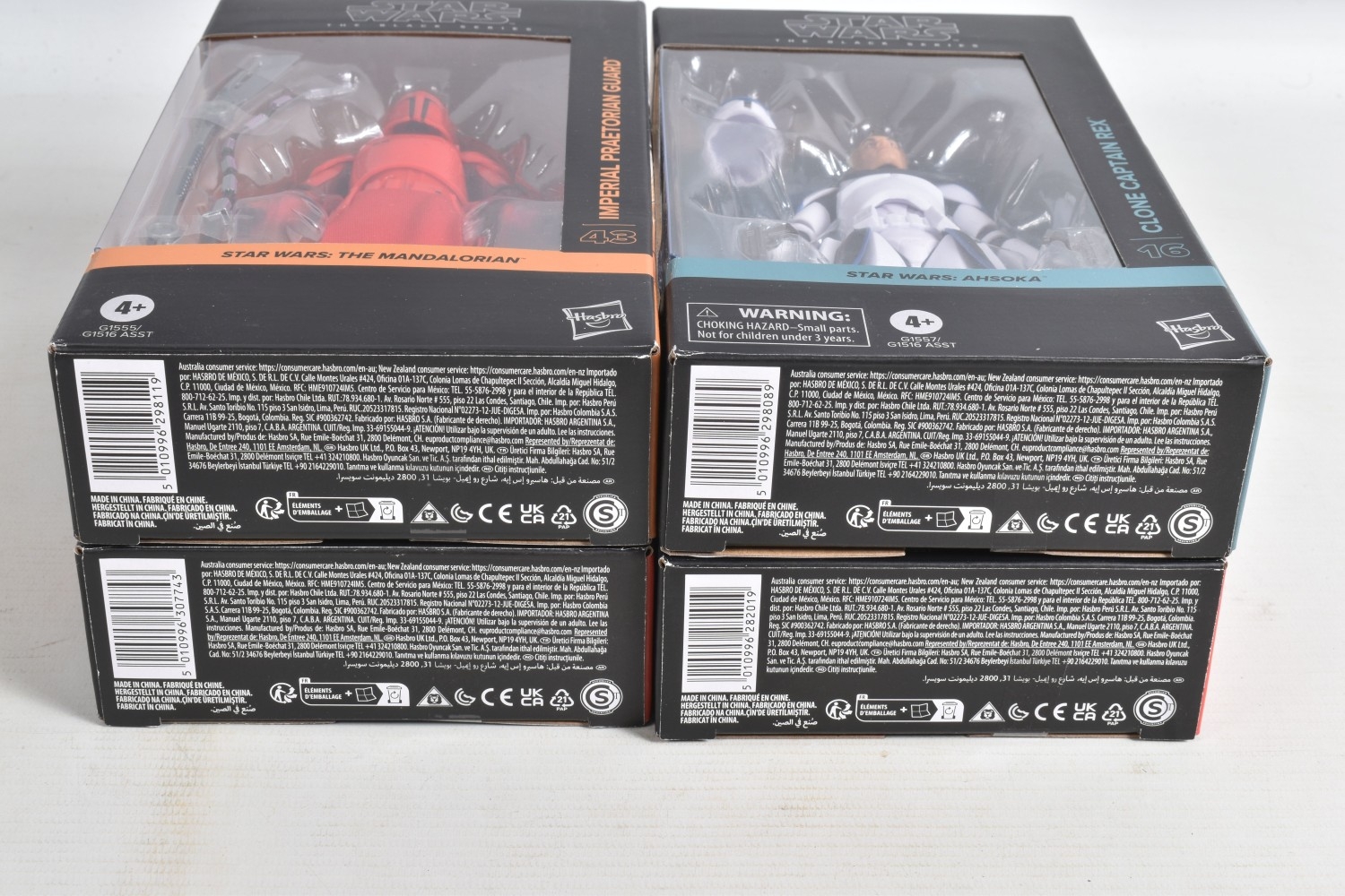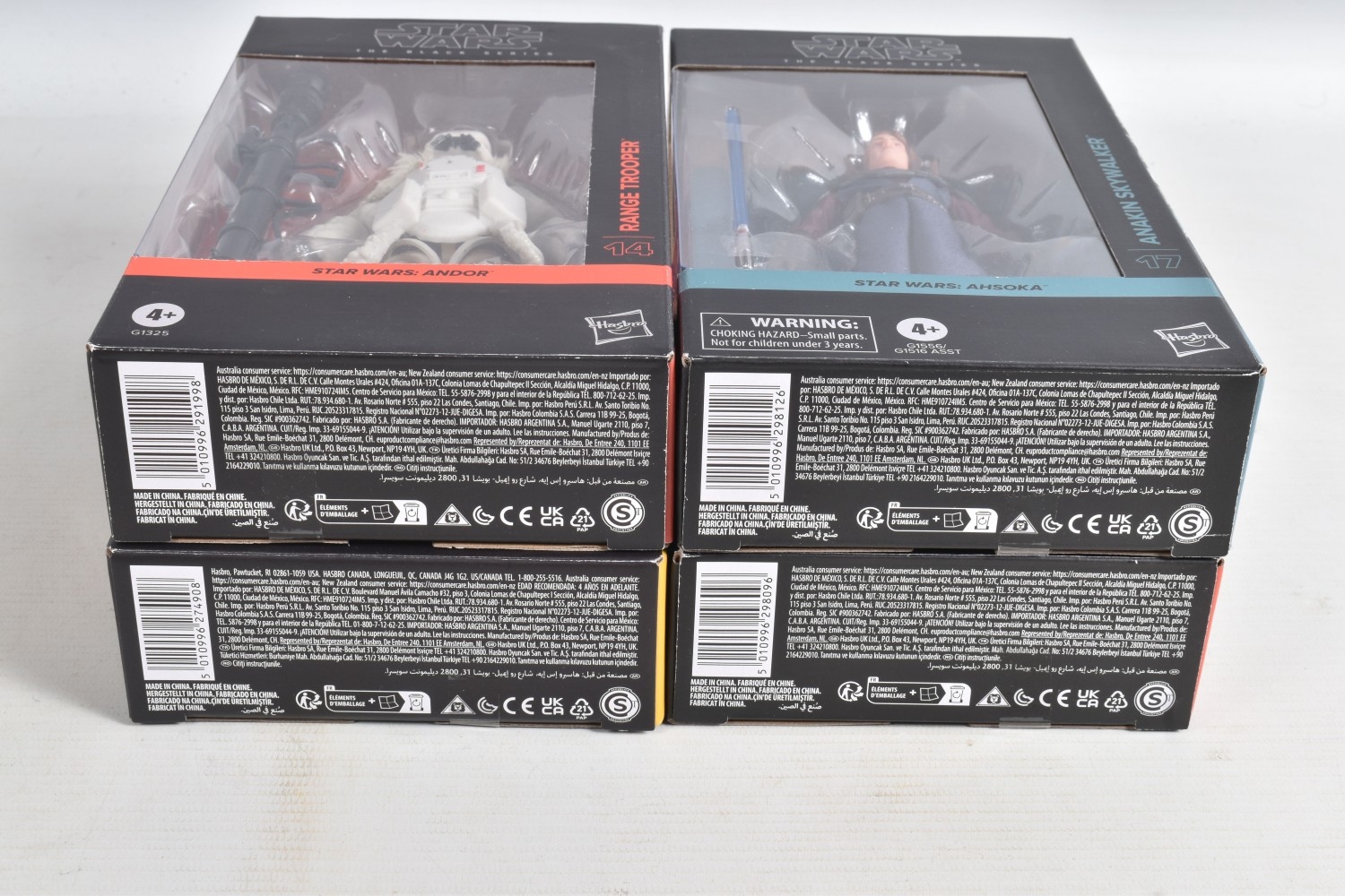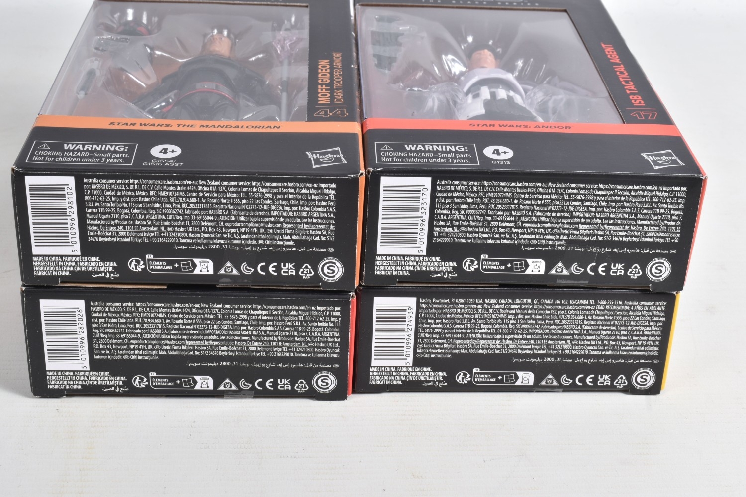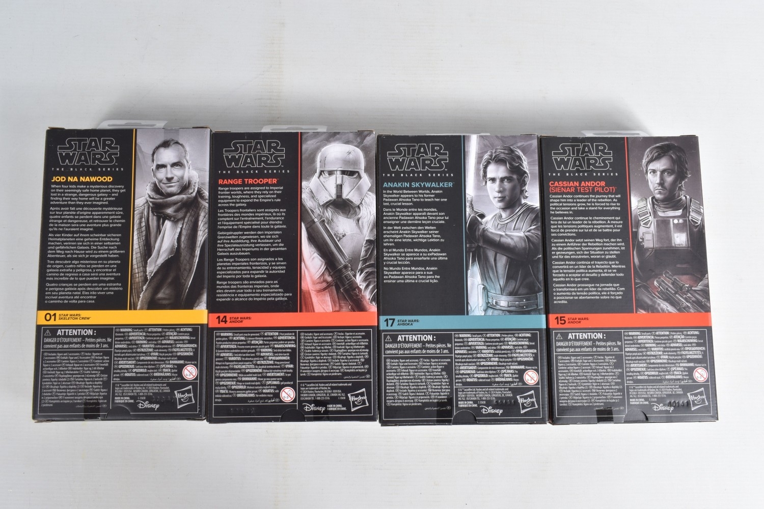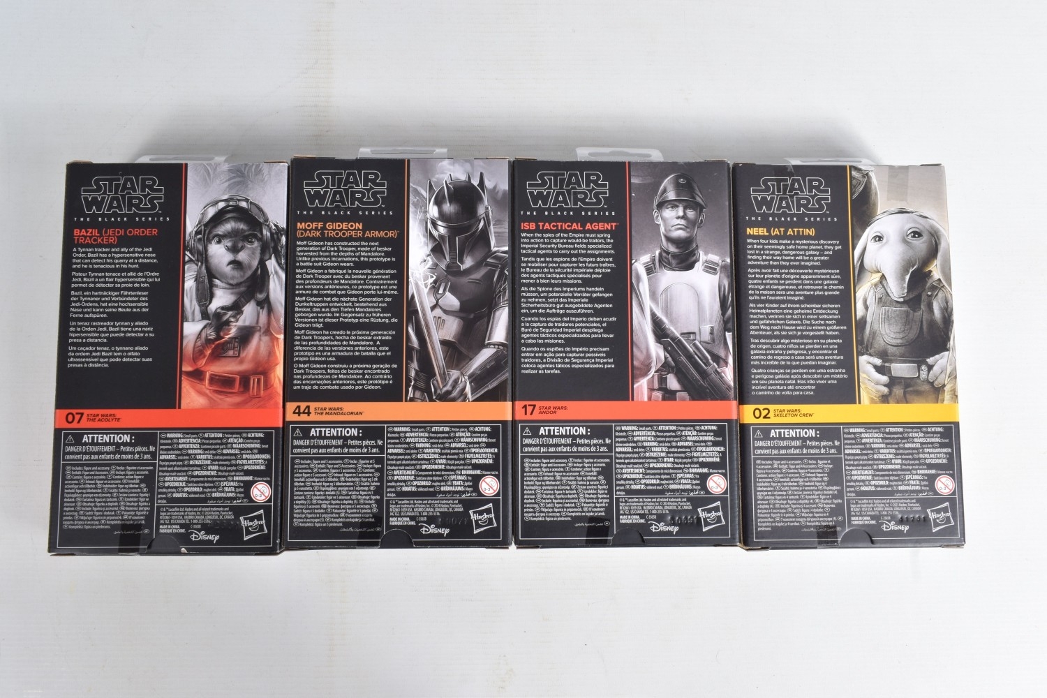 TWELVE BOXED HASBRO TV SERIES STAR WARS THE BLACK SERIES ACTION FIGURES, to include two 'The Mandalorian' figures, a Moff Gideon (Dark Trooper Armor) no. 44 and an Imperial Praetorian Guard no. 43, two 'The Acolyte' figures, a Jedi Master Vernestra Rwoh no. 08 and a Bazil (Jedi Order Tracker) no. 07, four 'Andor' figures, a ISB Tactical Agent no. 17, a Range Trooper no. 14, a Cassian Andor (Sienar Test Pilot) no. 15, and a Director Orson Krennic no. 13, two 'Ahsoka' figures, a Clone Captain Rex no. 16 and an Anakin Skywalker no. 17, and two ' Skeleton Crew' figures, a Neel (At Attin) no. 02 and Jod Na Nawood no. 01, they are each in factory sealed like new packaging, condition is good