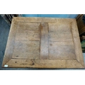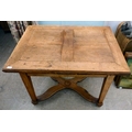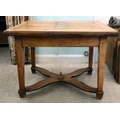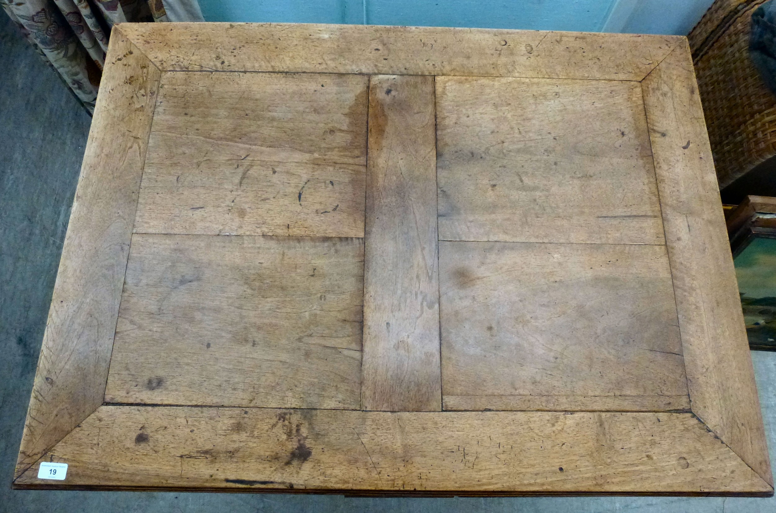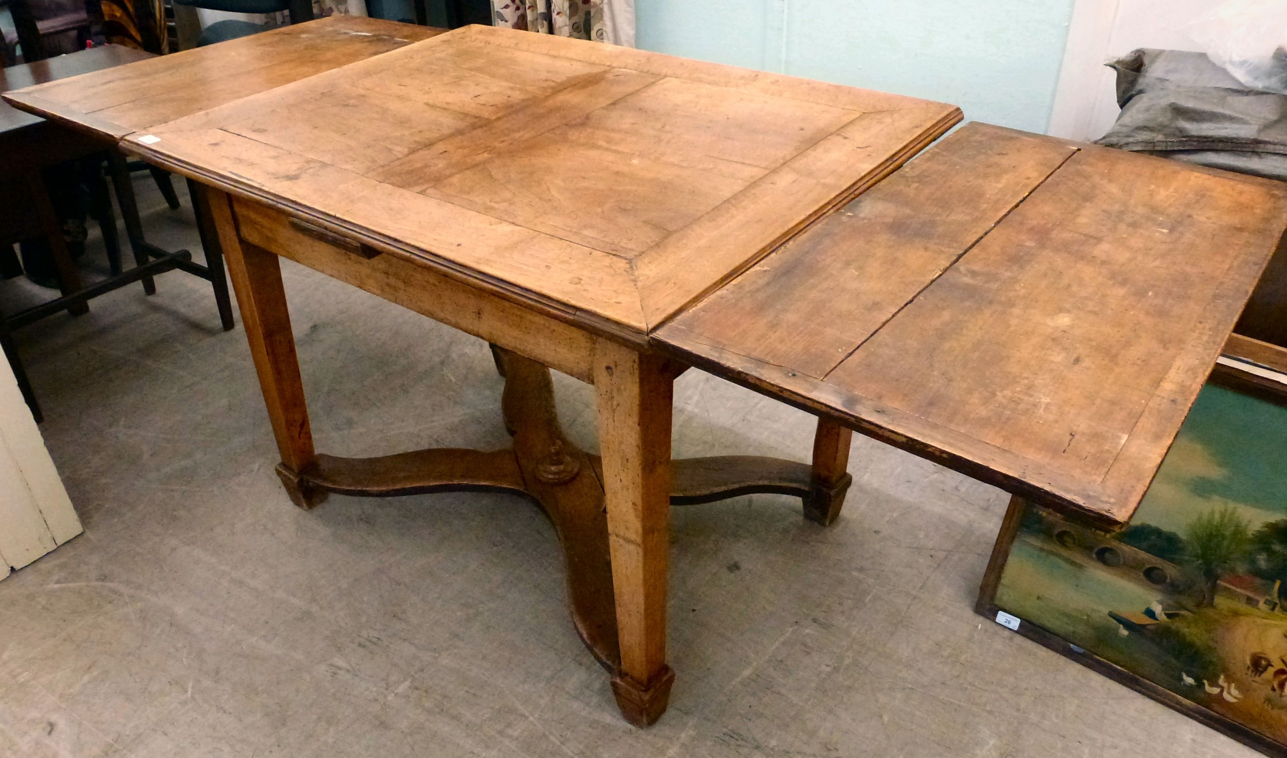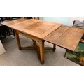 A mid/late 19thC oak farmhouse style dropleaf table, raised on square, tapered legs, united by a cross stretcher and spade feet 31.5"h 42"L extending to 80"L