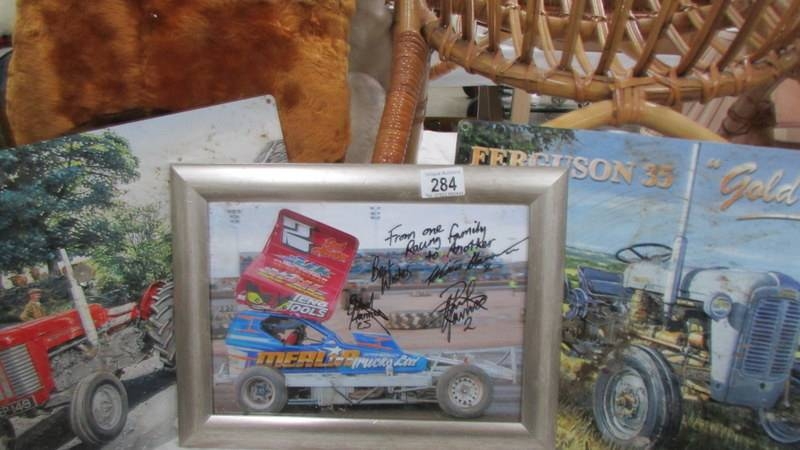 Two retro metal Massey Ferguson tractor signs, and a stock car a/f racing photograph, signed.