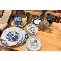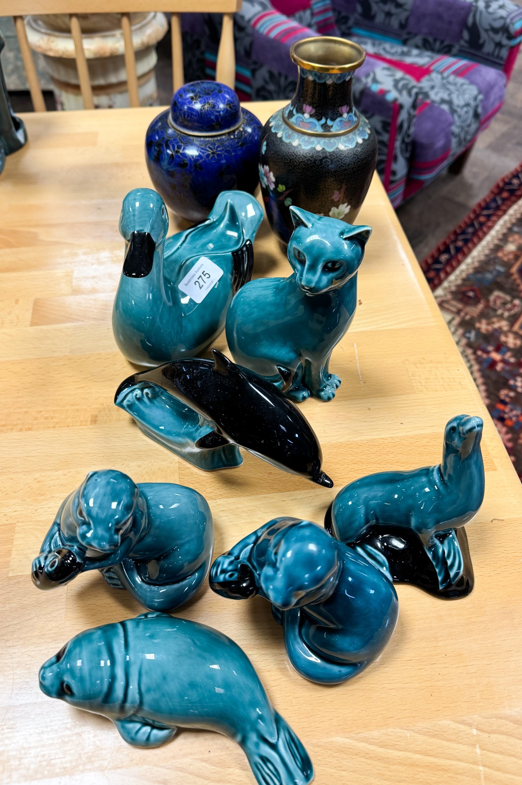 A collection of seven Poole Pottery blue haze animal figurines and two Cloisonne vases