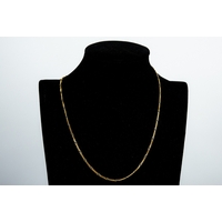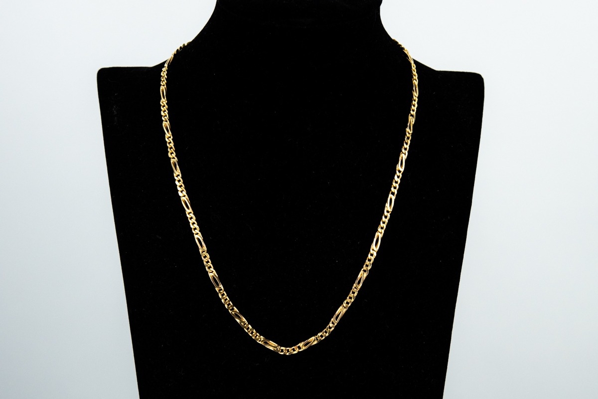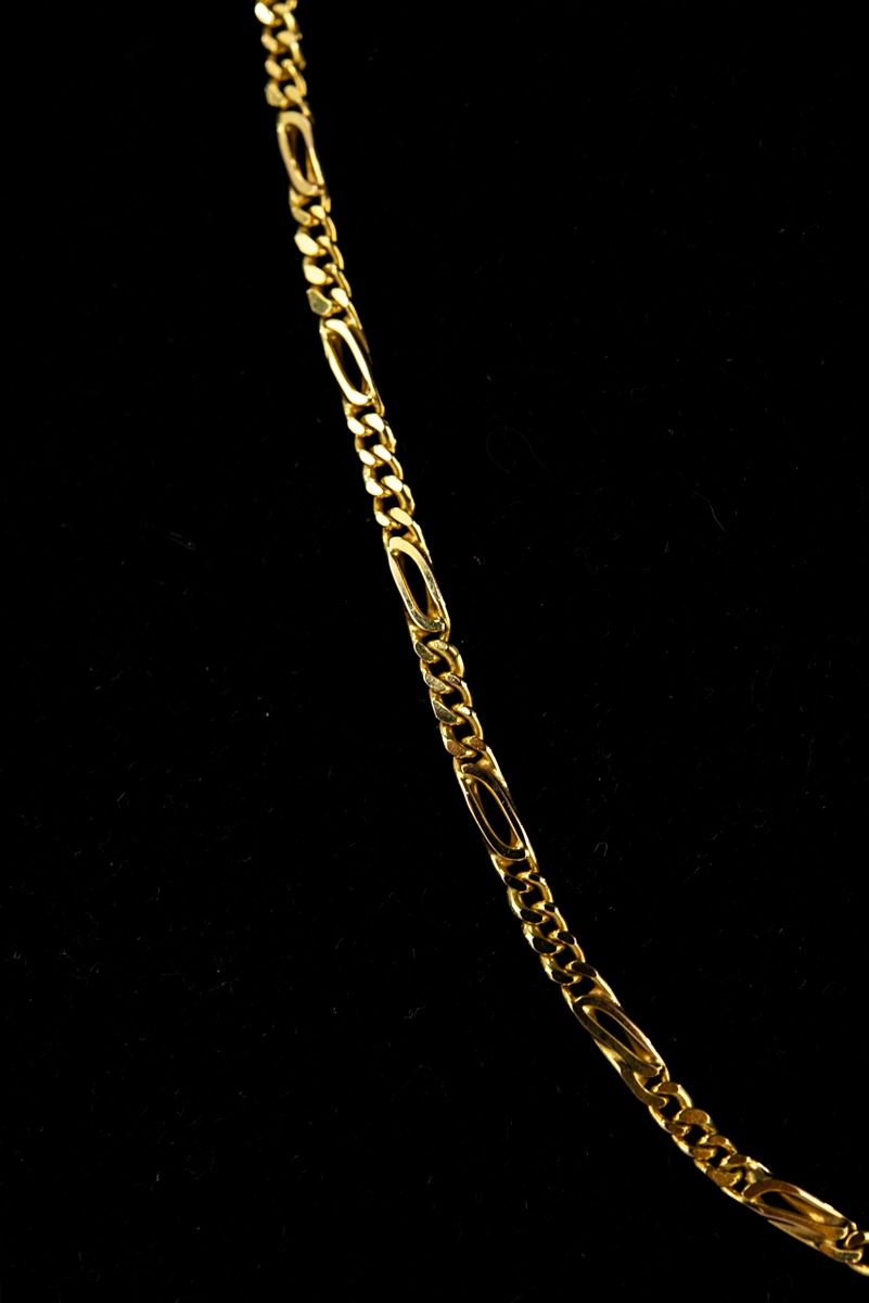 9ct GOLD CHAIN NECKLACE with alternate plain long links and sections with four curb links, trigger clasp, 17 ½” long (44.5cm), 13.6gms