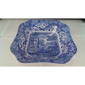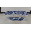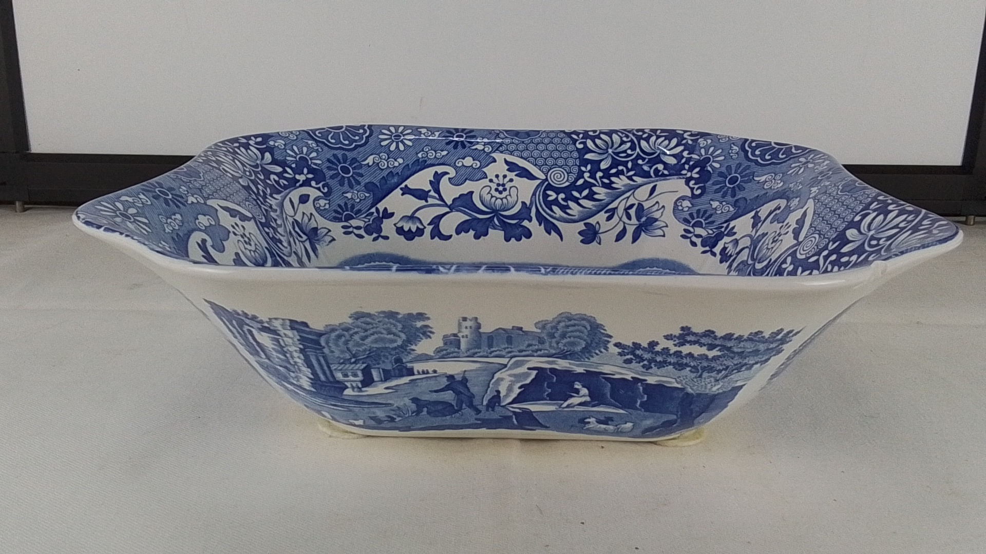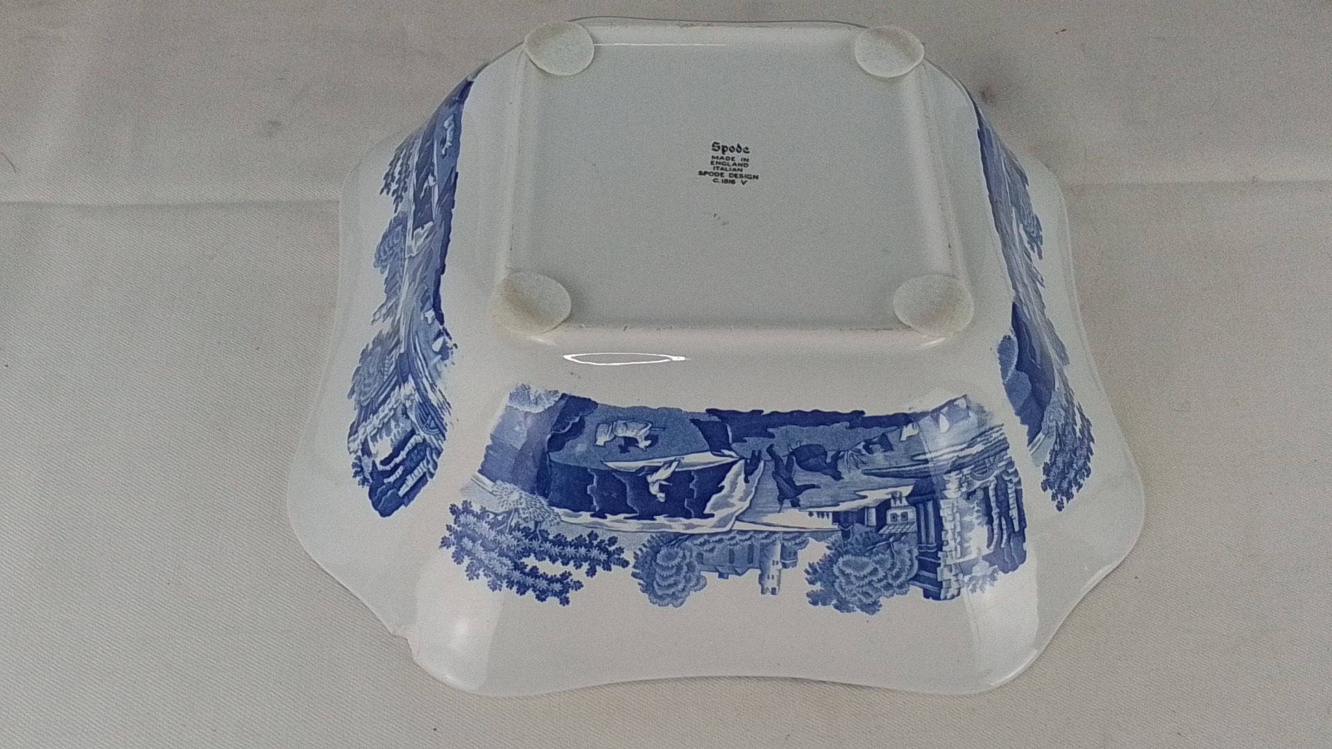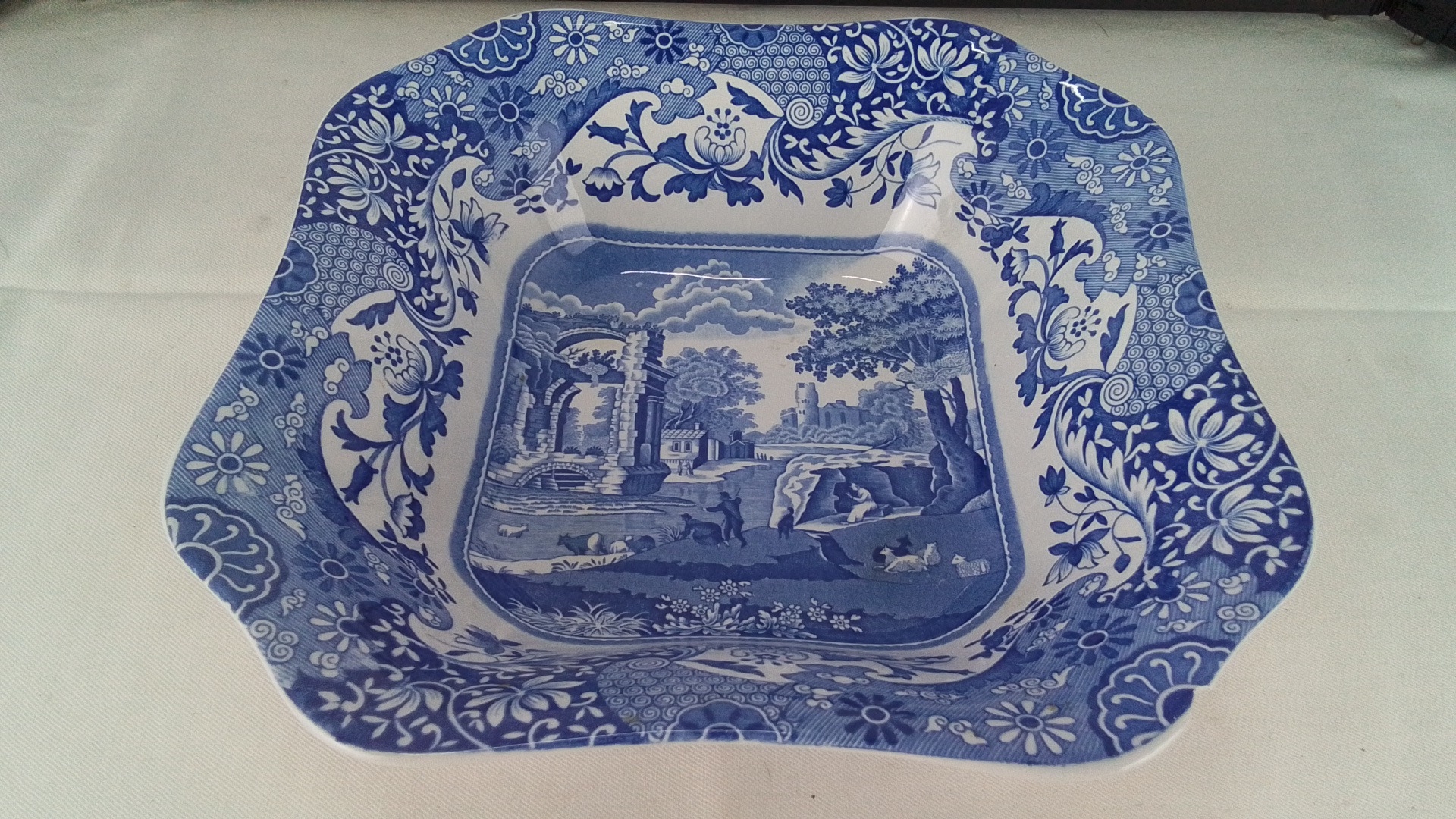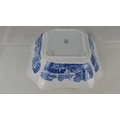 Spode blue-and-white transfer-printed serving bowl, square form with lobed rim, decorated with floral border and pastoral landscape panels.