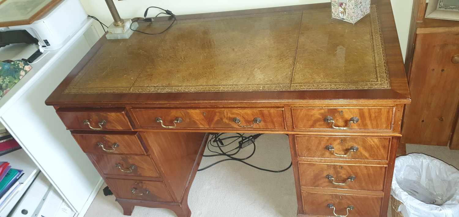 A pedestal desk, with inset top over three frieze drawers and drawers to each pedestal -