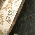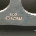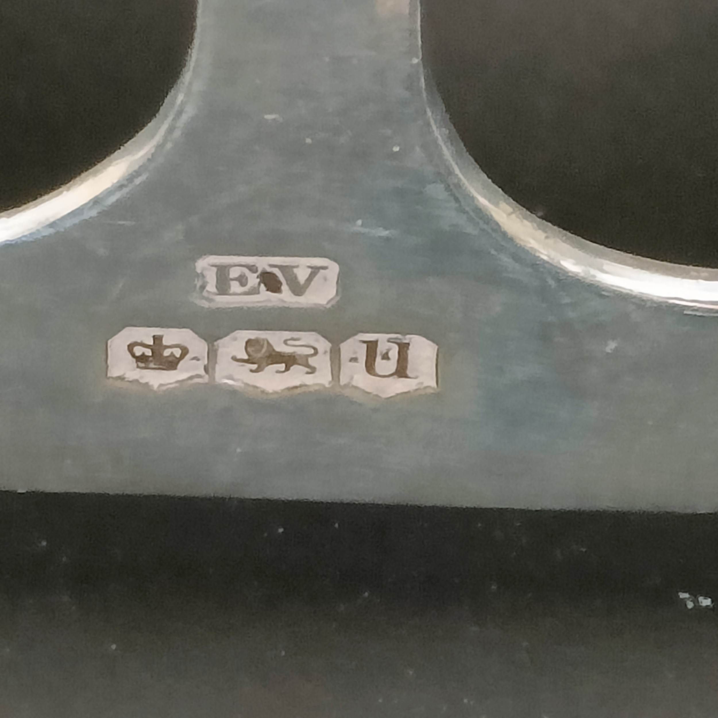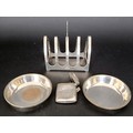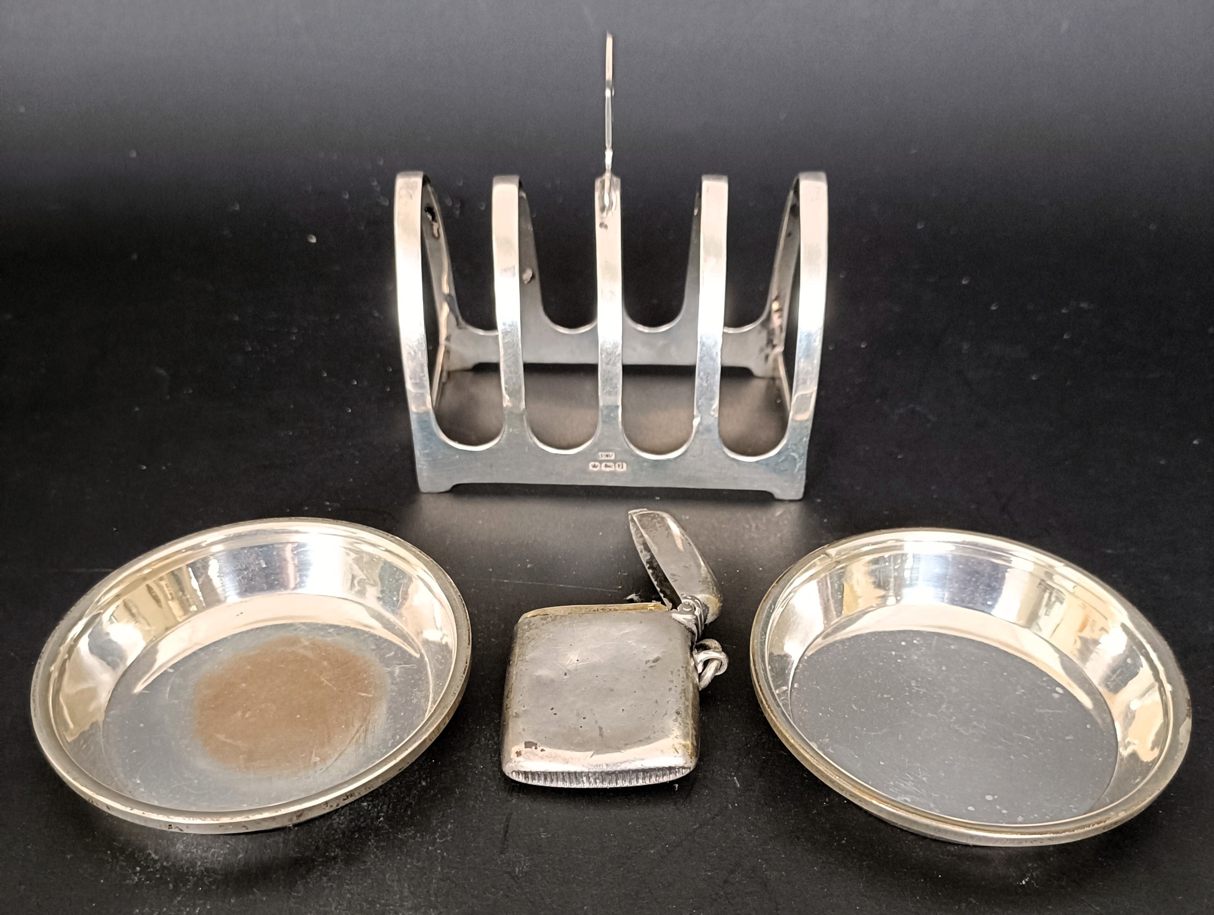 A George V silver four division toast rack, 8 cm wide, a pair of silver pin dishes, and a vesta case, 3.6 ozt (4)