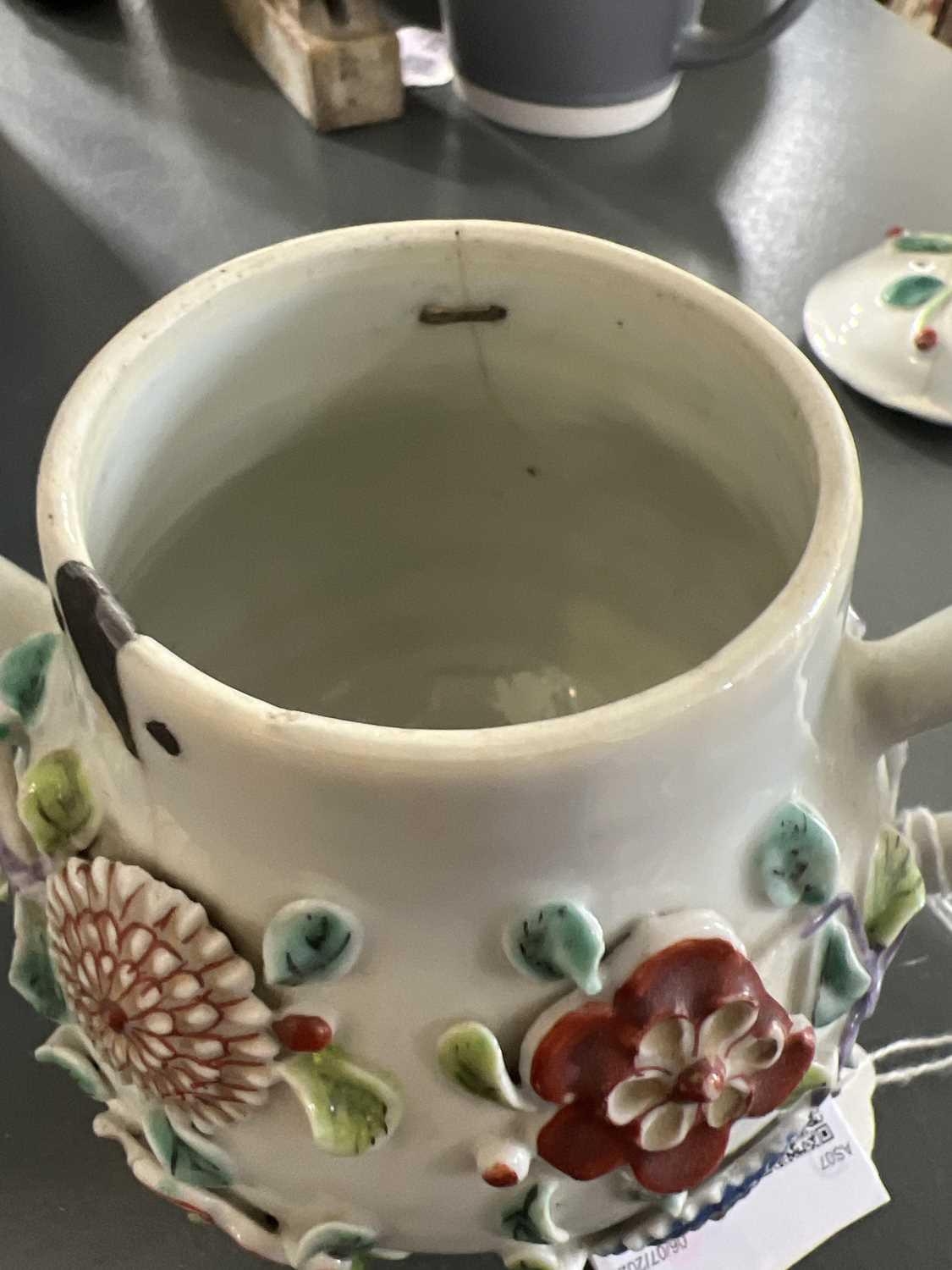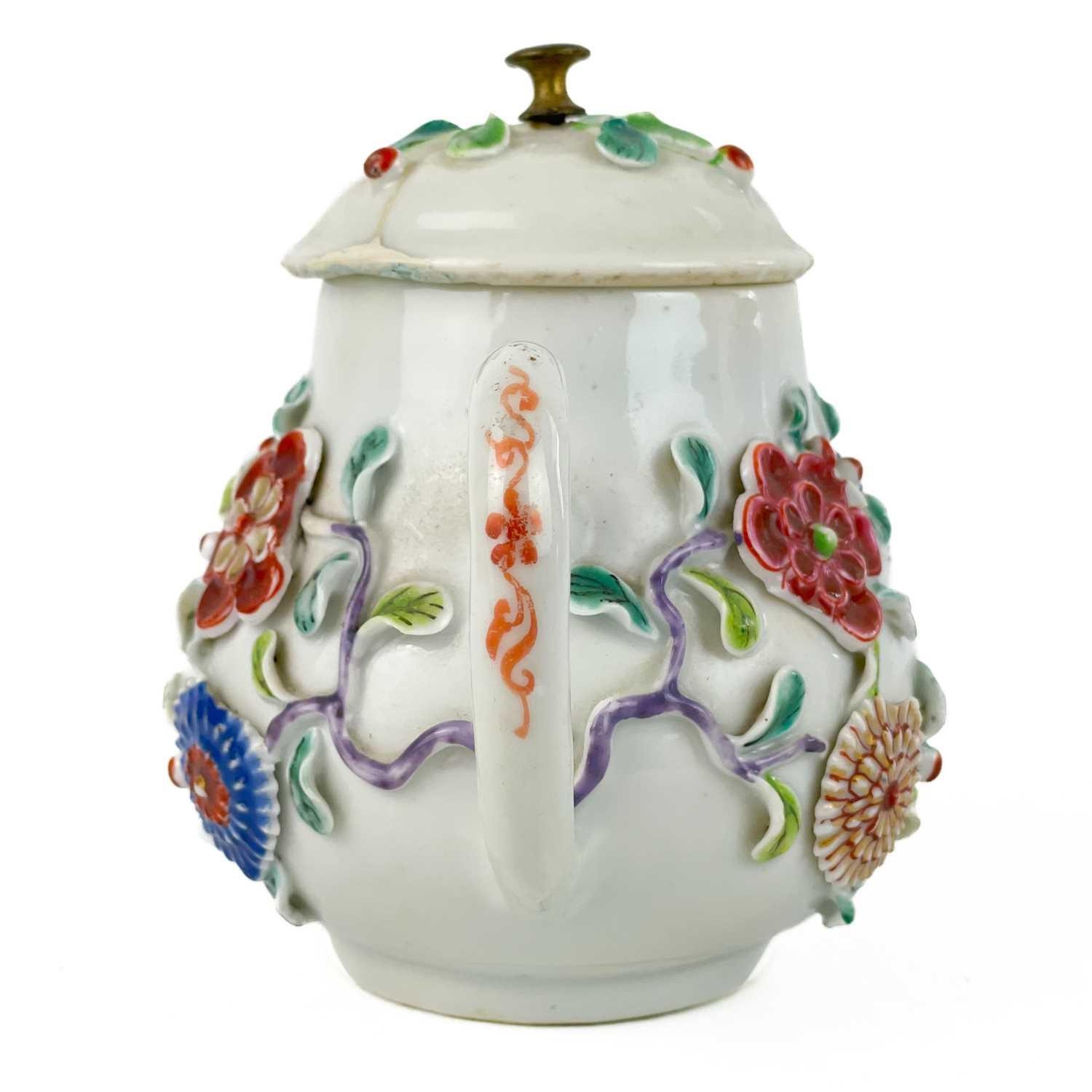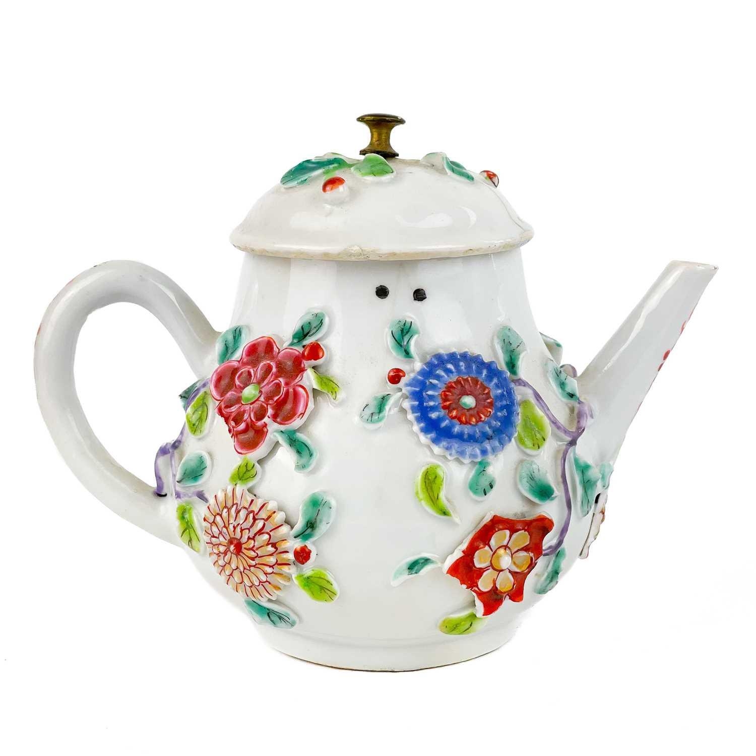 A Chinese porcelain teapot, mid 18th century. .With applied floral and leaf decoration, height 12cm, length 16cm, depth 9.5cm. The pot has two hairlines each has a single rivet and one has a lead repair. Various damages to the applied decoration. The lid is damaged and repaired with replaced finial