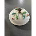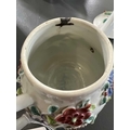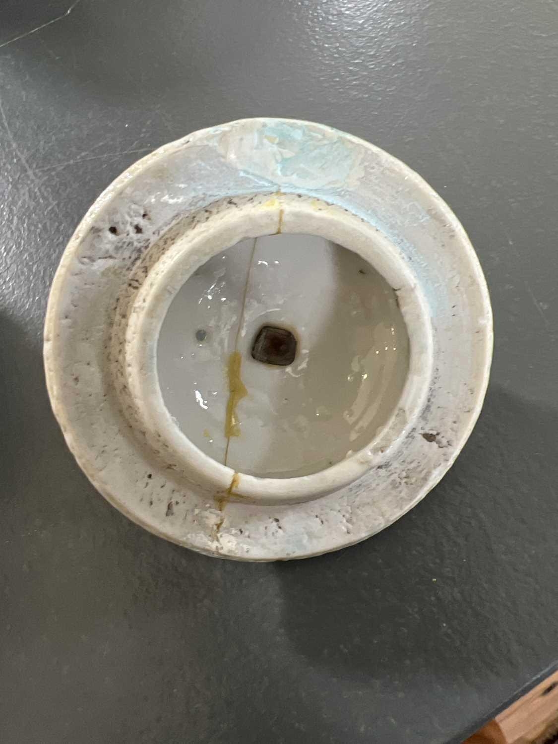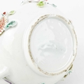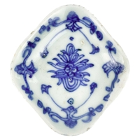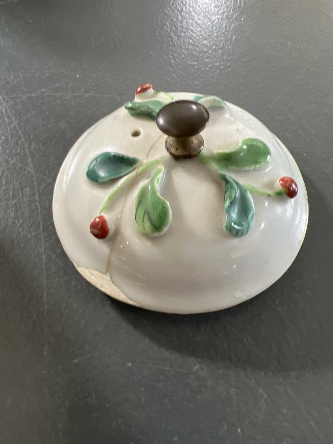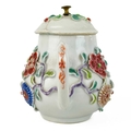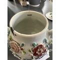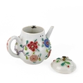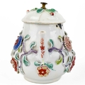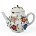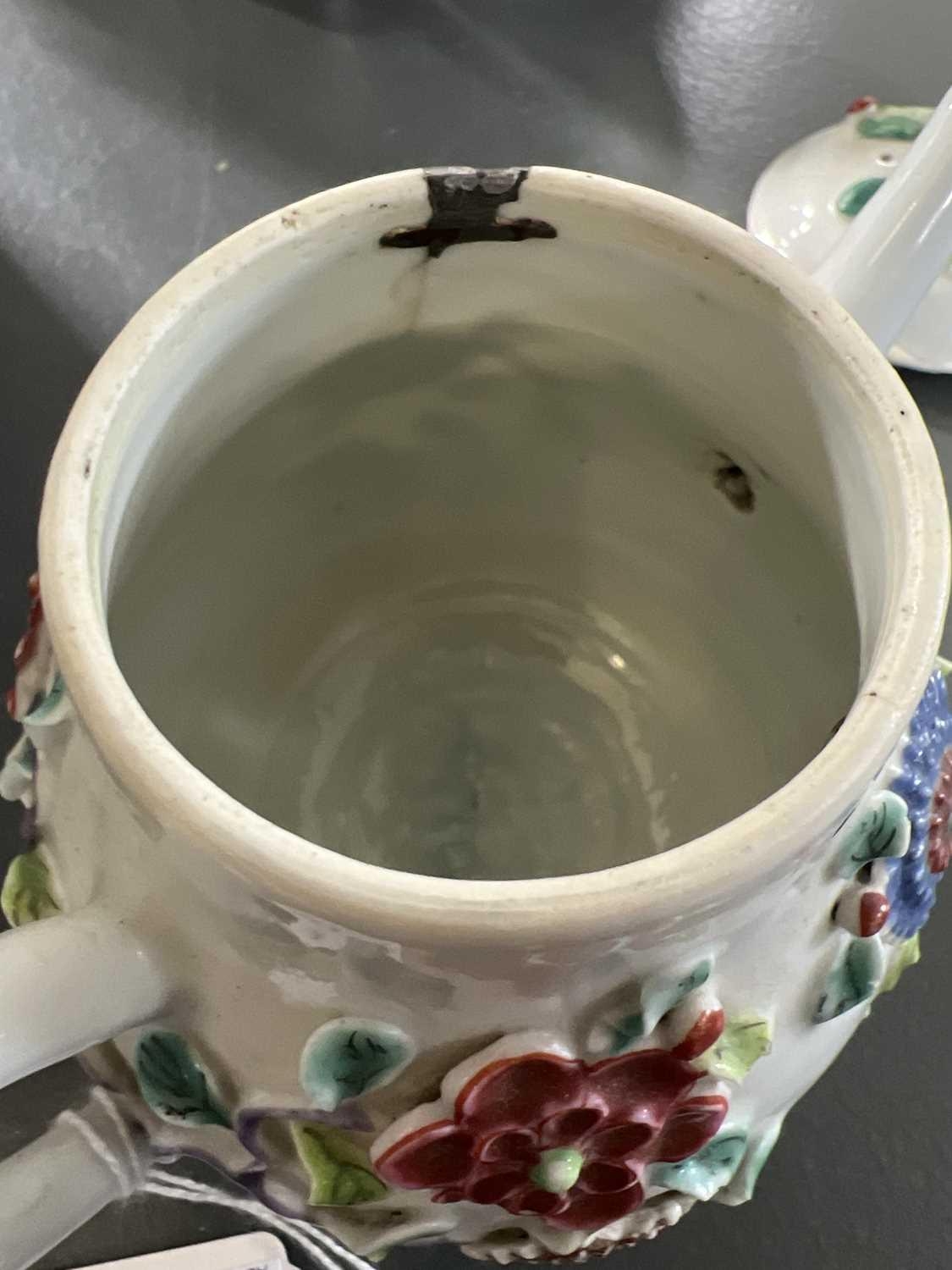 A Chinese porcelain teapot, mid 18th century. .With applied floral and leaf decoration, height 12cm, length 16cm, depth 9.5cm. The pot has two hairlines each has a single rivet and one has a lead repair. Various damages to the applied decoration. The lid is damaged and repaired with replaced finial
