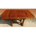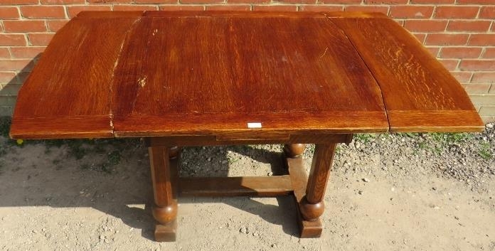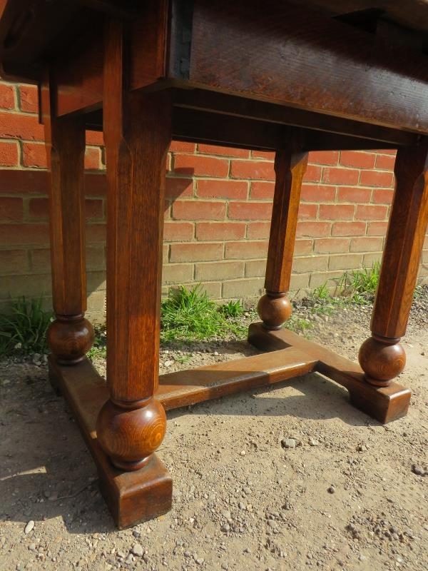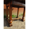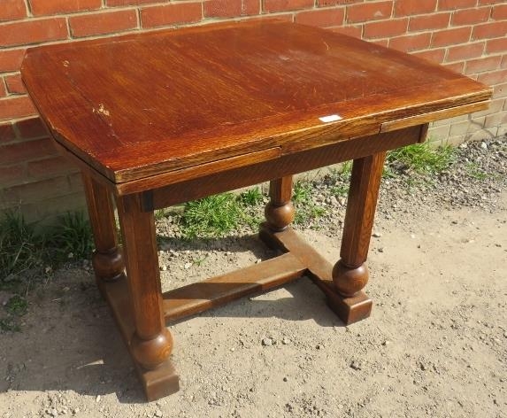 An Art Deco oak draw leaf dining table of small proportions, on octagonal and ball turned supports terminating on block feet with a central stretcher.