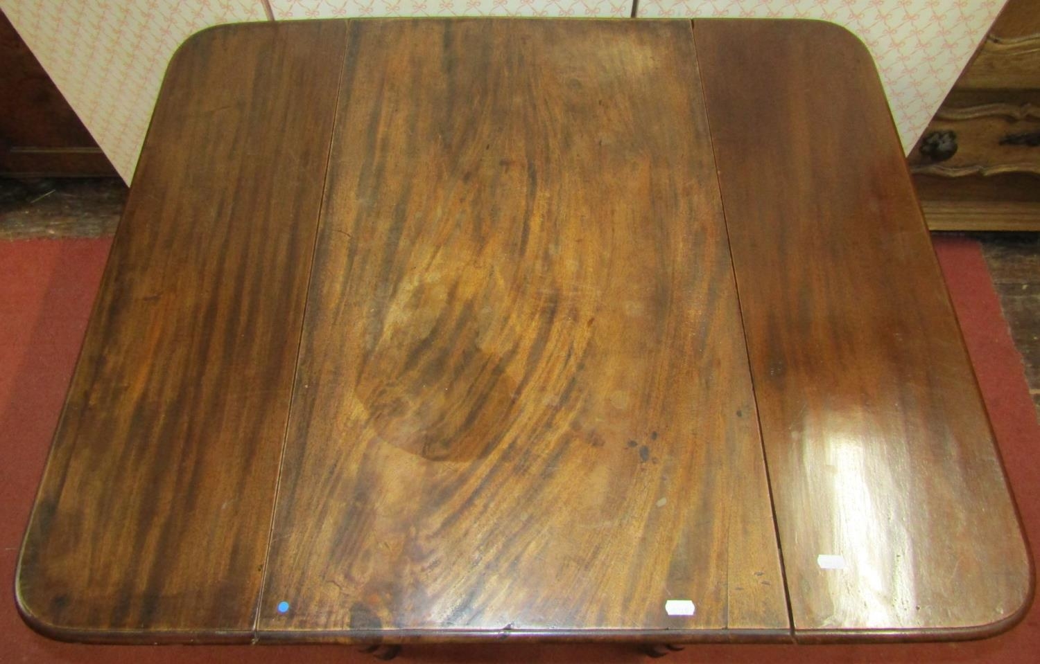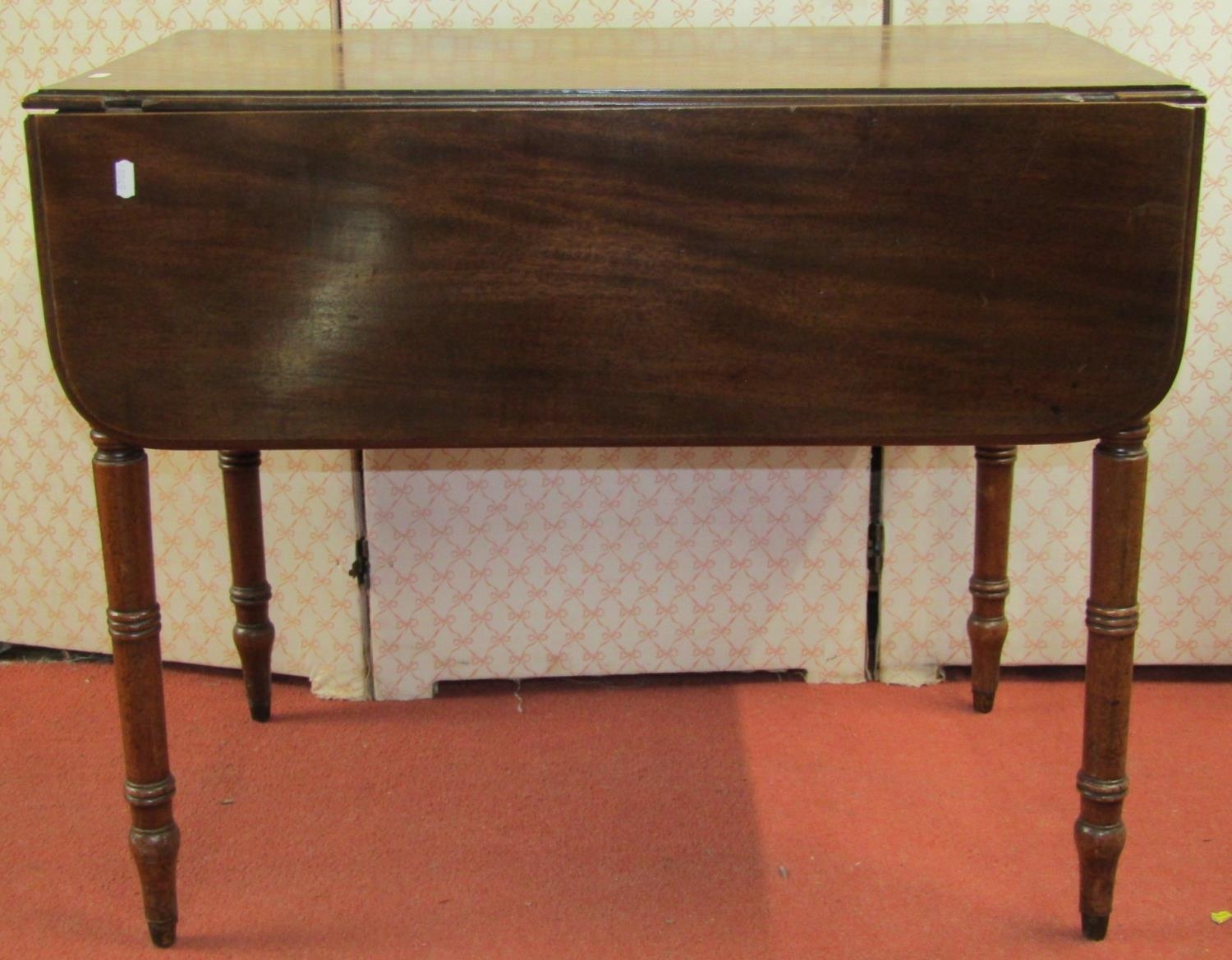 A Georgian mahogany Pembroke table with one real and one dummy drawer, raised on turned supports