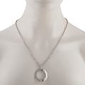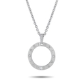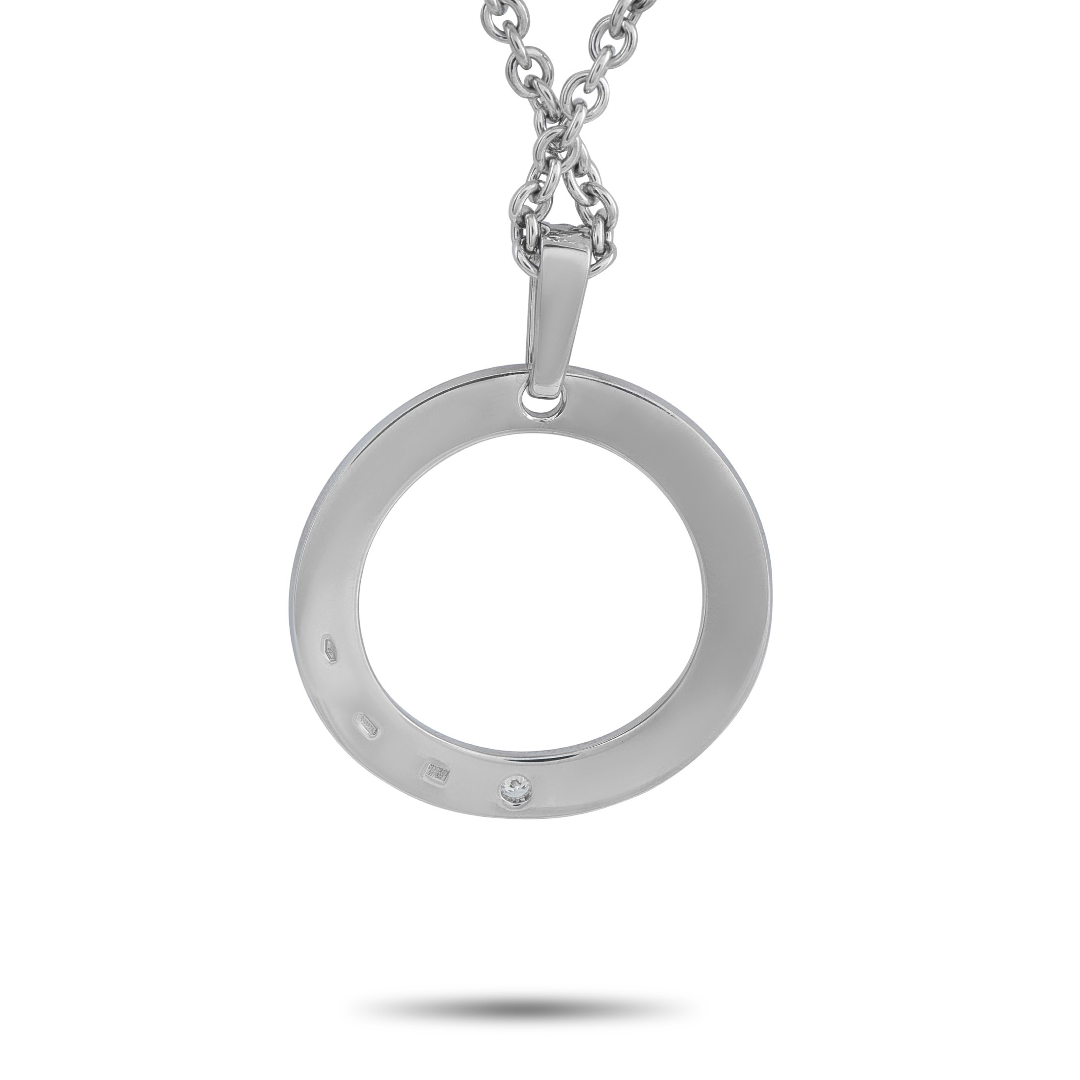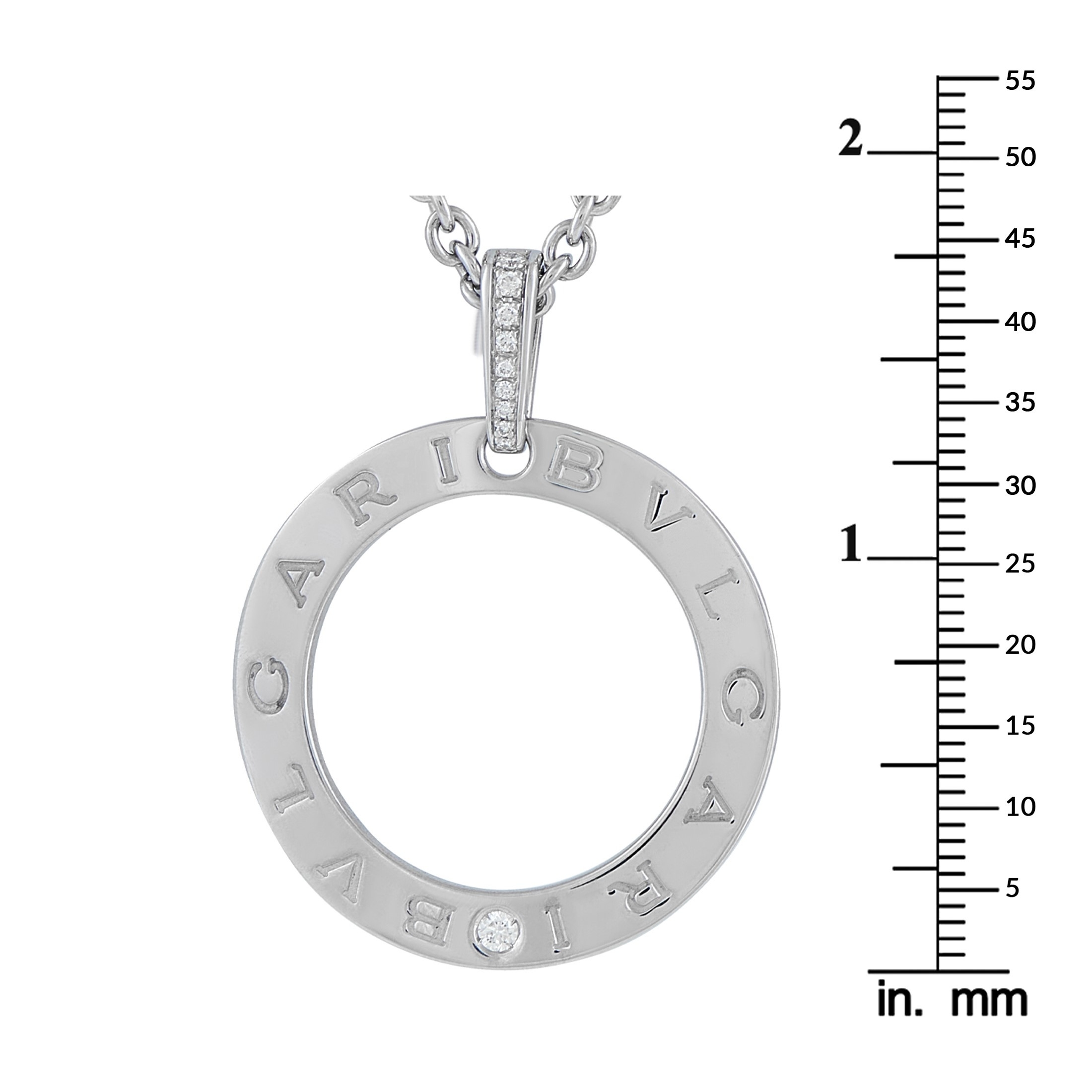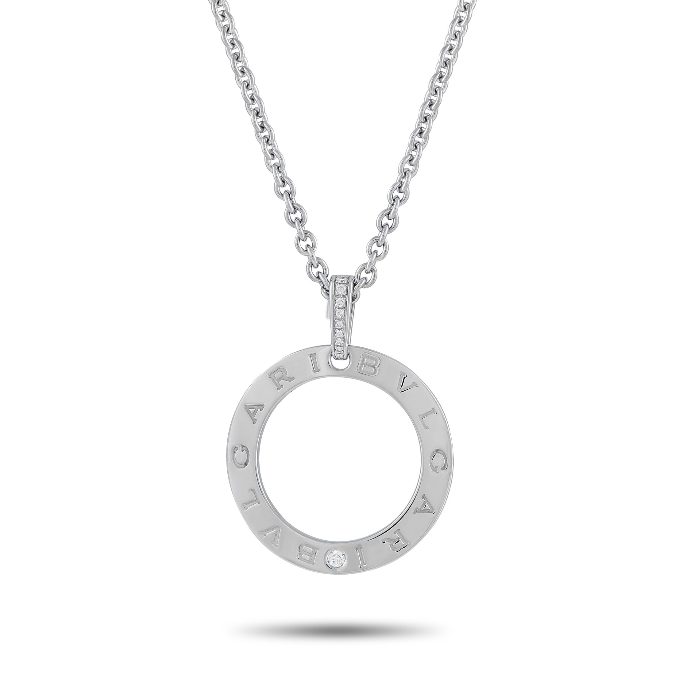 A Bvlgari 18K White Gold Diamond Pendant Necklace. Sparkling Diamonds and the brands name engraved round the perimeter. Crafted from 18K White Gold, the pendant measures 1.75inches long by 1.38 inches wide and is suspended from a 22 inches chain. Good Condition and includes a gift box. Total weight: 35.7 grams. *This item is held at Cadmore USA Office in Pennsylvania, USA and will be shipped from there. Buyers will be responsible for direct shipping payments.*