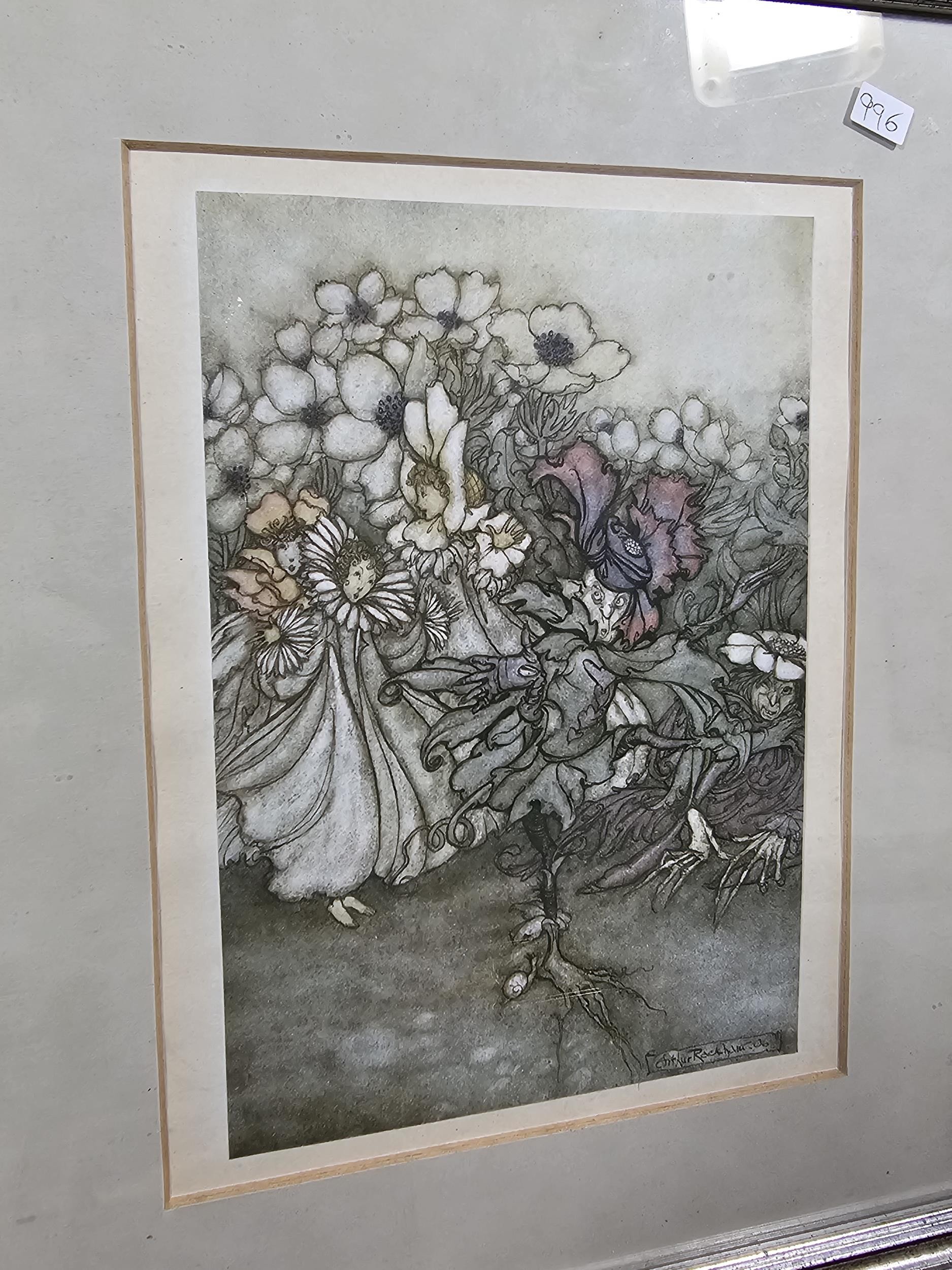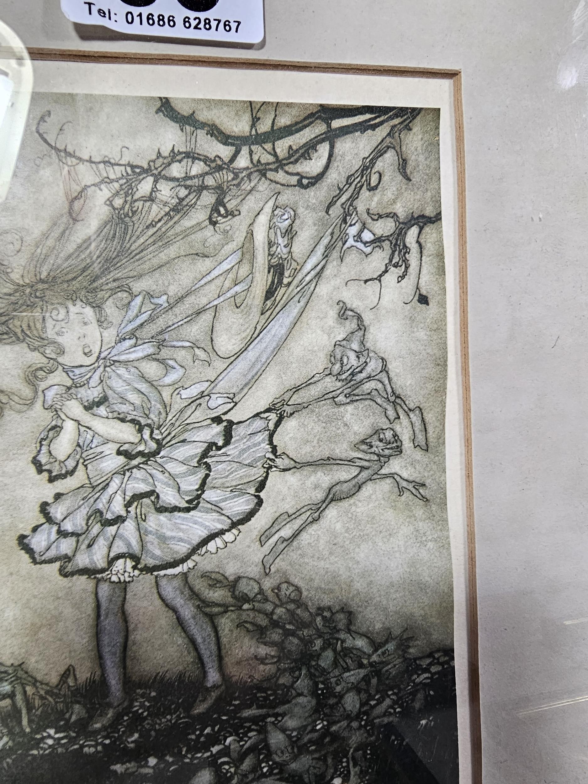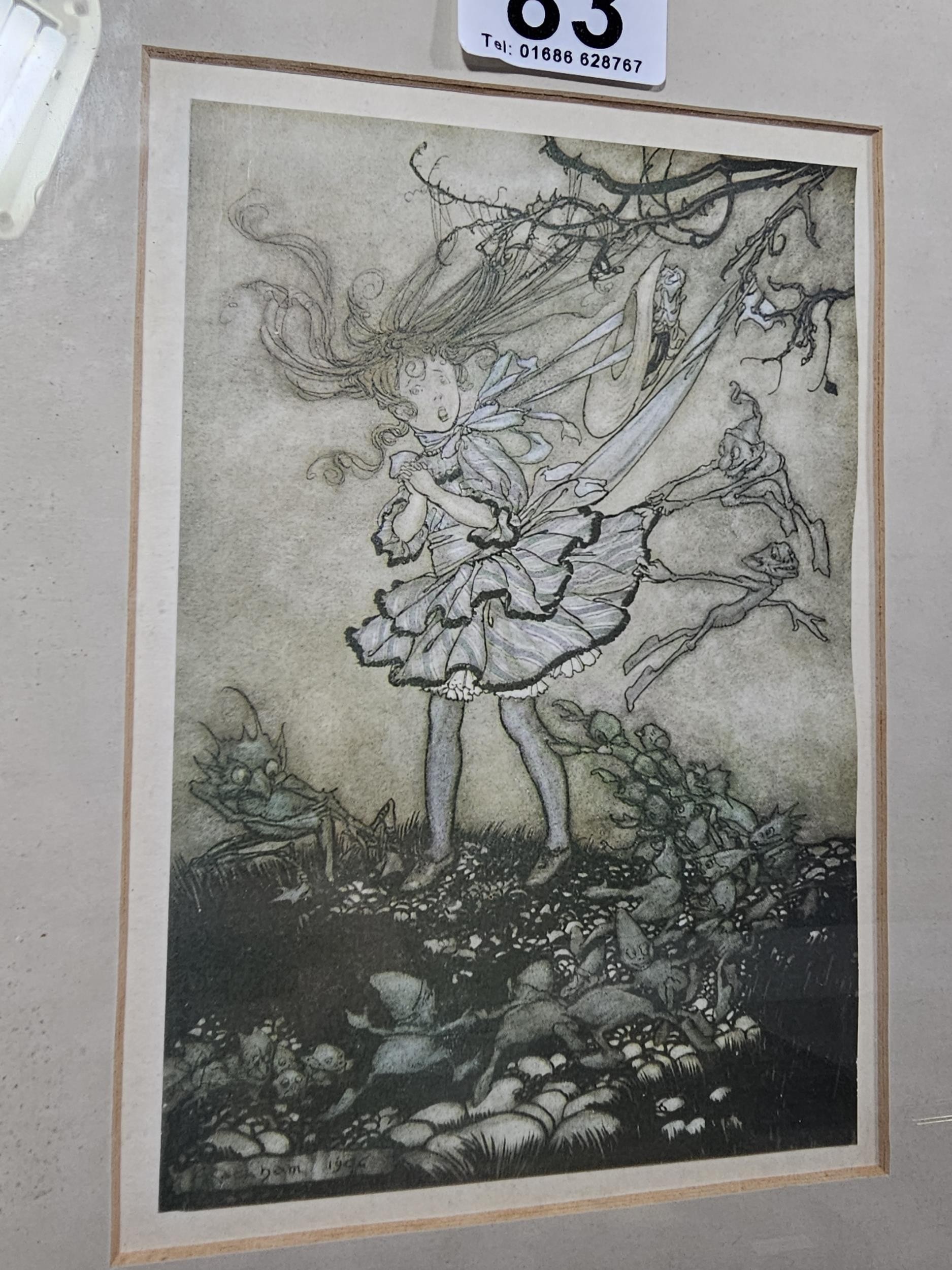 2x Framed and glazed Arthur Rackham prints to include Goblin Market and Peter Pan in Kensington Garden, one print has a minor tare of approx 2mm to the bottom left hand corner, both prints coming away from their mounts, both have the Arthur Rackham name to the bottom right hand corner, also comes with 5 miniature marquetry pictures of cats, the Arthur Rackham frames measure 29cm high by 24cm wide