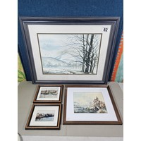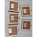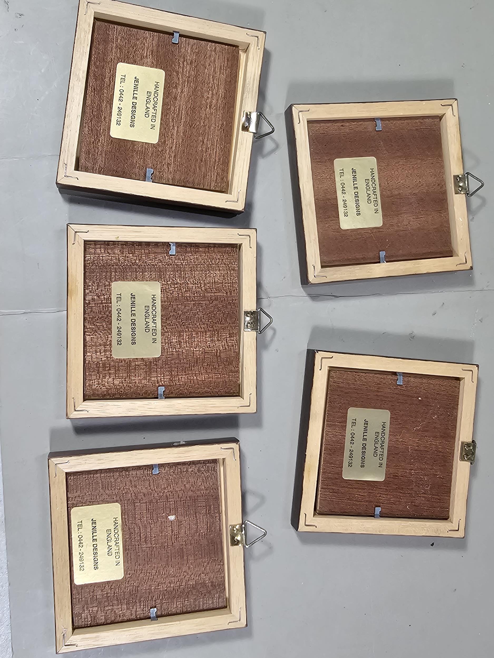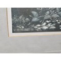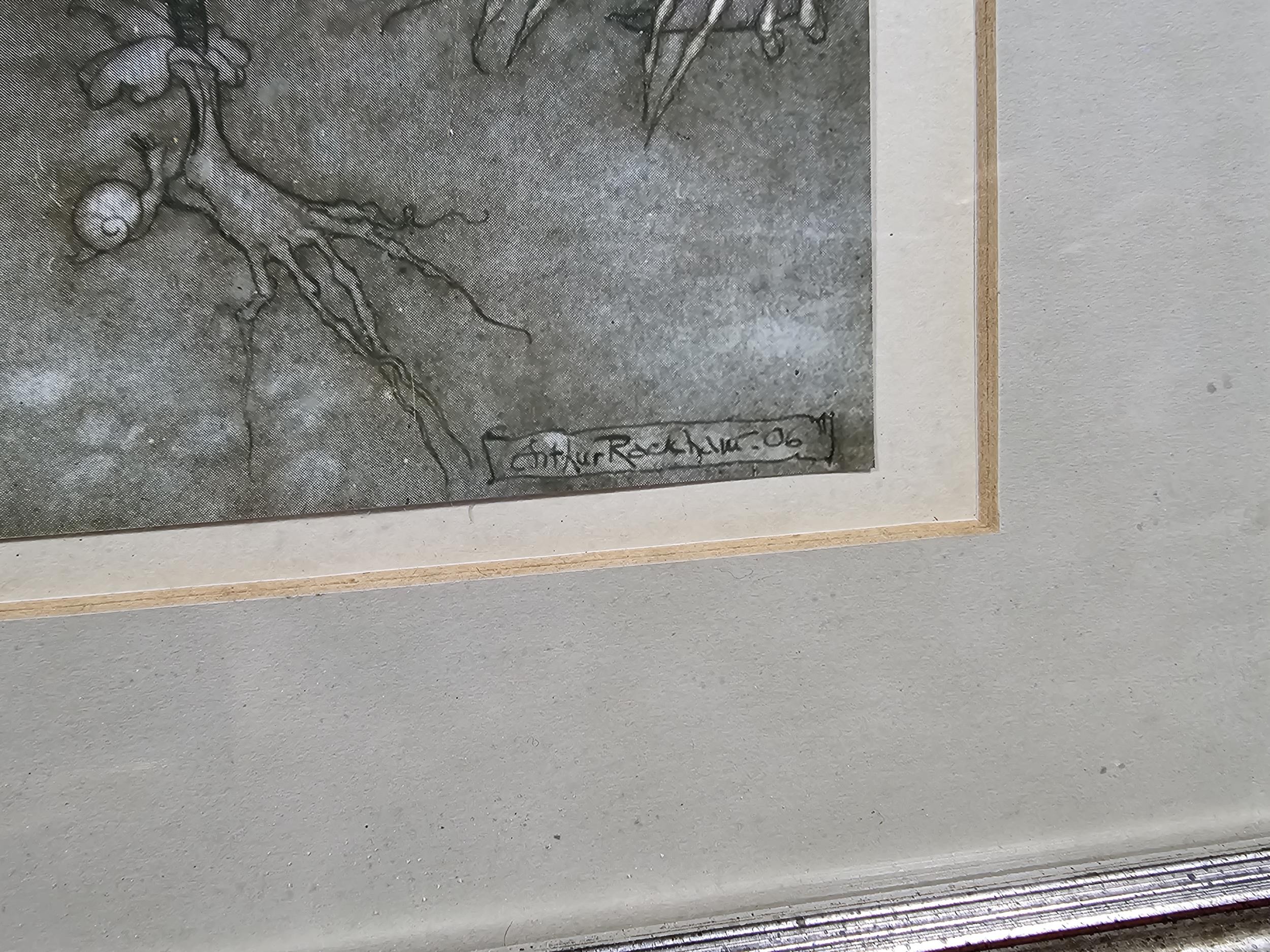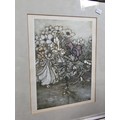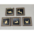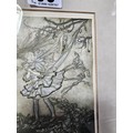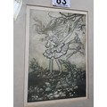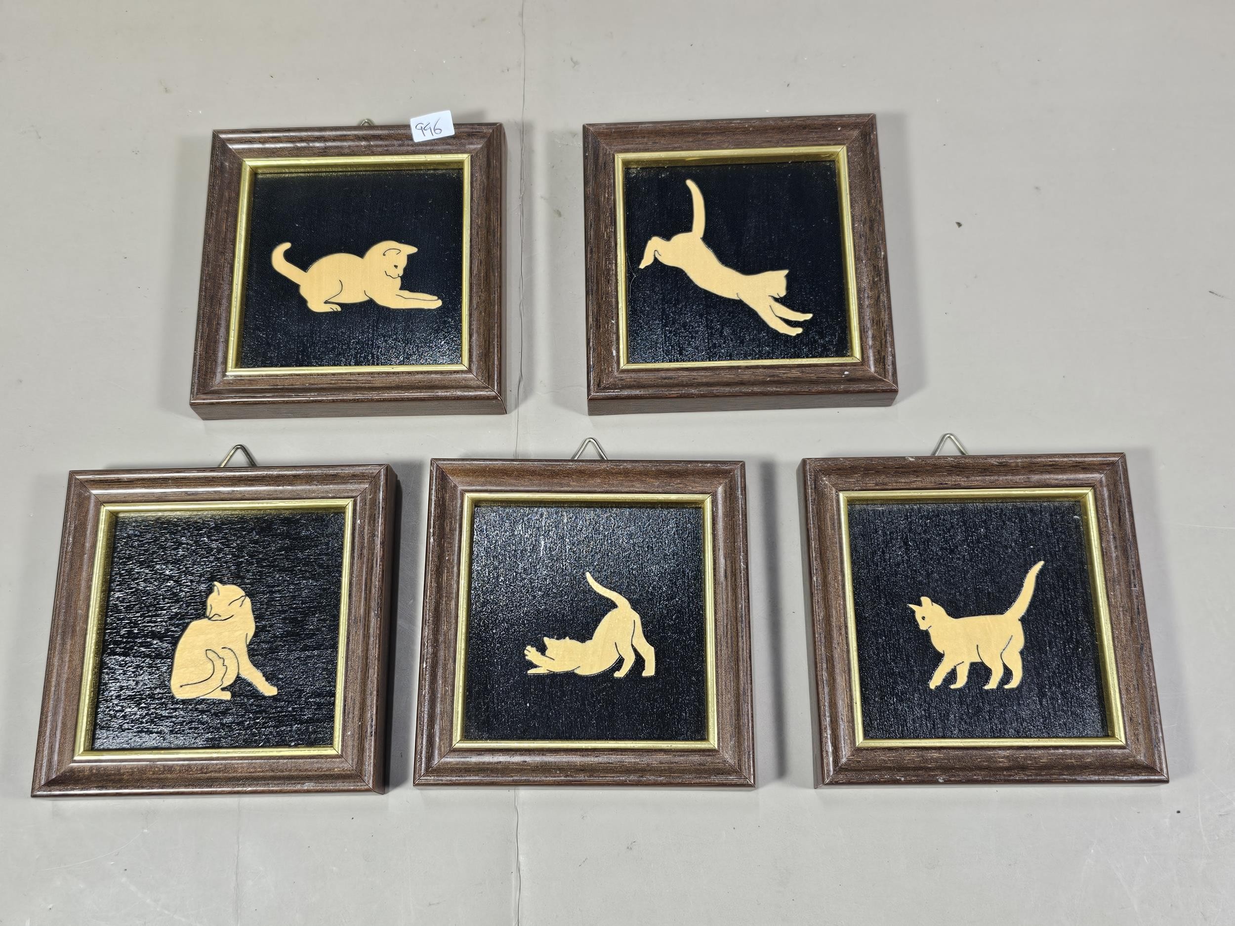 2x Framed and glazed Arthur Rackham prints to include Goblin Market and Peter Pan in Kensington Garden, one print has a minor tare of approx 2mm to the bottom left hand corner, both prints coming away from their mounts, both have the Arthur Rackham name to the bottom right hand corner, also comes with 5 miniature marquetry pictures of cats, the Arthur Rackham frames measure 29cm high by 24cm wide