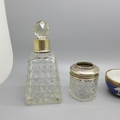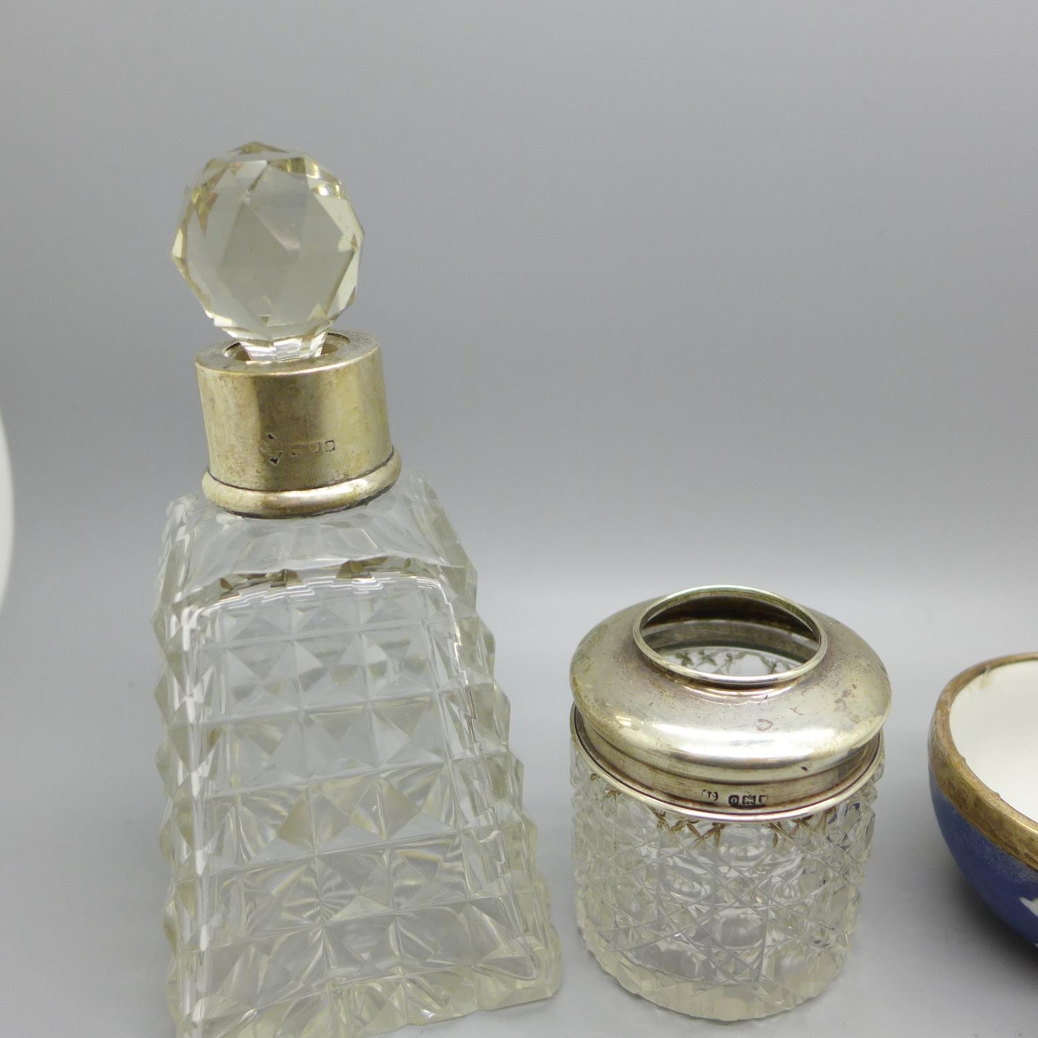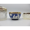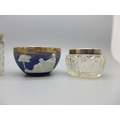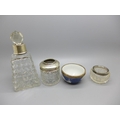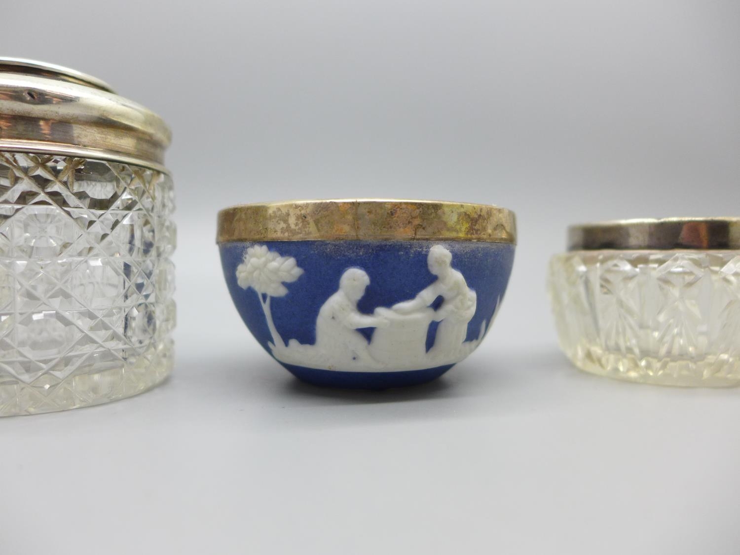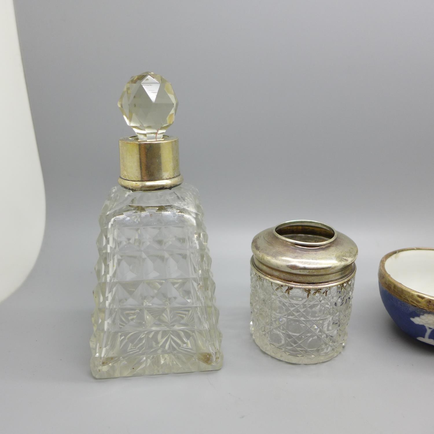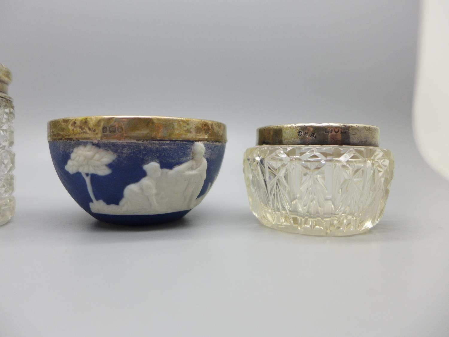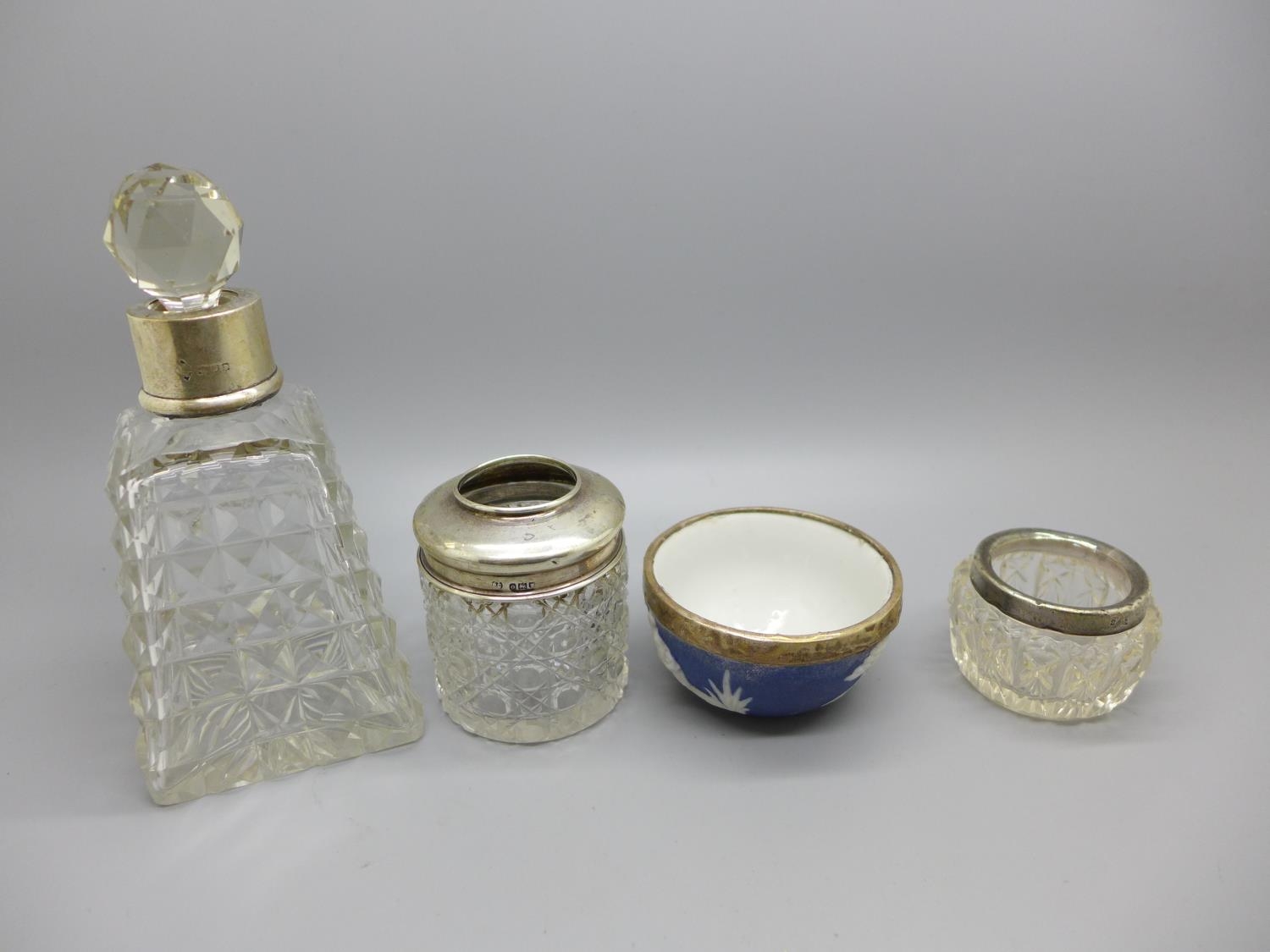 Four silver mounted items, a cut glass salt, a bottle. hair tidy and bowl