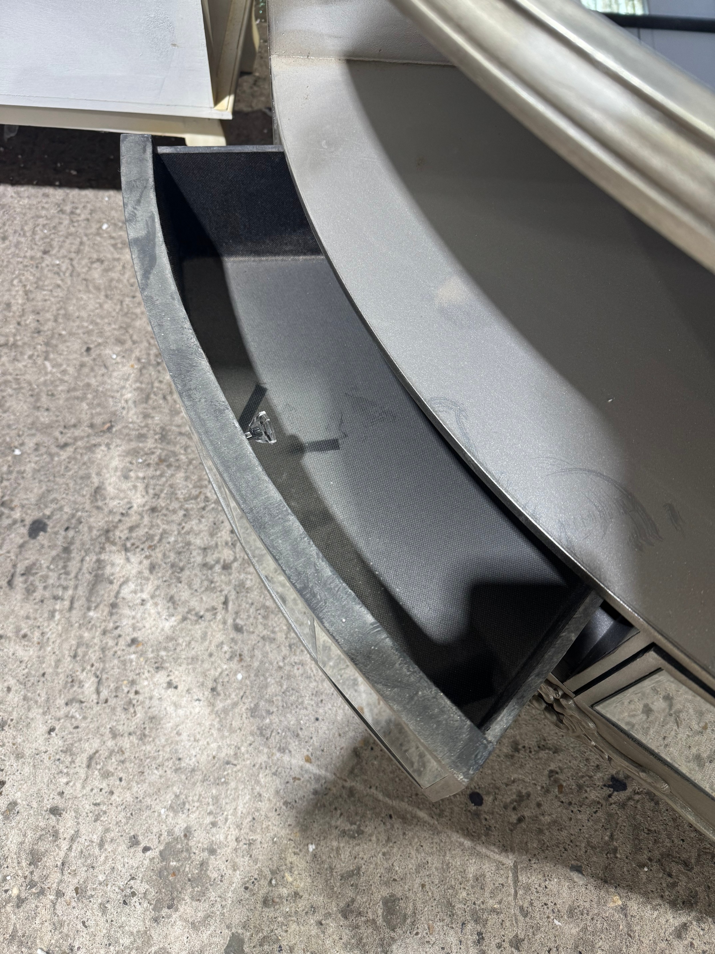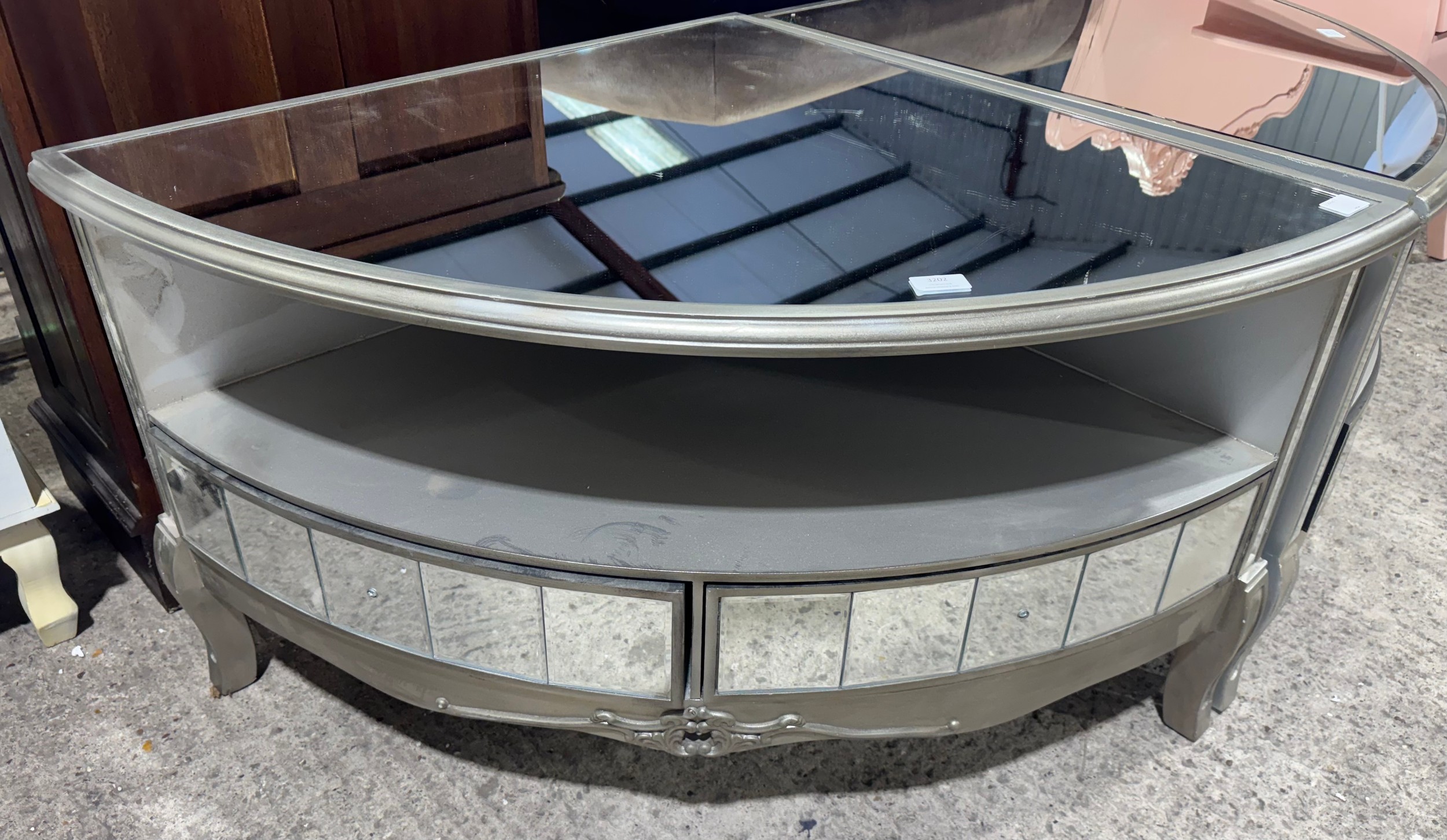 Three mirrored two drawer corner media units (marked/damaged)