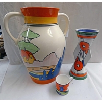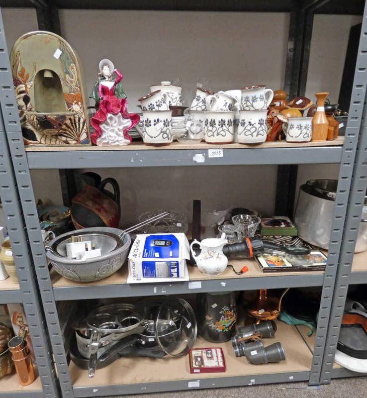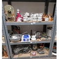 SELECTION OF VARIOUS ITEMS INCLUDING CRYSTAL BOWLS, DECORATIVE TURNED WOODEN ITEMS, TEA SETS AND OTHERS OVER THREE SHELVES