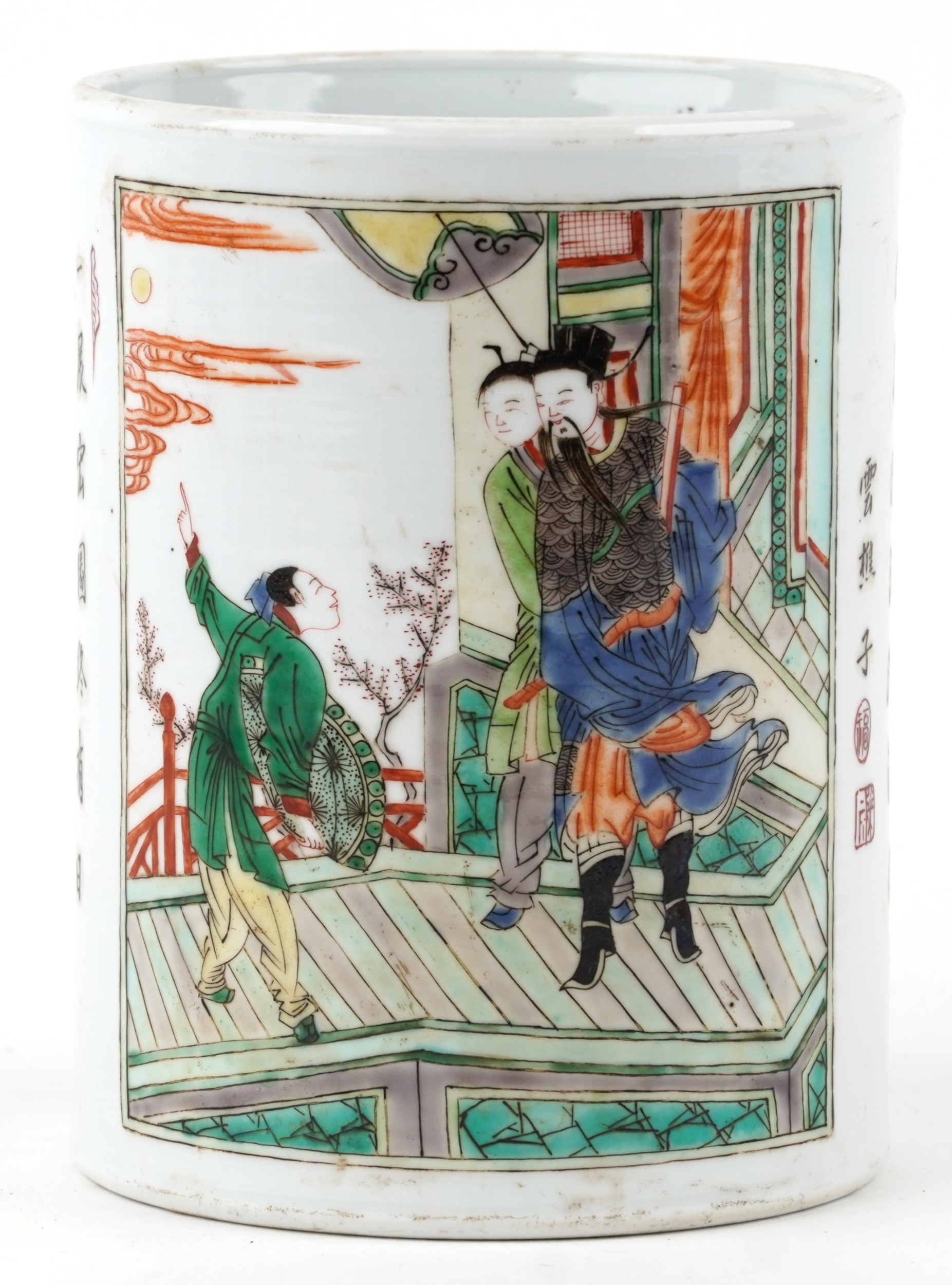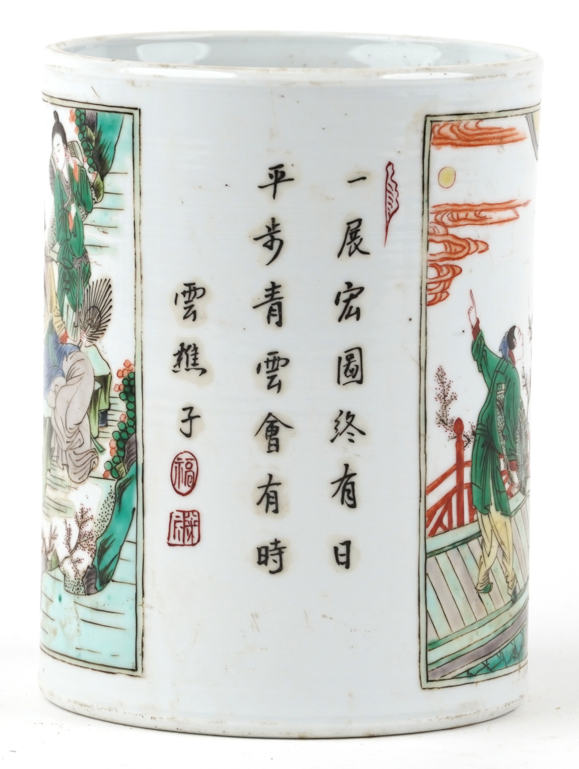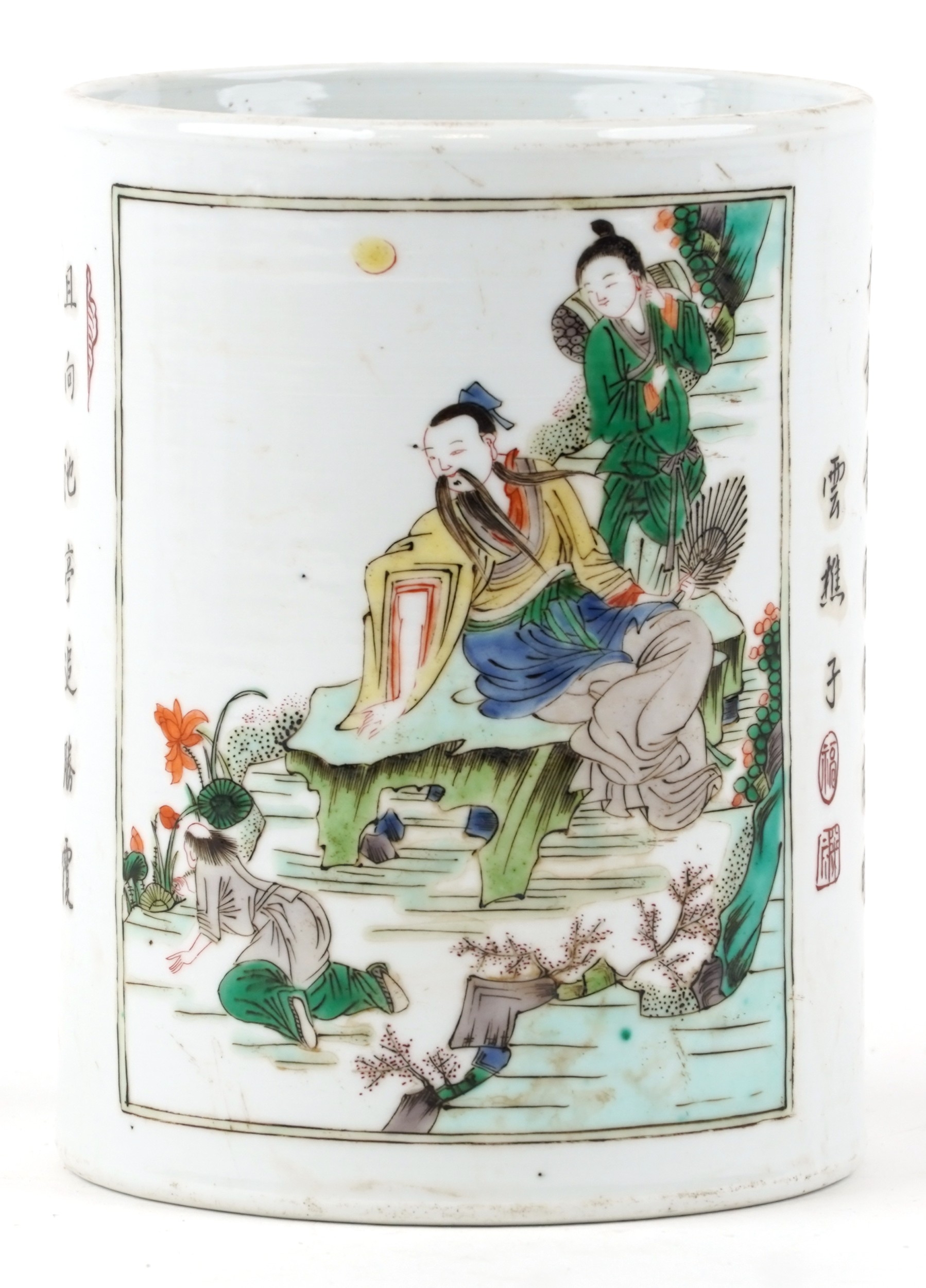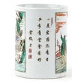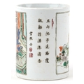 A Chinese porcelain vase hand painted in the famille verte palette with inscriptions and panels of an emperor, 15.5cm high x 12cm in diameter.