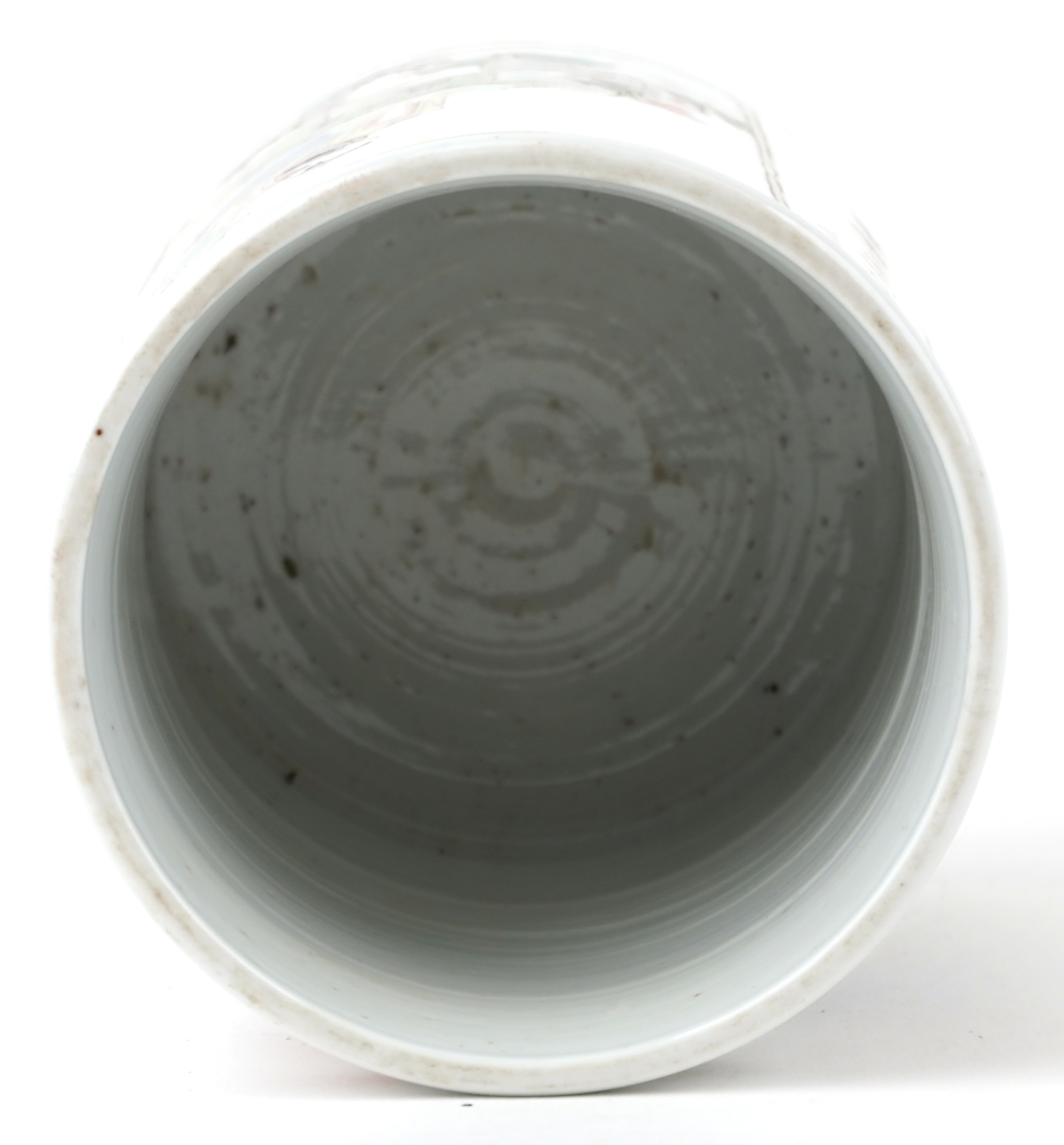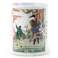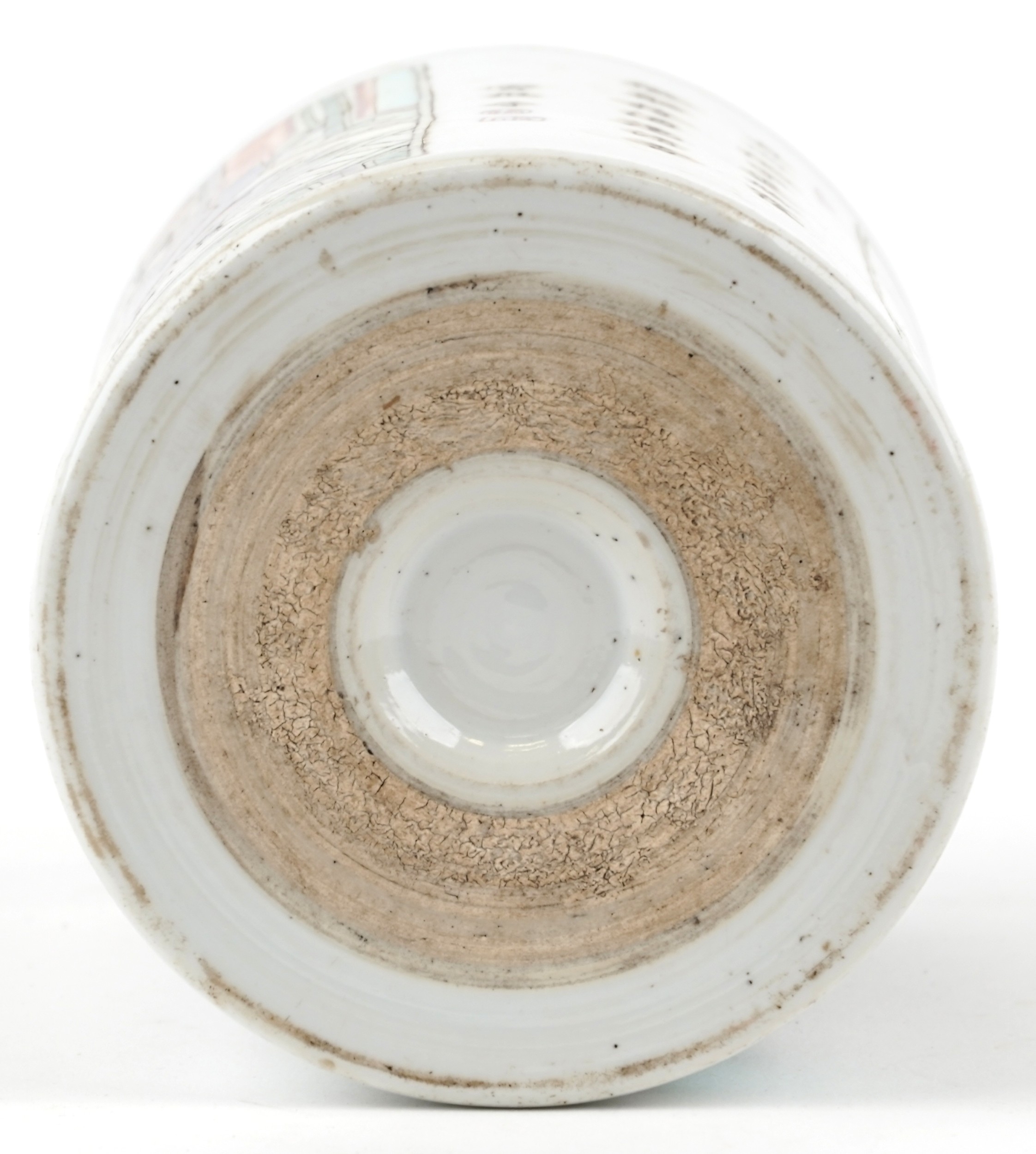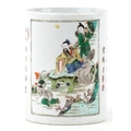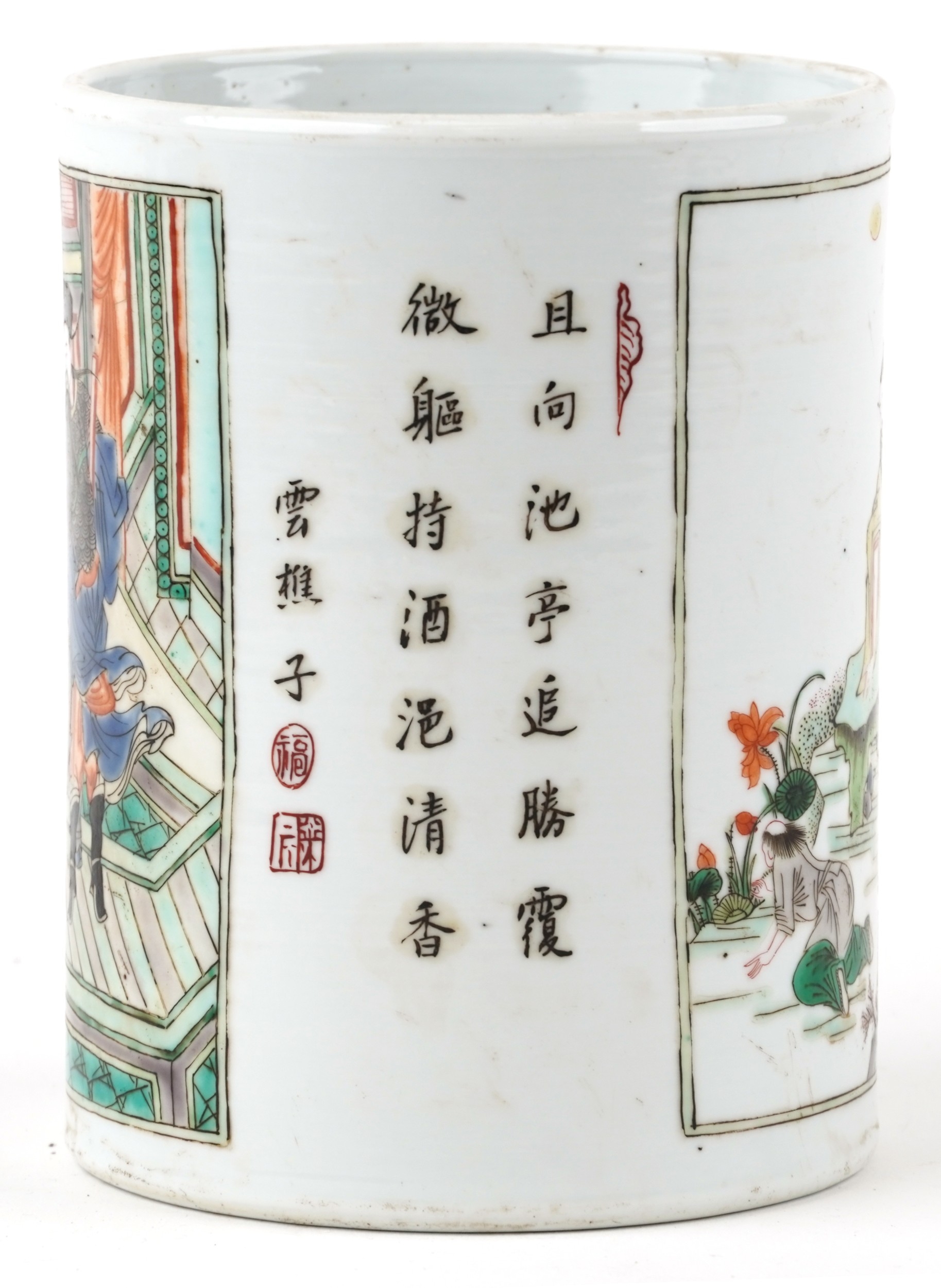 A Chinese porcelain vase hand painted in the famille verte palette with inscriptions and panels of an emperor, 15.5cm high x 12cm in diameter.