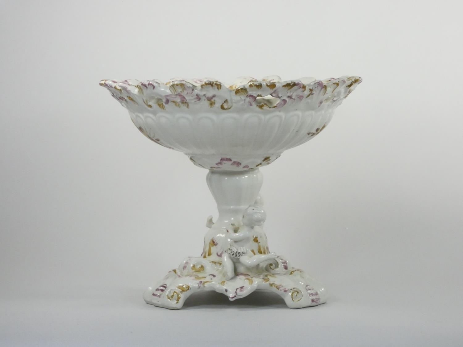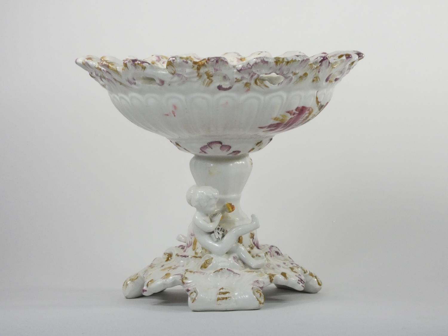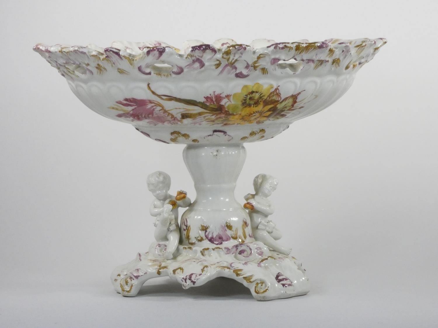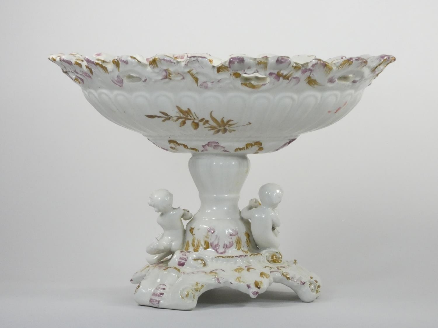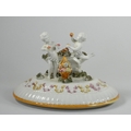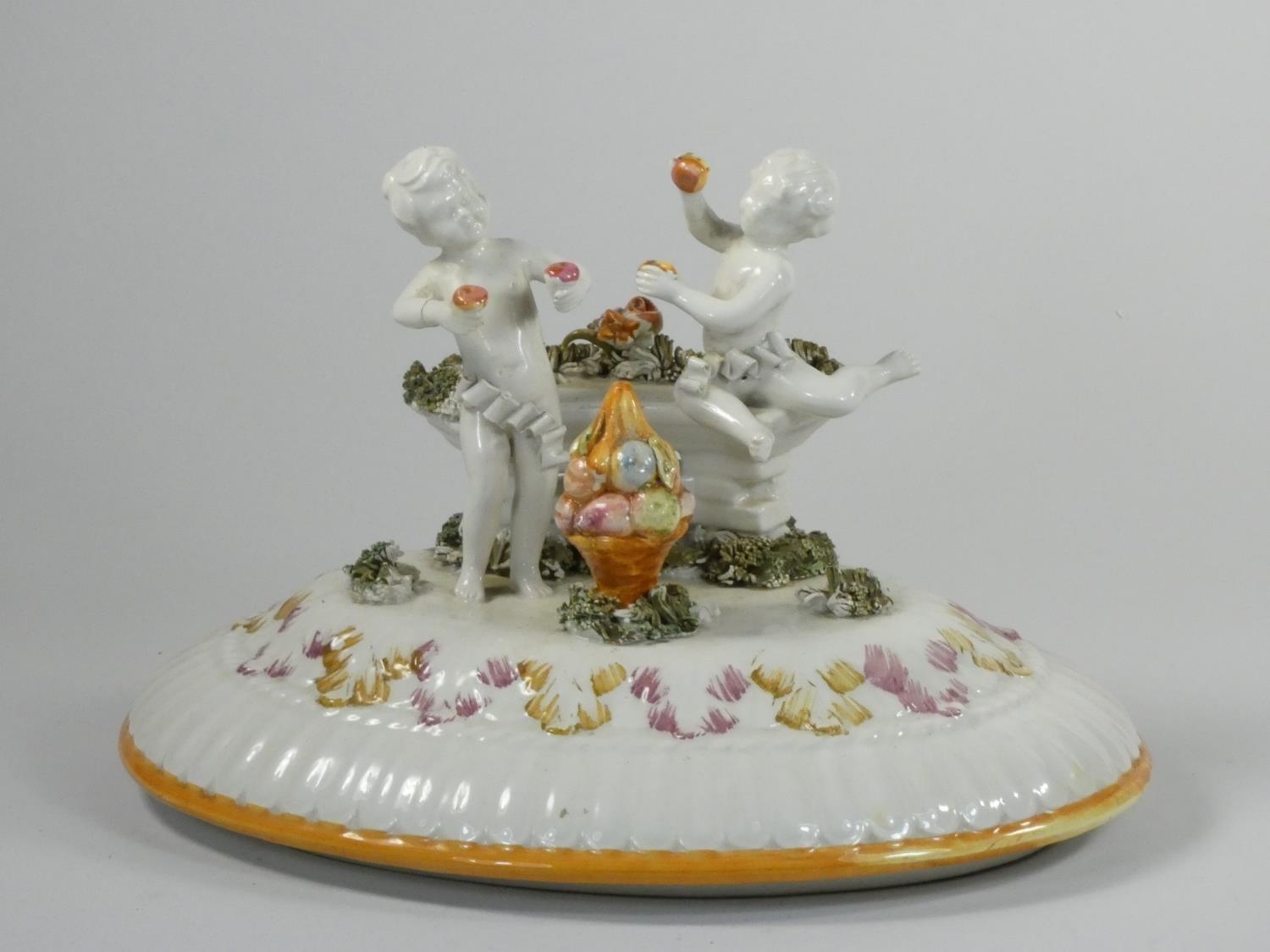 A 19th century continental pedestal dish, the lift off cover with two cherubs and fruit, similar pedestal base, height 36 cm.