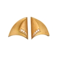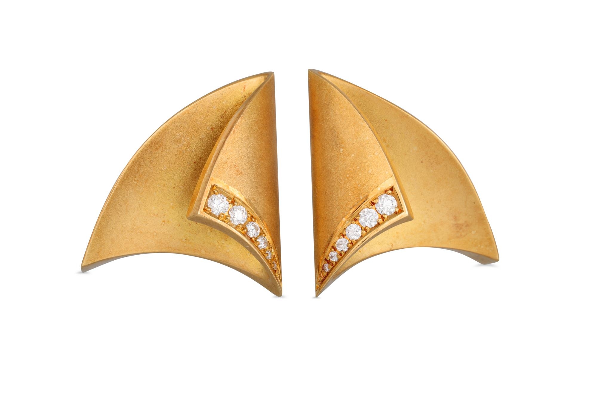 A PAIR OF CONTEMPORARY 18CT BRUSHED GOLD EARRINGS, shaped form, diamond set, 21.7 g. Estimated: weight of diamonds: 1.00 ct.