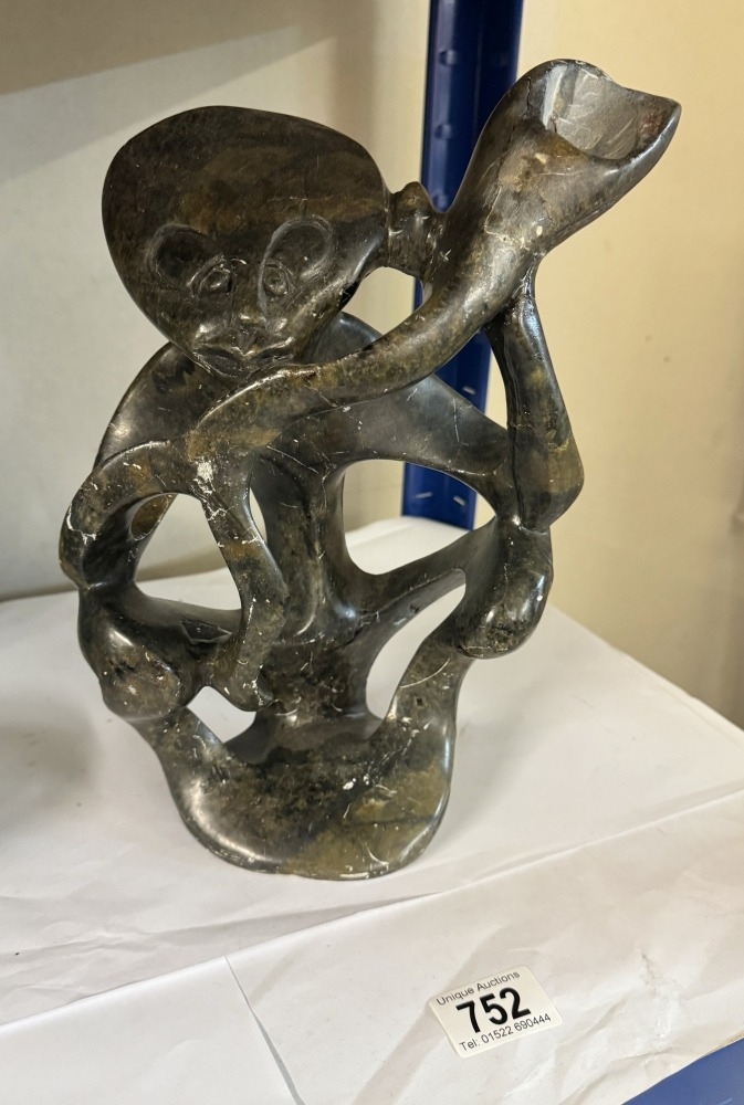 An unusual shaped soapstone carving, a/f.