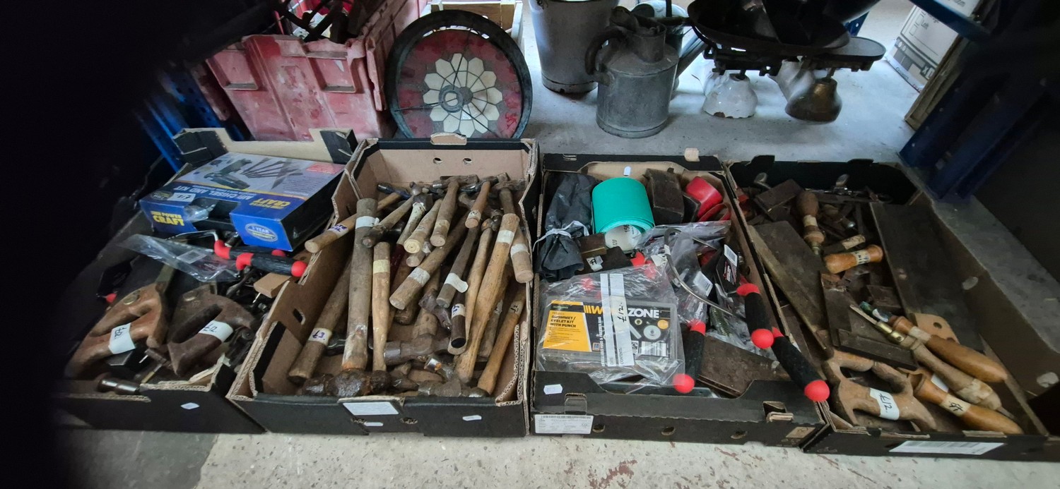 4 boxes of tools to include saws, hammers, trowels, gauging trowel, etc