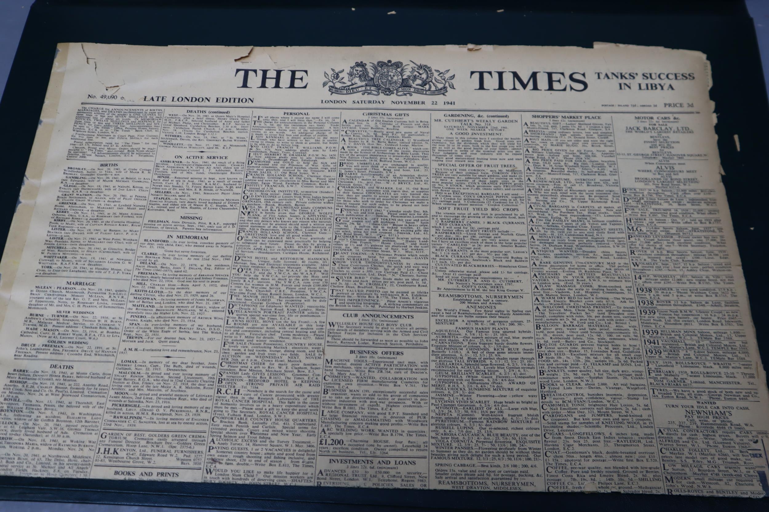 1941 The Times Newspaper together with a Selection of Old Photographs and Postcards. Presented To Doris on her 60th Birthday