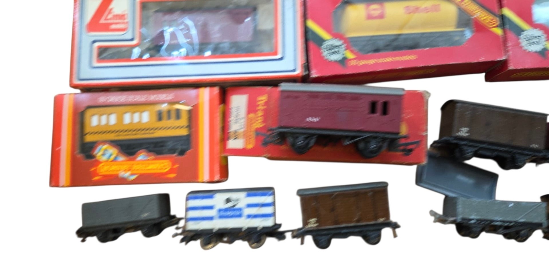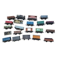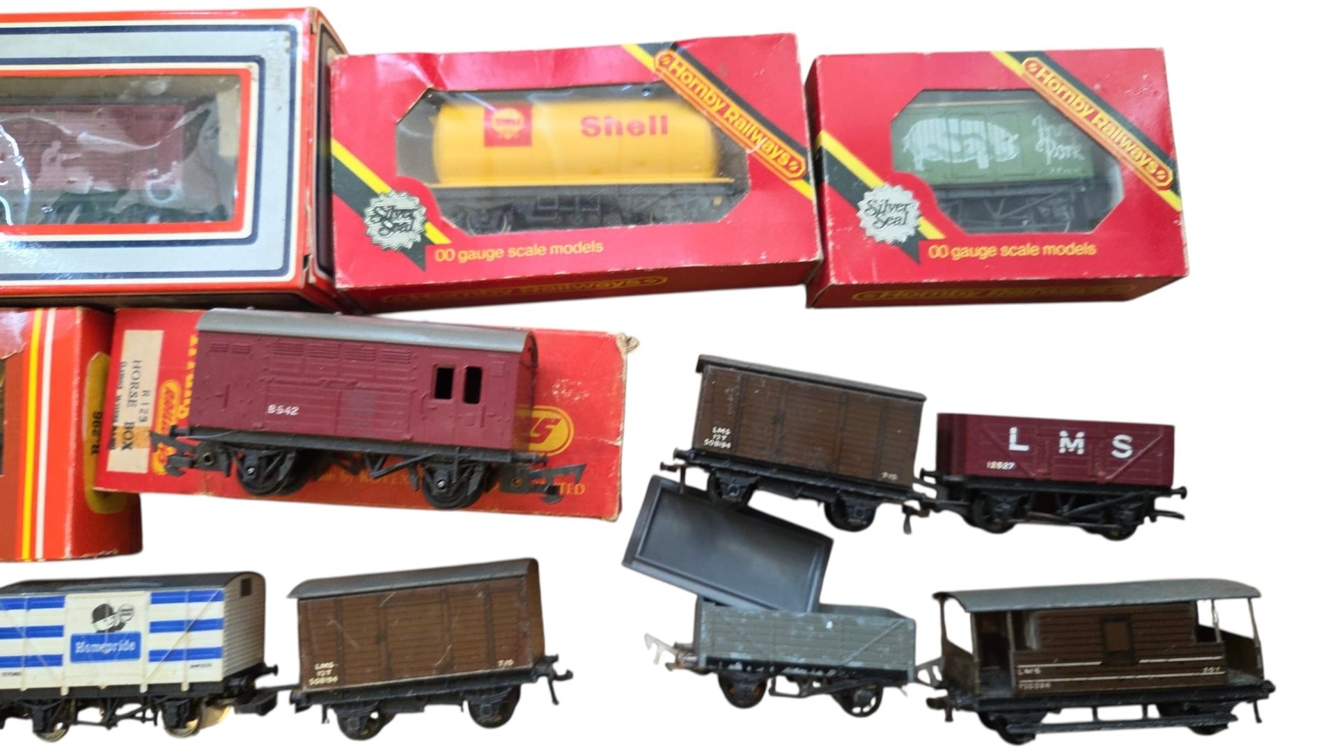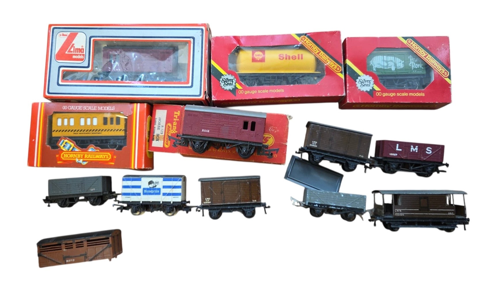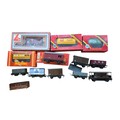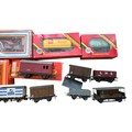 A group of OO gauge model railway rolling stock, including Hornby Railways and Lima boxed wagons and a Tri-ang Hornby Dublo horse box, with various loose open wagons and a brake van.